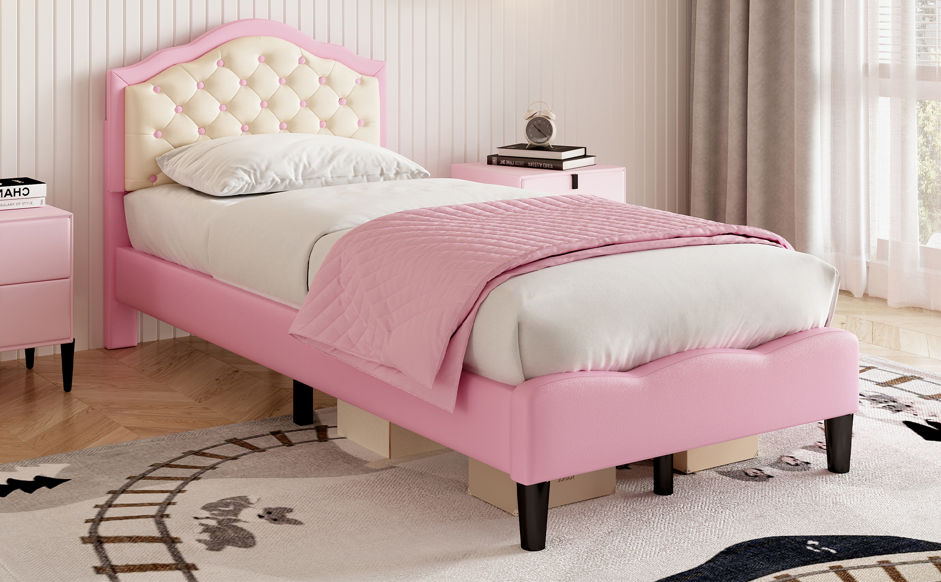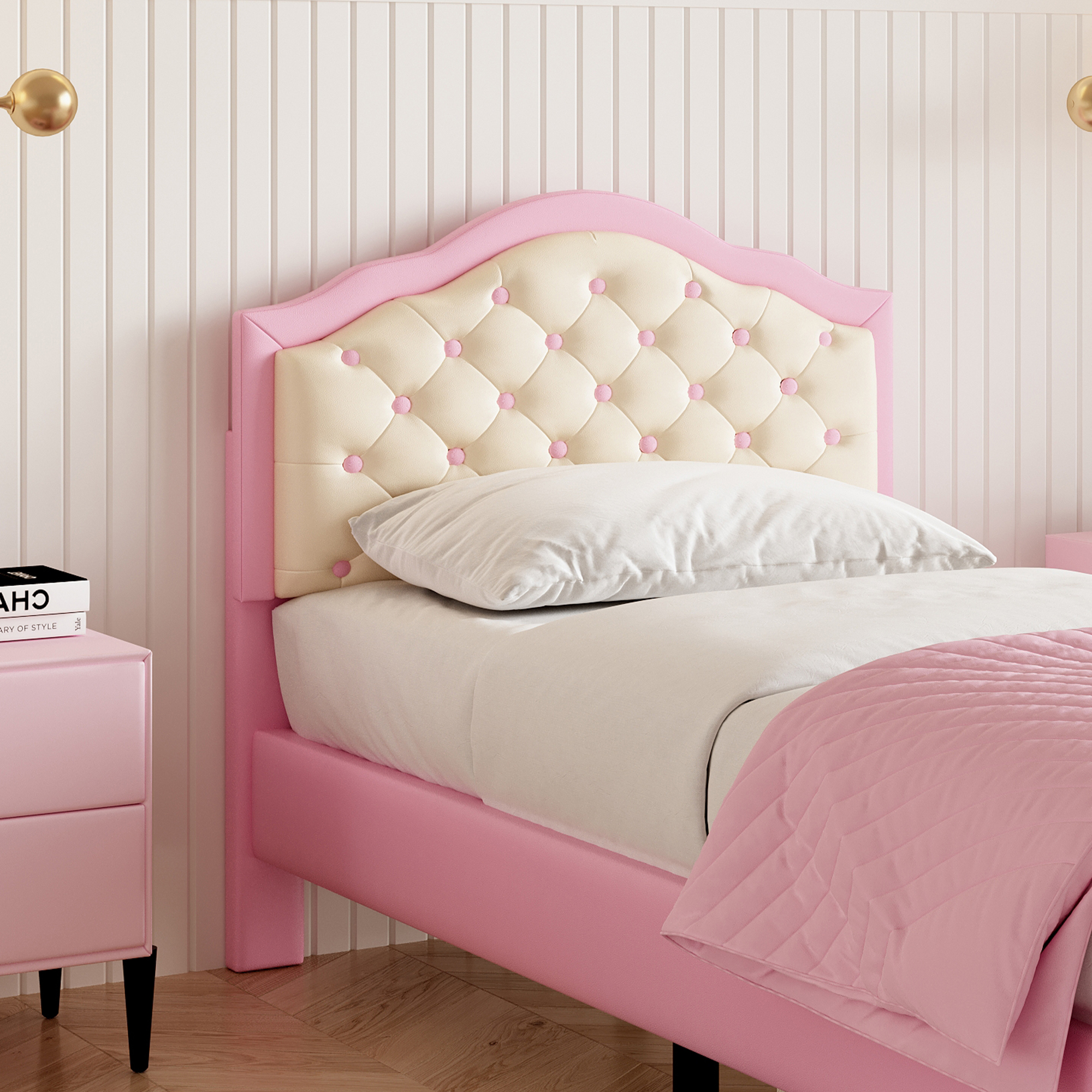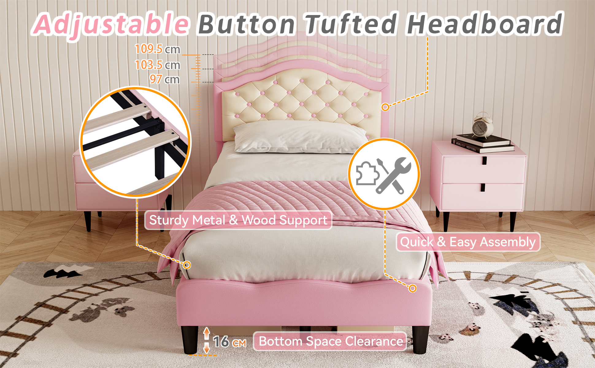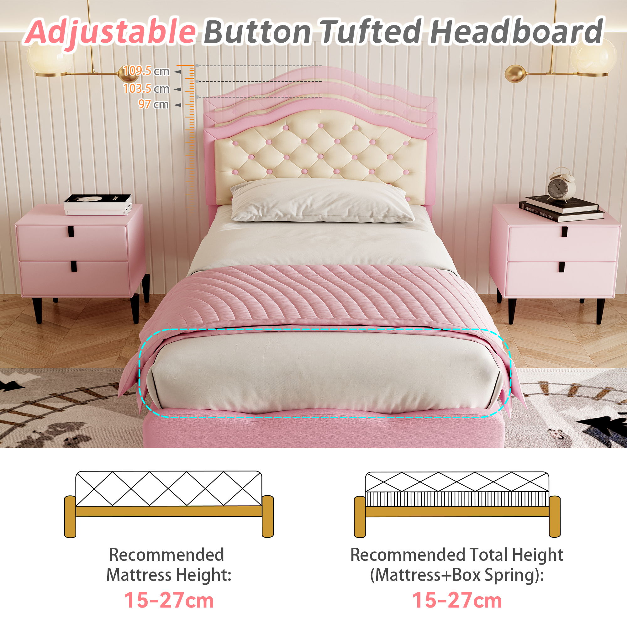 Product Name:3ft Single Upholstered Bed Frame with Adjustable Chic Button-Tufted Headboard, PU Faux Leather Bed Frame with Solid Wood Slat, No Box Spring Needed, Easy Assembly, Pink+Beige (No Mattress)