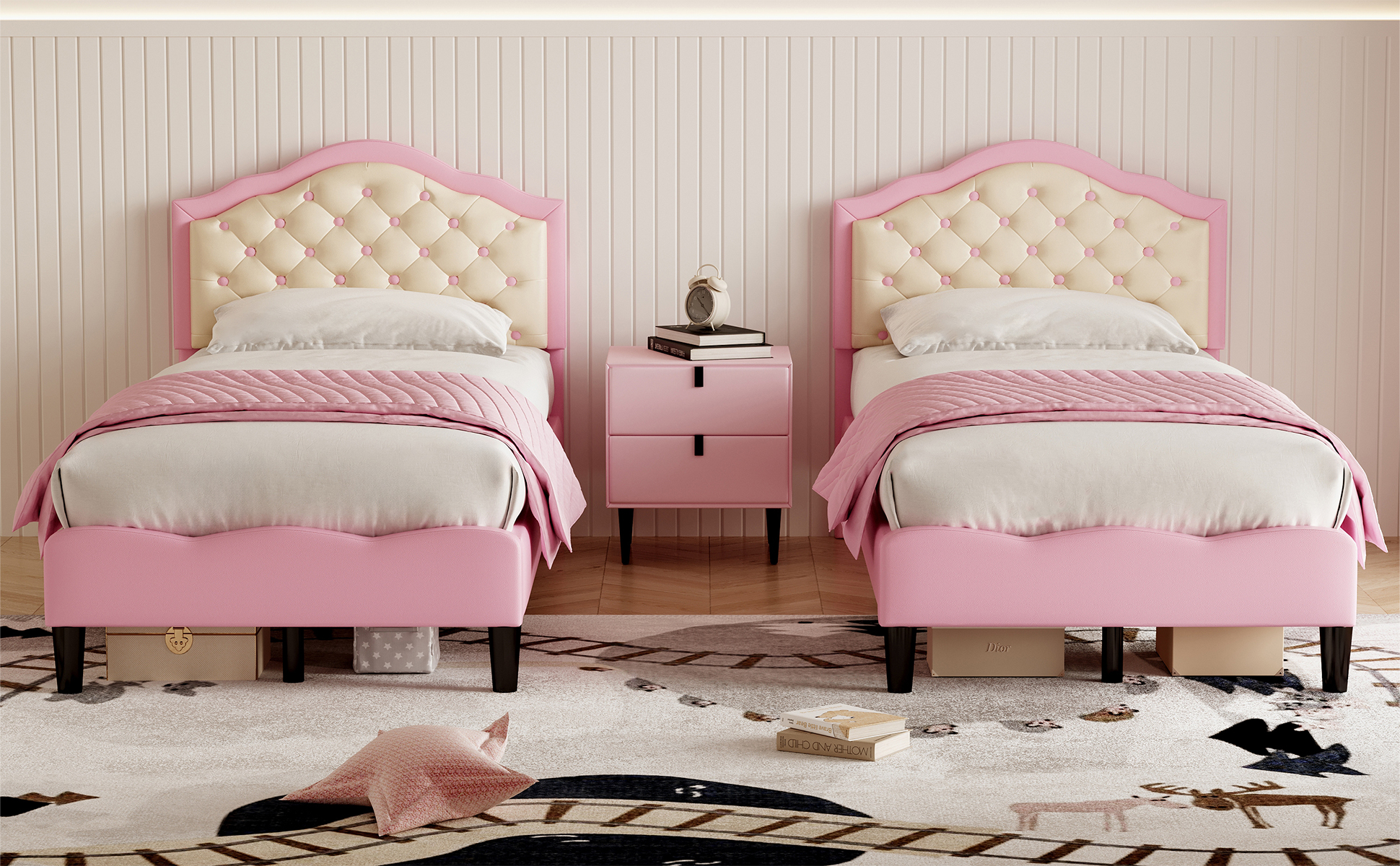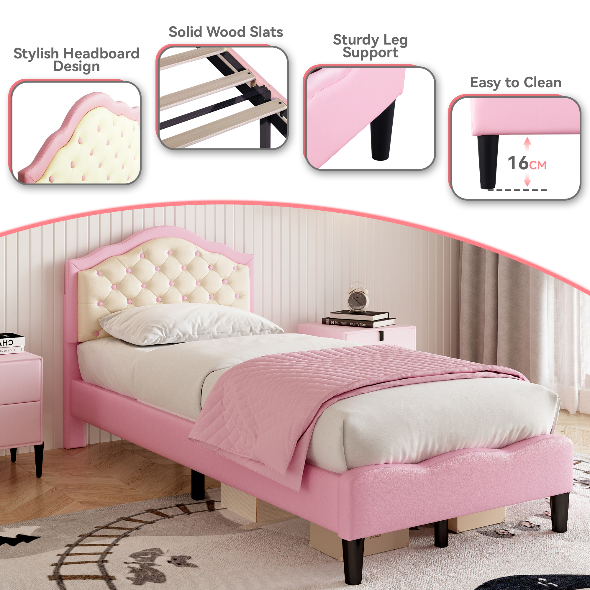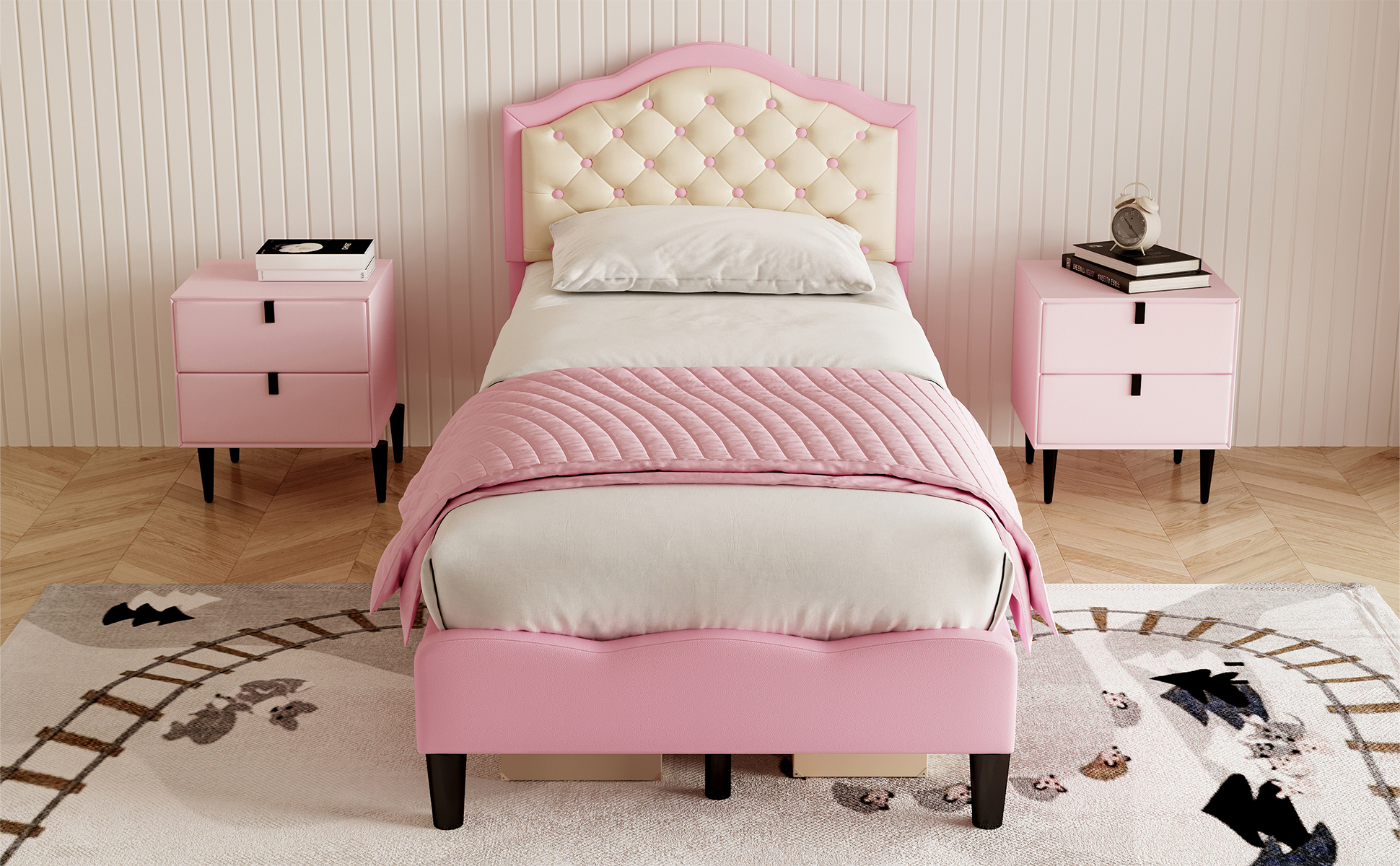 Product Name:3ft Single Upholstered Bed Frame with Adjustable Chic Button-Tufted Headboard, PU Faux Leather Bed Frame with Solid Wood Slat, No Box Spring Needed, Easy Assembly, Pink+Beige (No Mattress)