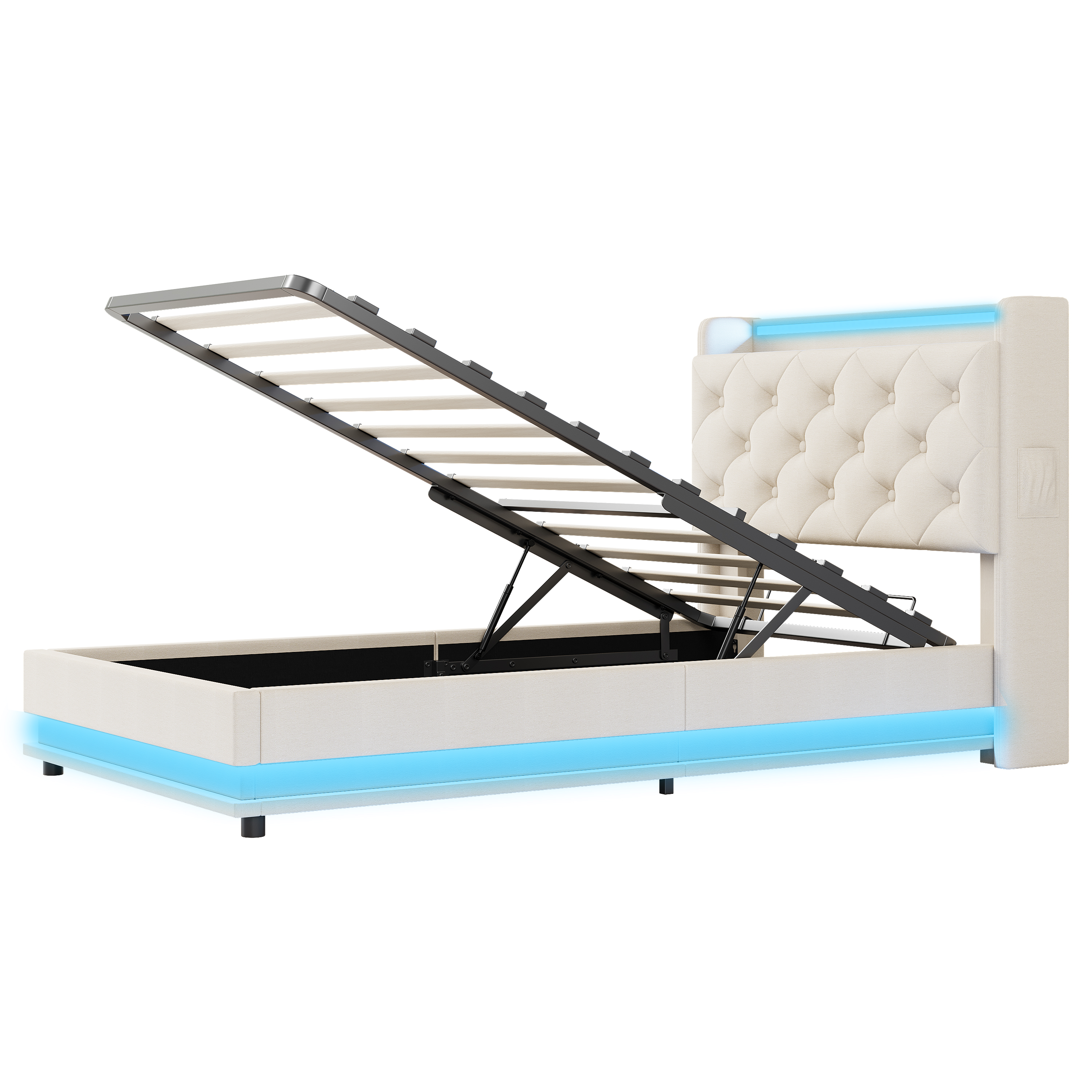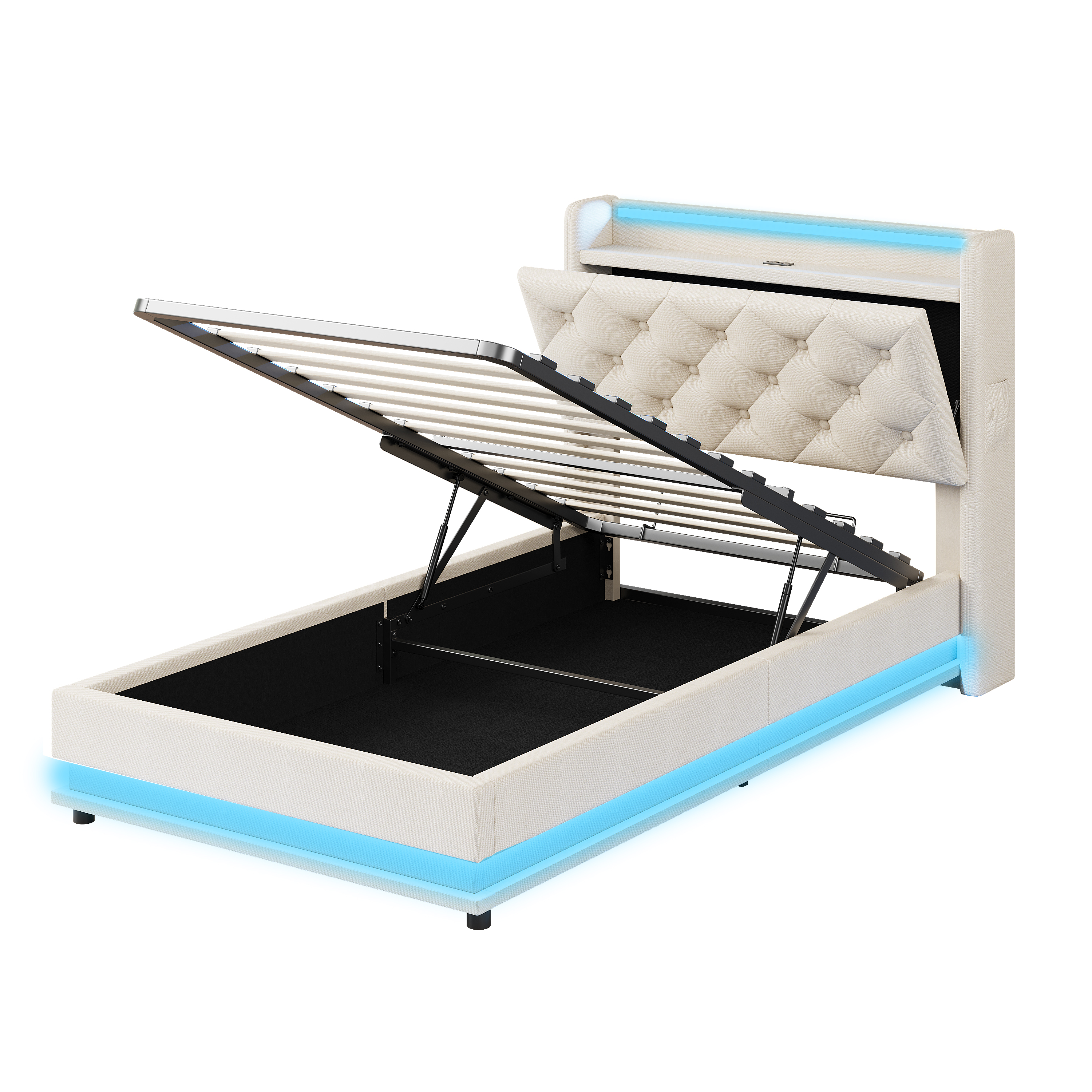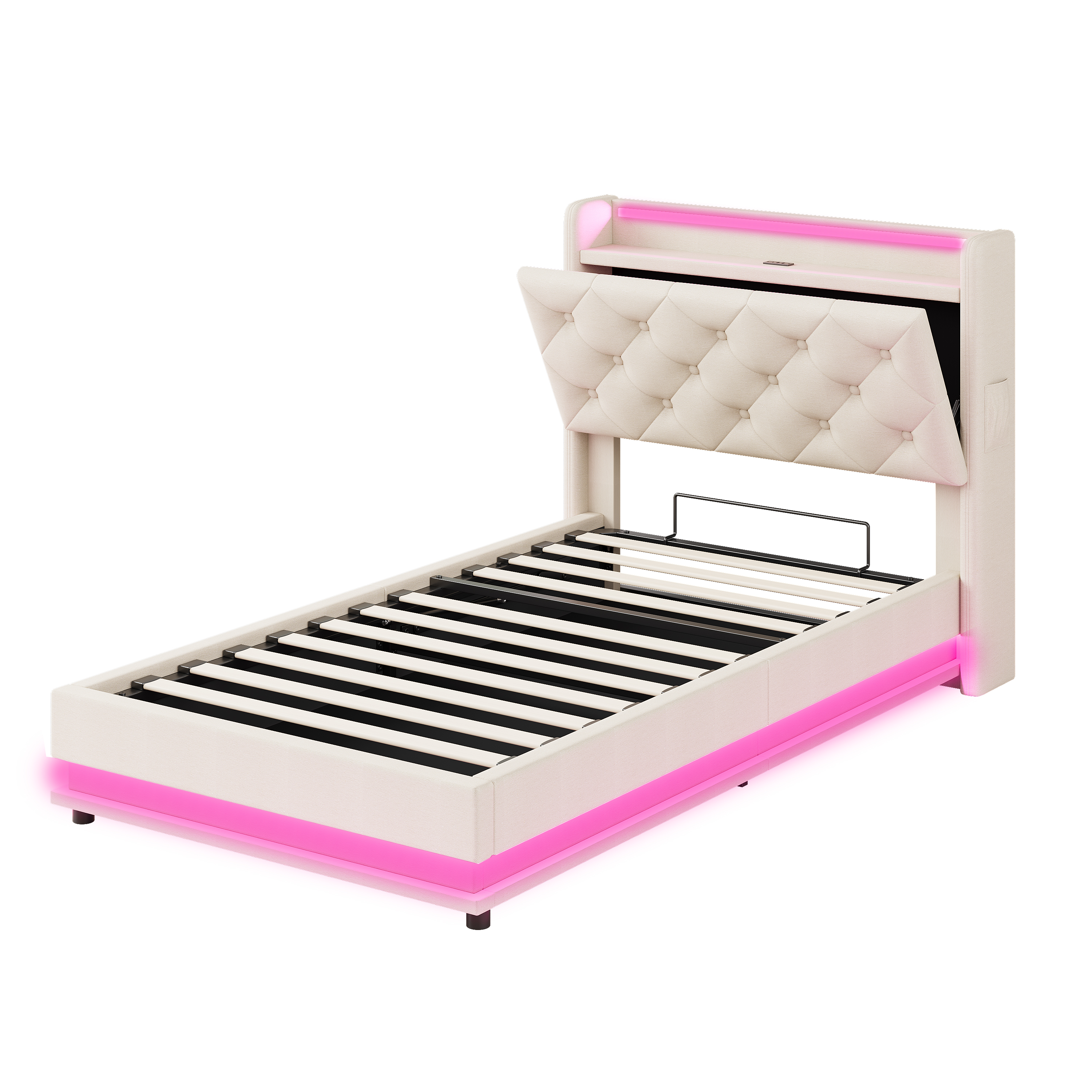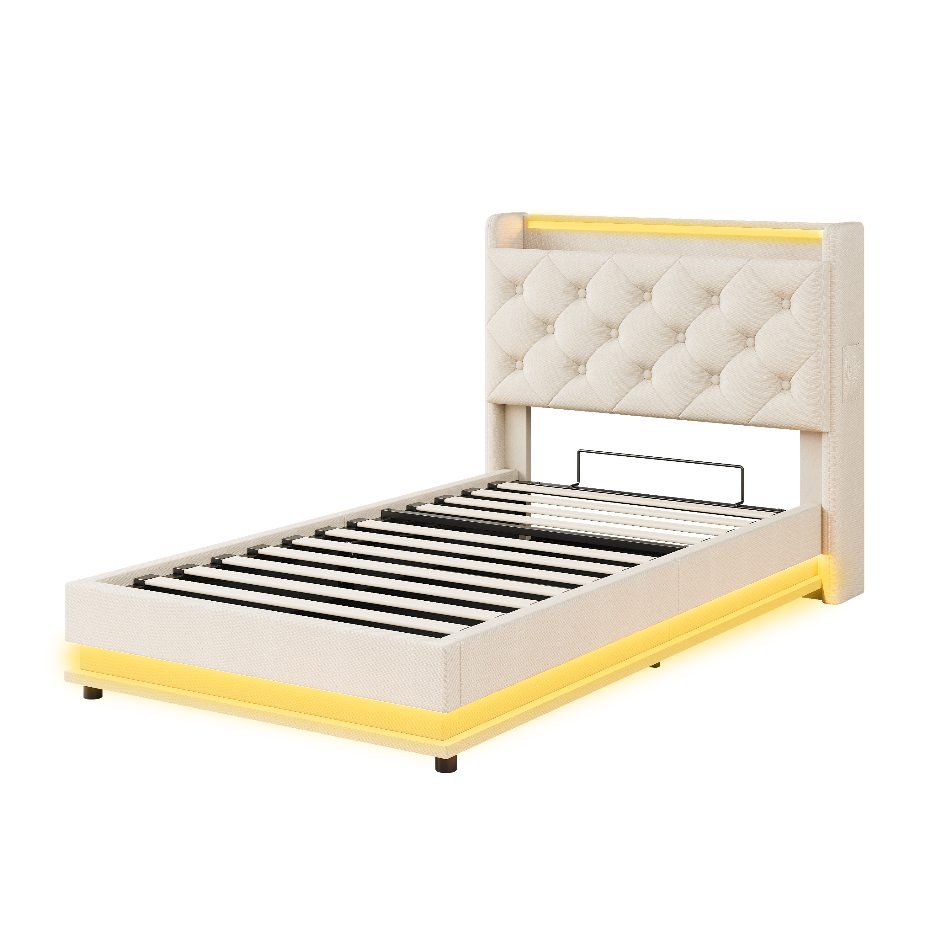 Product Name:3ft Single Upholstered Bed Frame with Hydraulic Storage, LED Button Tufted Headboard with Charging Station and Concealed Headboard Storage, USB and Type-C Ports, Linen, Beige (No Mattress)