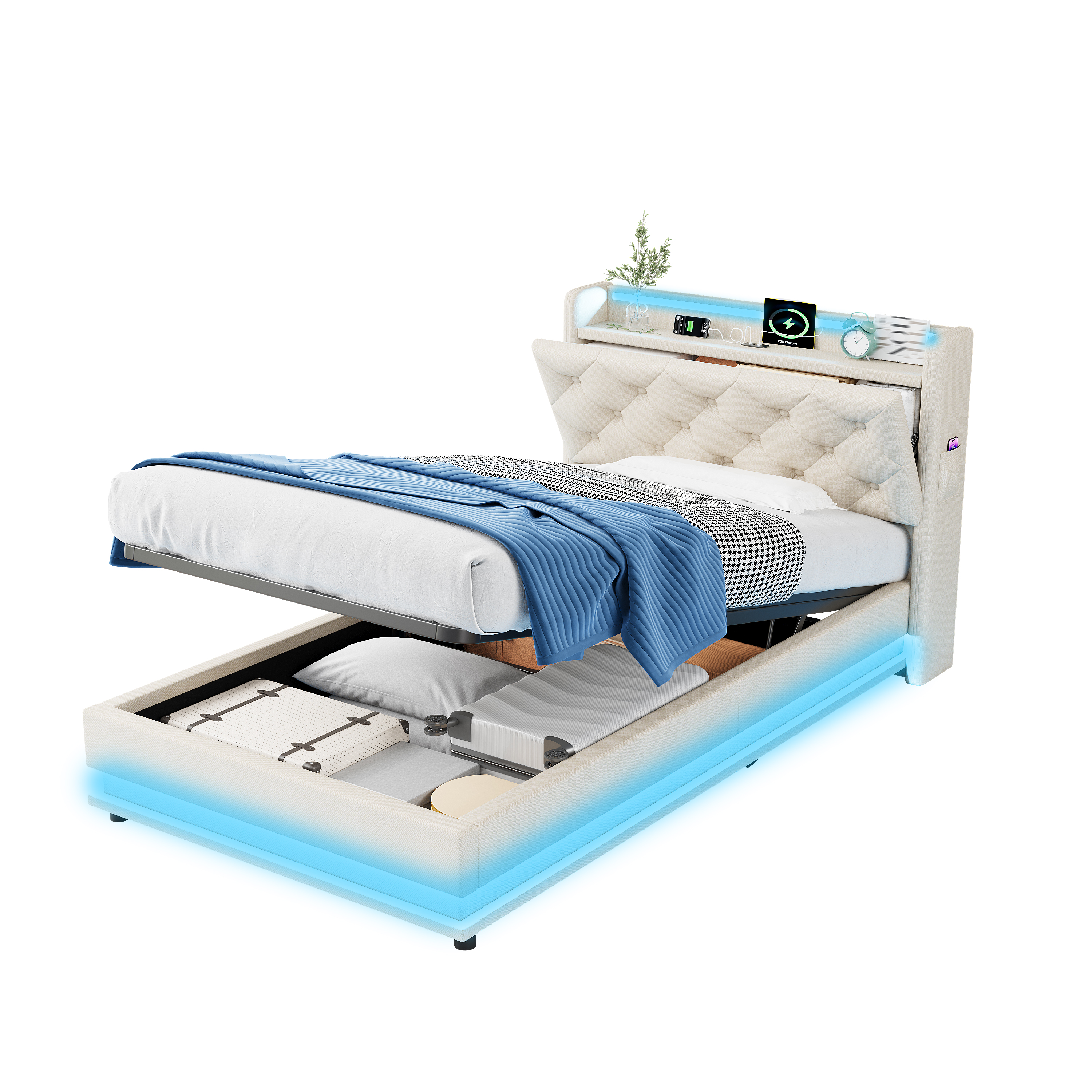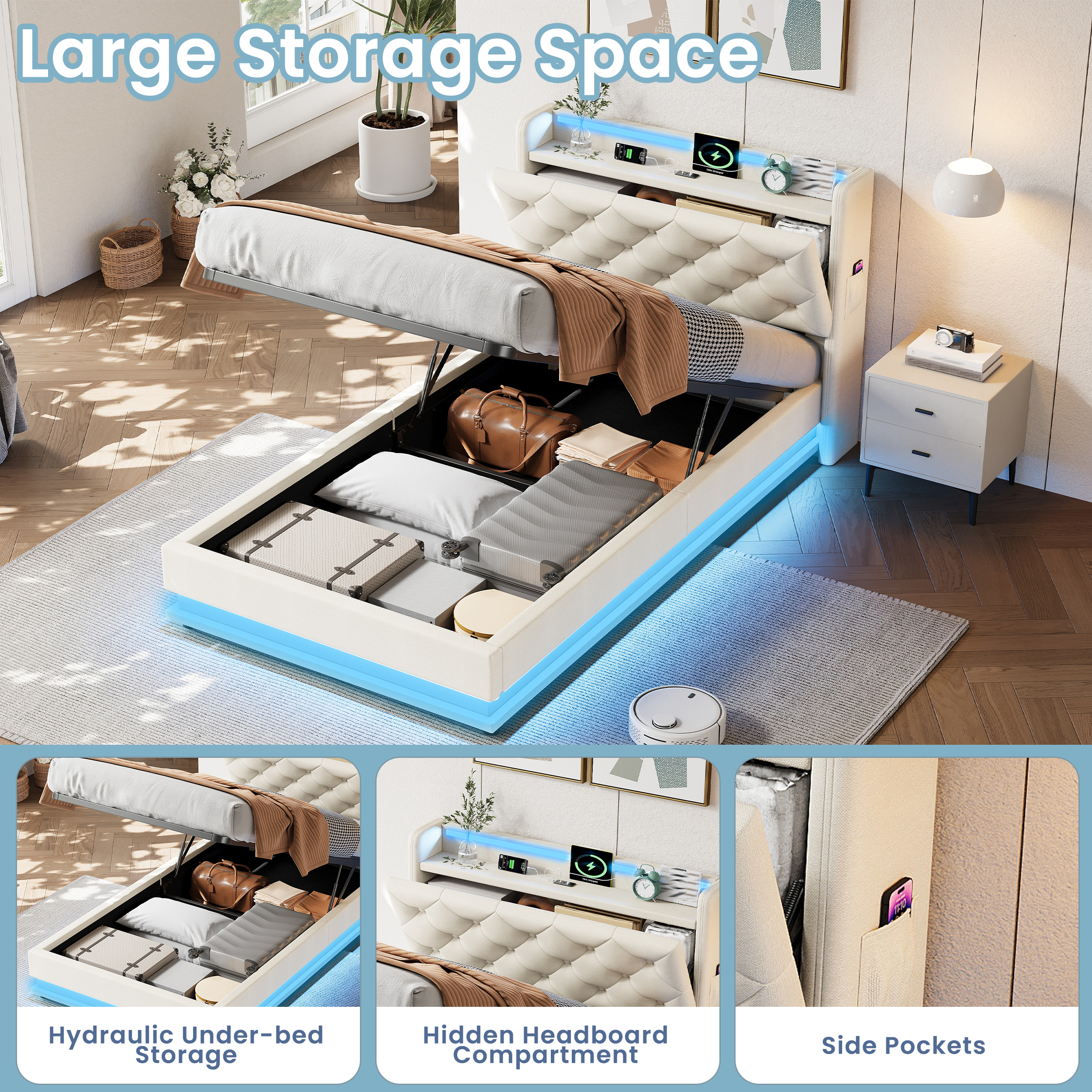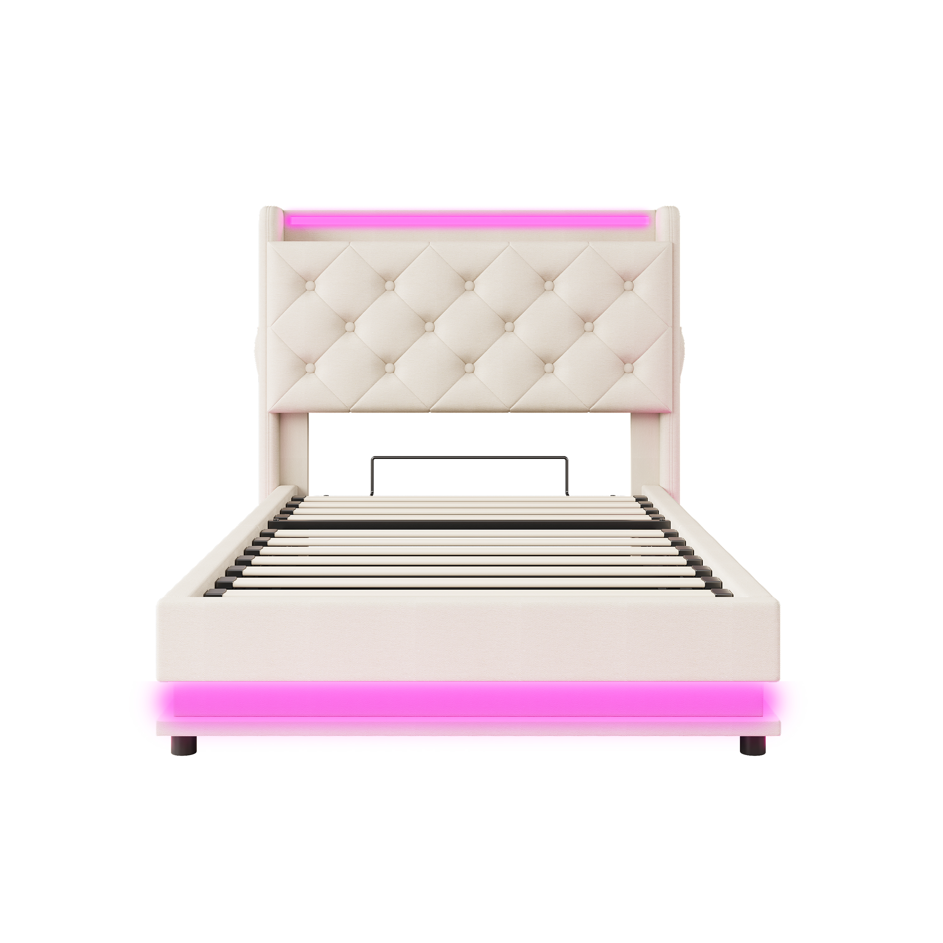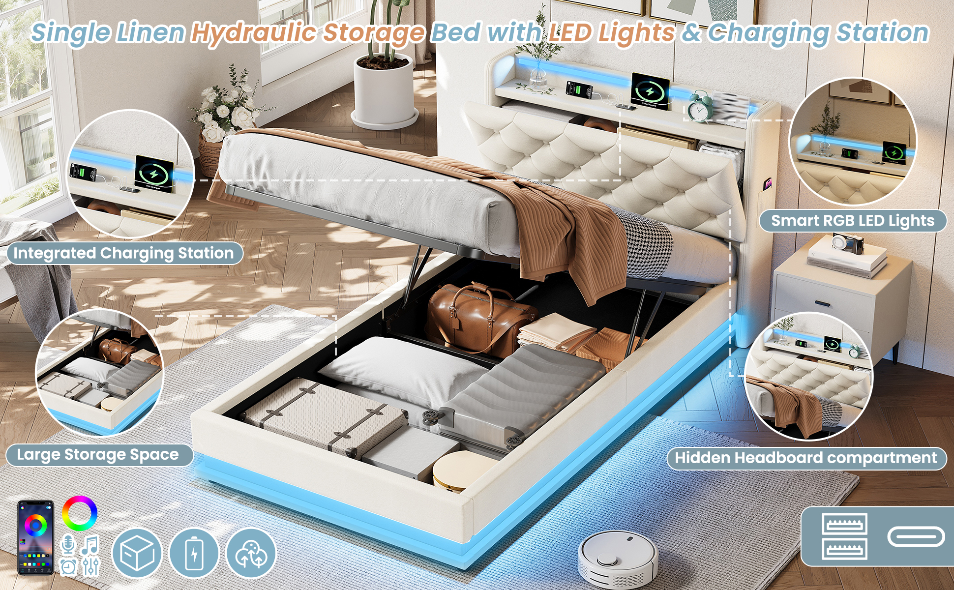 Product Name:3ft Single Upholstered Bed Frame with Hydraulic Storage, LED Button Tufted Headboard with Charging Station and Concealed Headboard Storage, USB and Type-C Ports, Linen, Beige (No Mattress)
