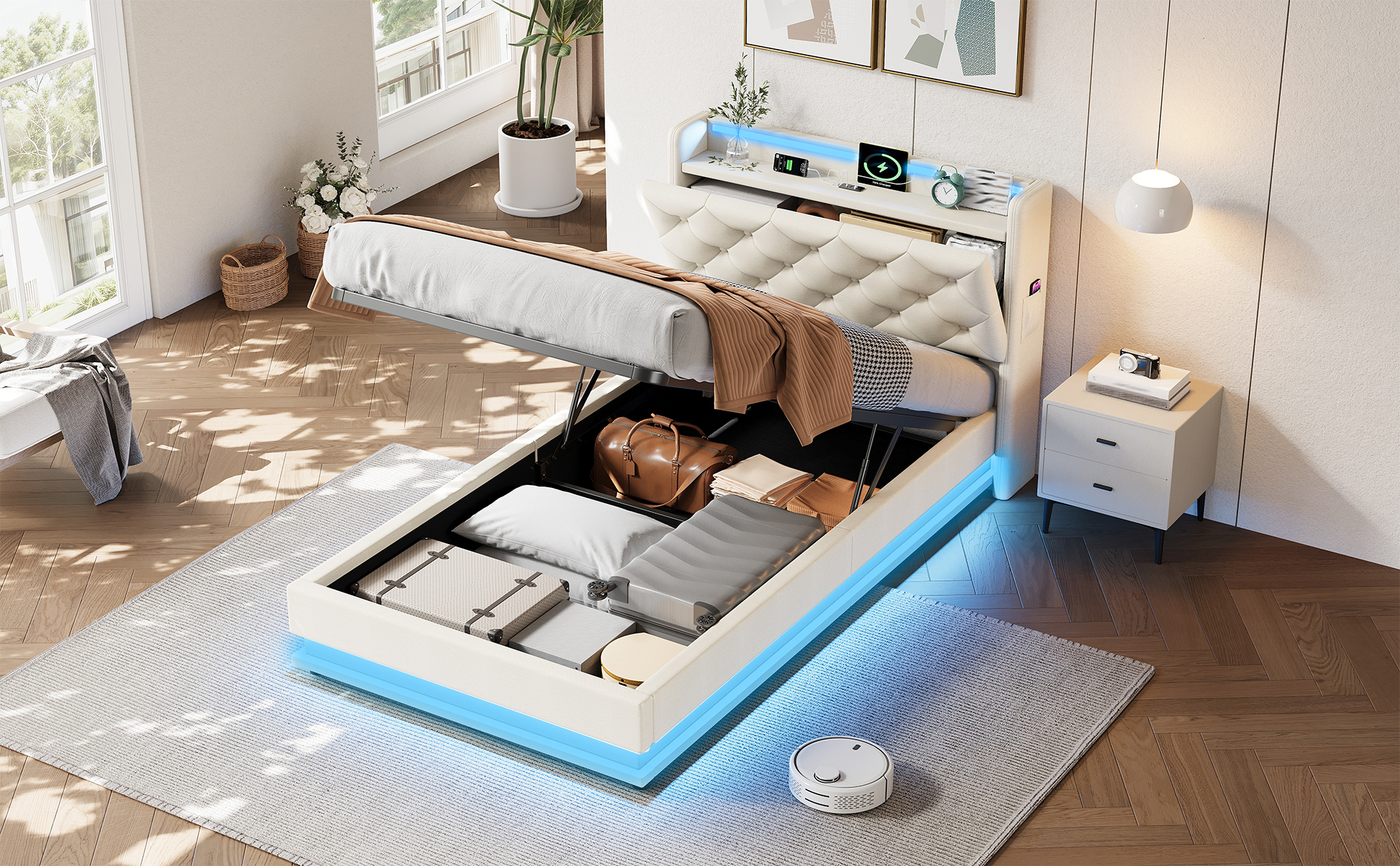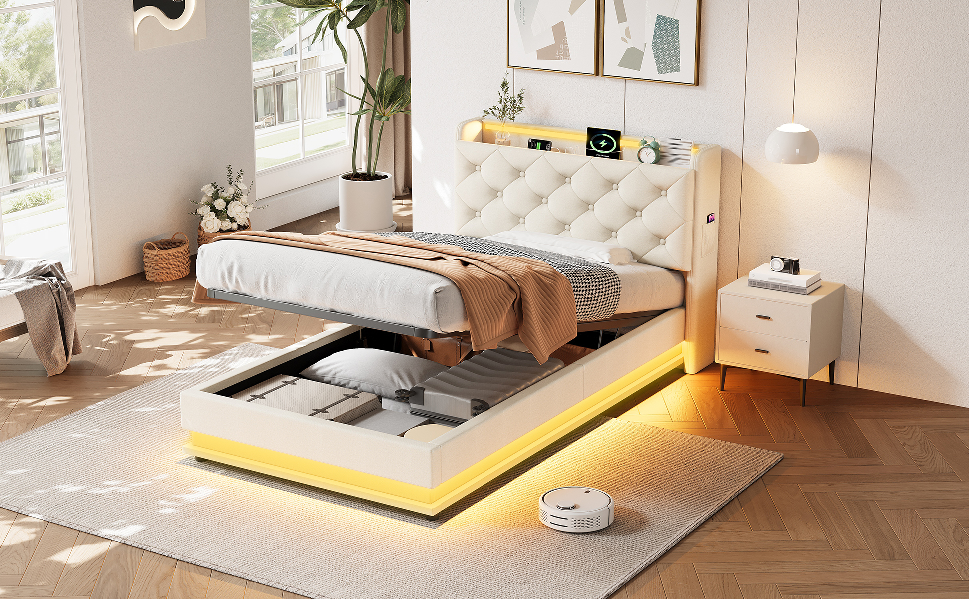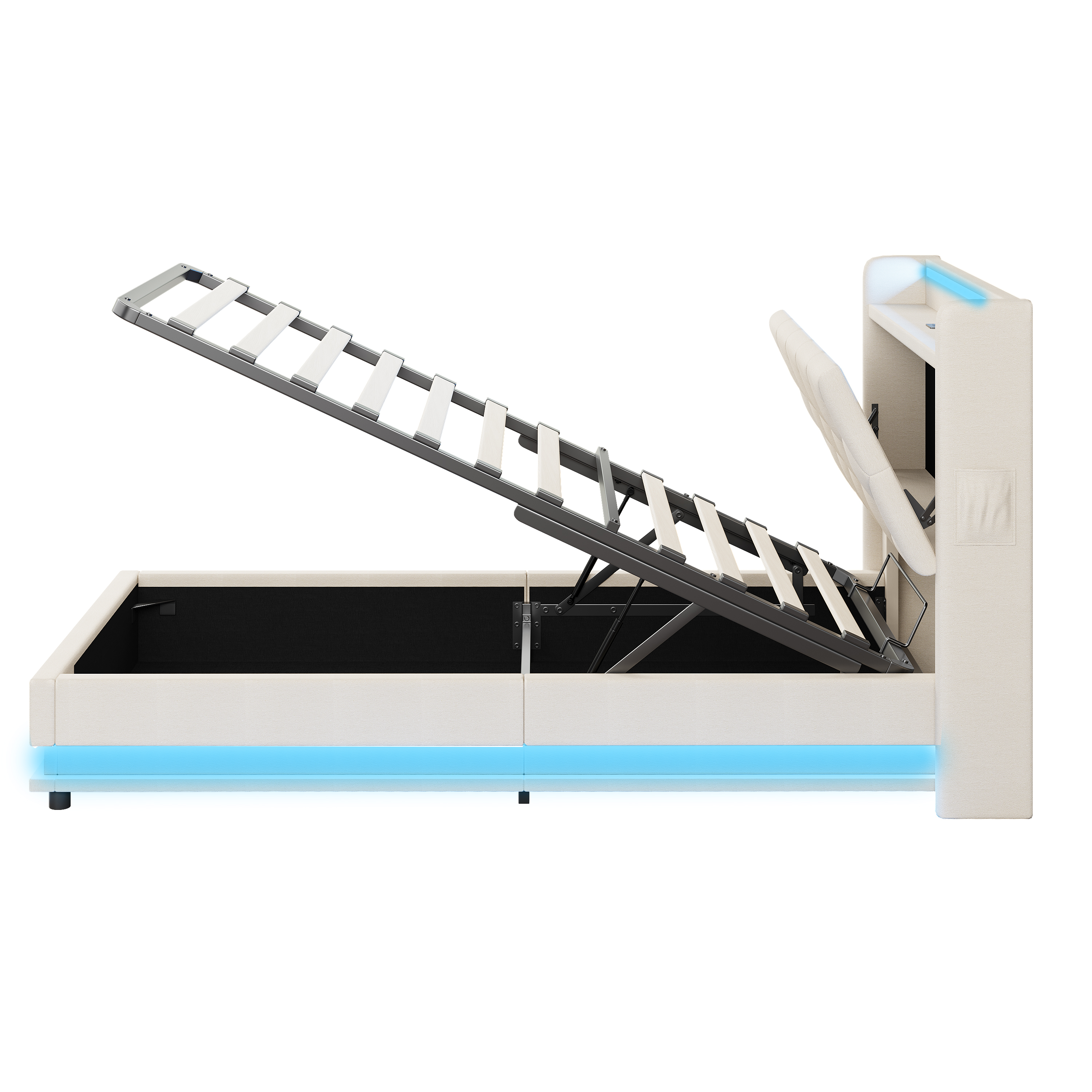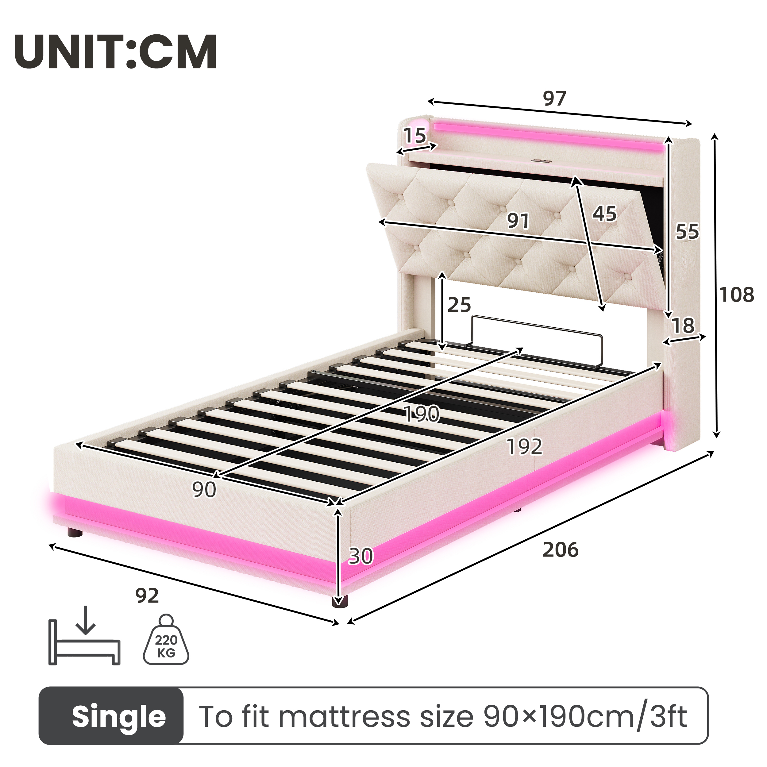 Product Name:3ft Single Upholstered Bed Frame with Hydraulic Storage, LED Button Tufted Headboard with Charging Station and Concealed Headboard Storage, USB and Type-C Ports, Linen, Beige (No Mattress)