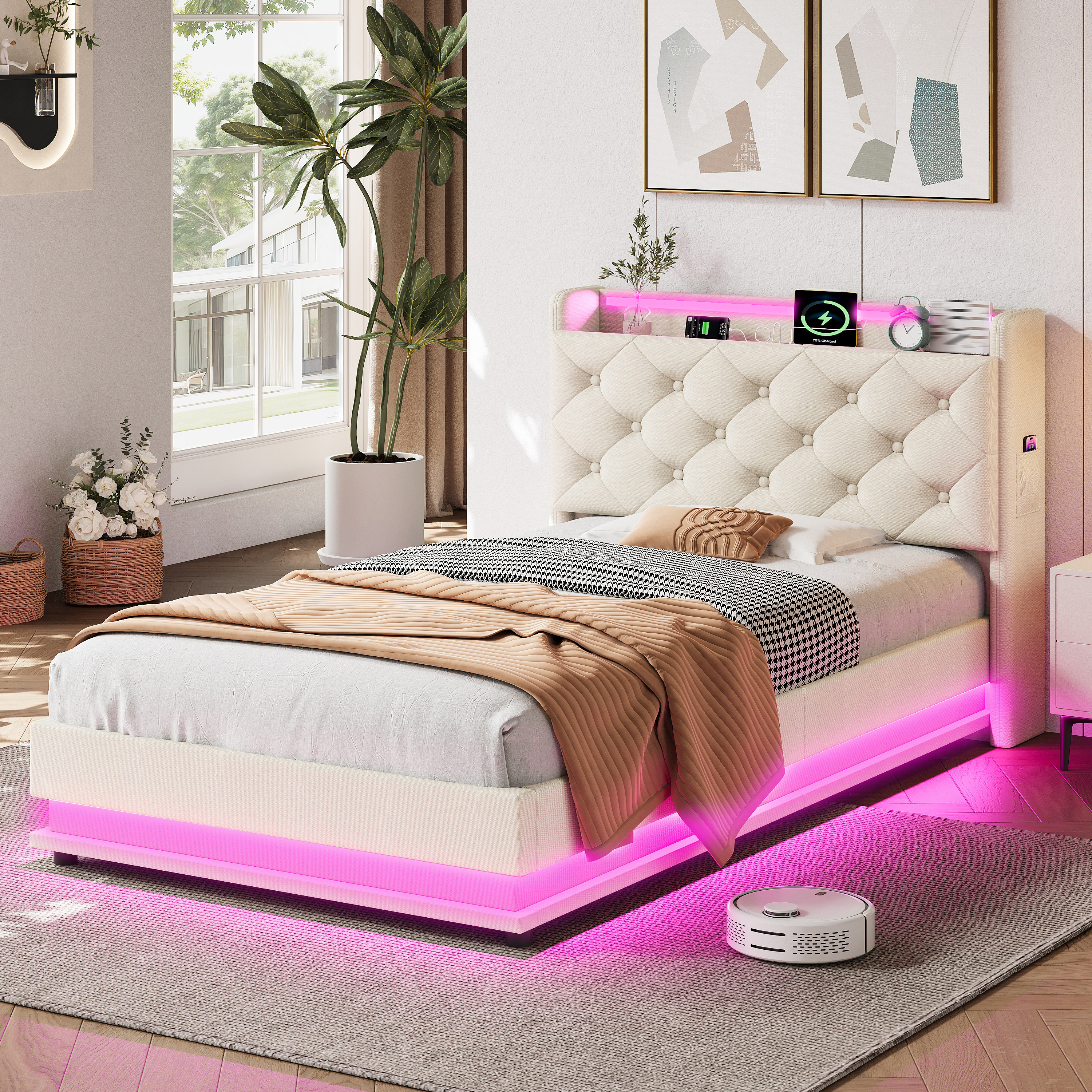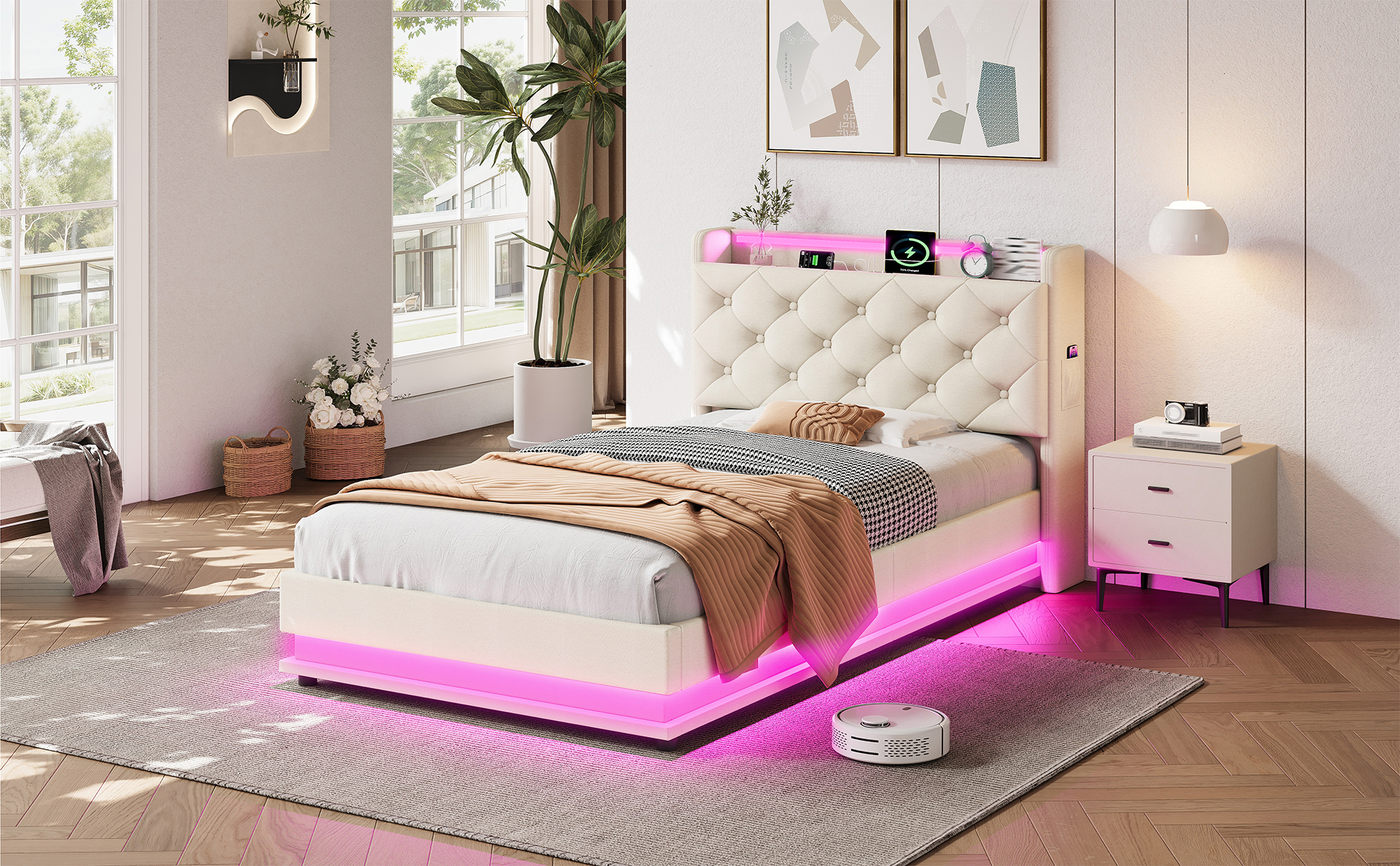 • [RGB LED Lighting Strip] The headboard and around the bed base of the bed are equipped with RGB lights that can be controlled via mobile app. You can set the brightness and color freely, and there are also control modes such as style mode, music mode, microphone mode and timing function for you to explore. You can design a unique light show according to your own preferences.