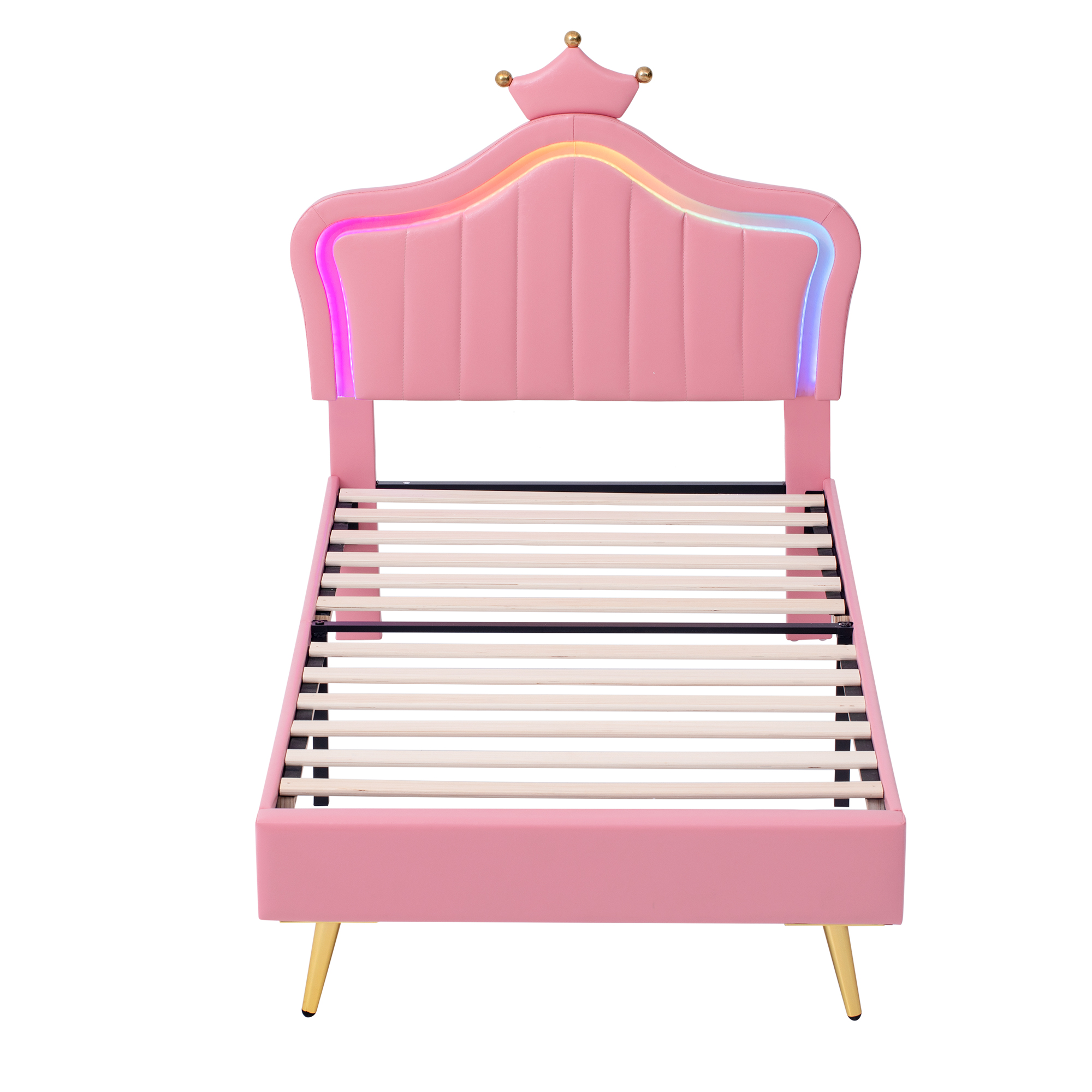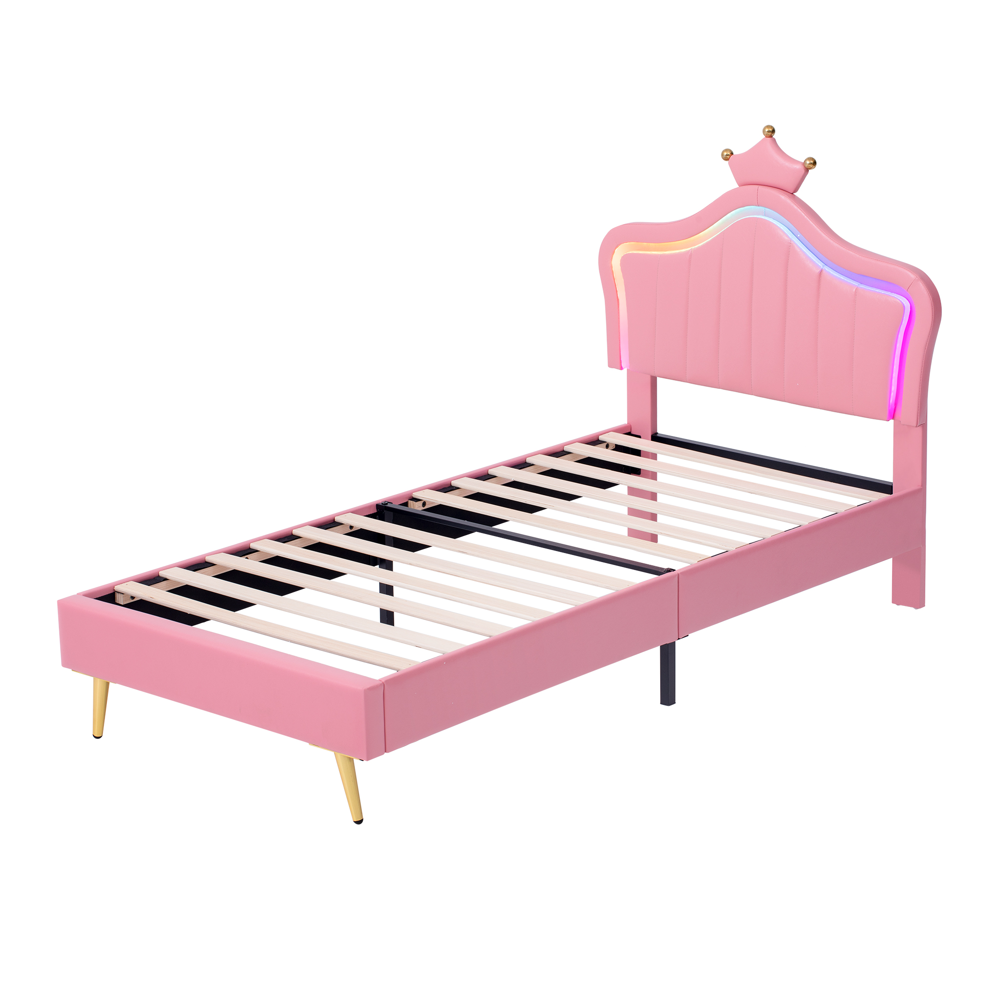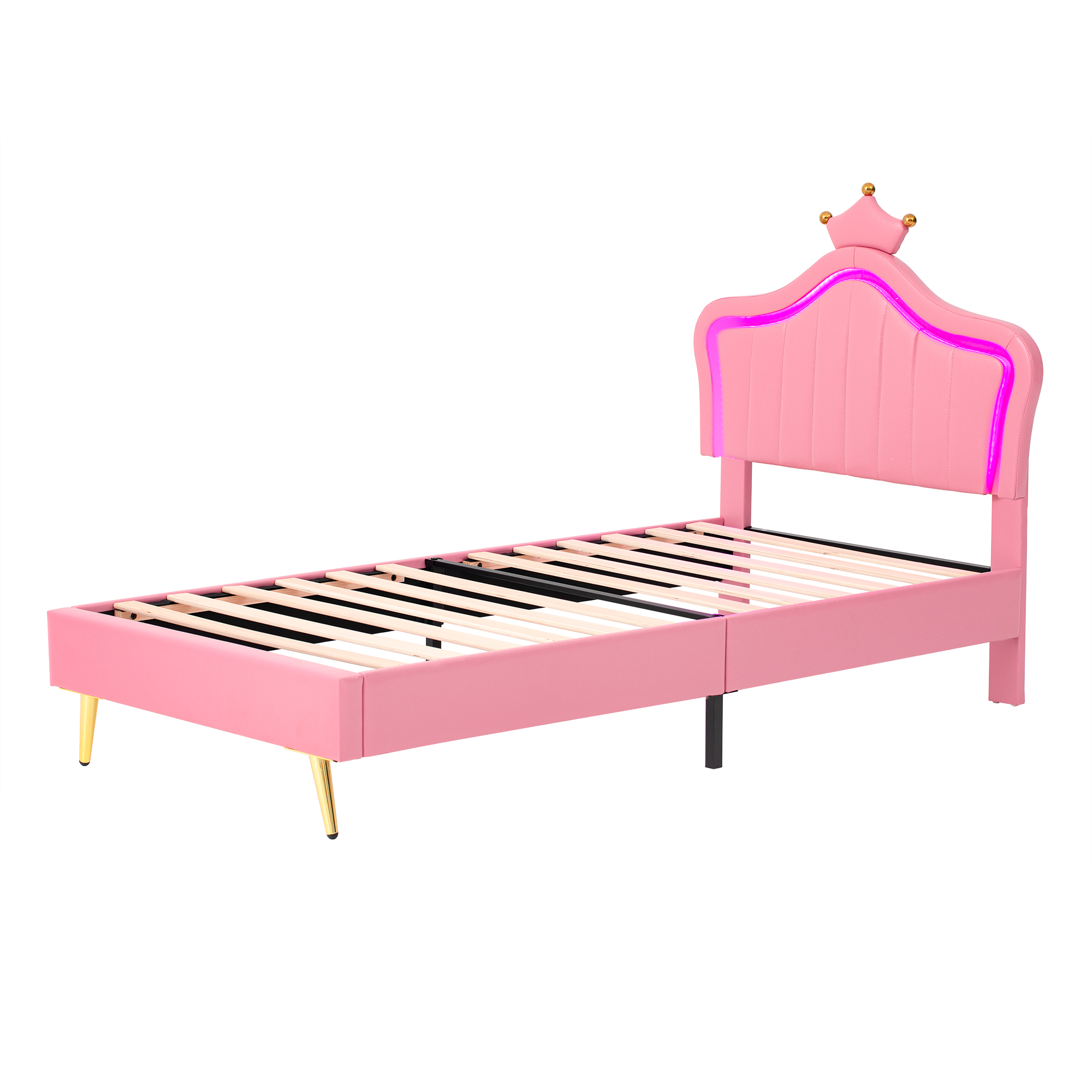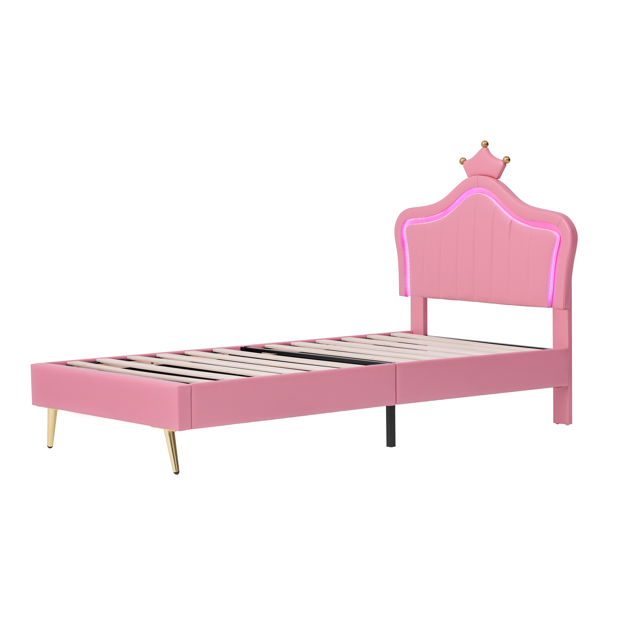 Product Name:3ft Single Upholstered Bed with LED Adjustable Crown Shape Headboard, PU Leather Bed Frame with Solid Wood Slat, No Box Spring Needed, Easy Assembly, Pink (No Mattress)