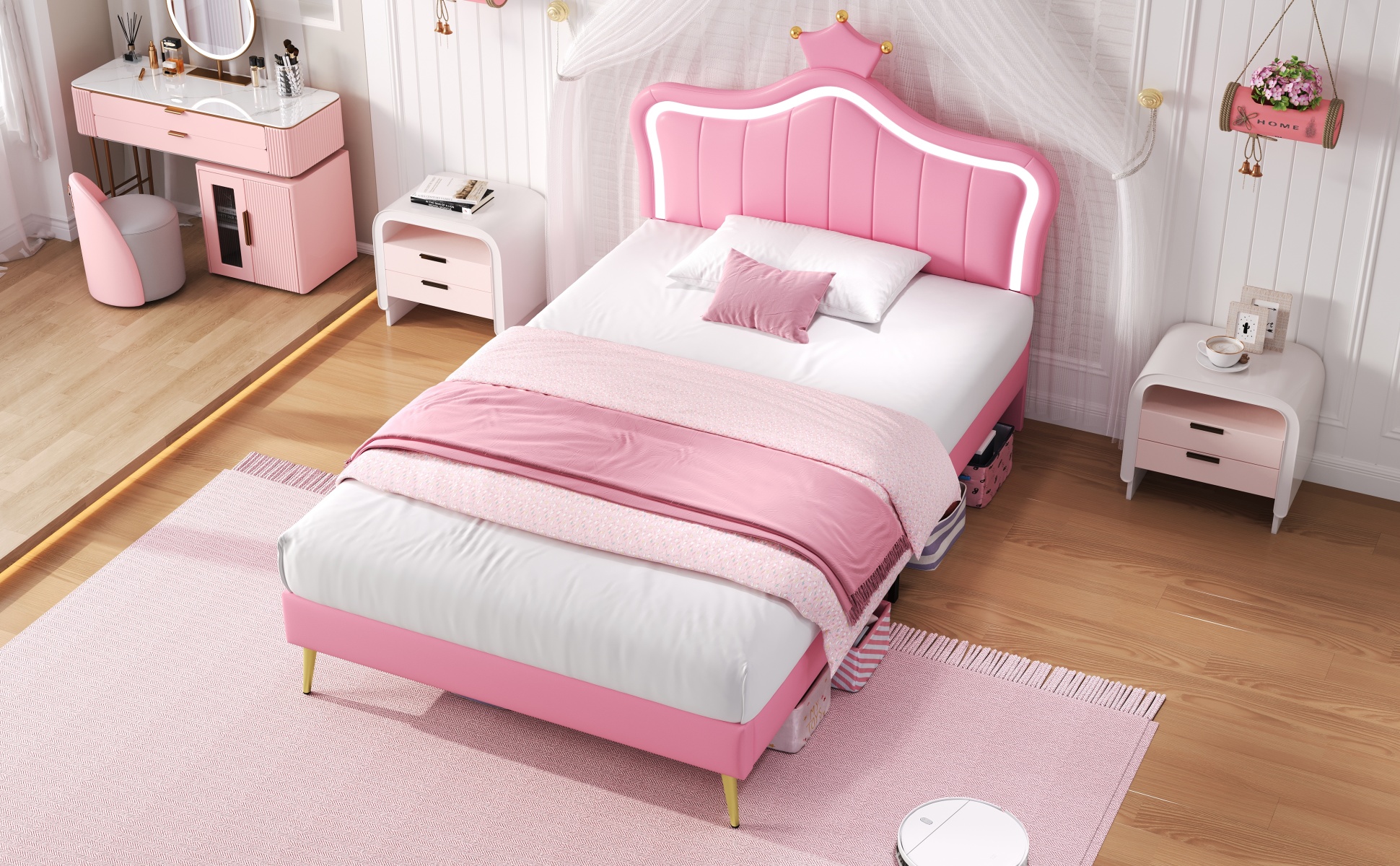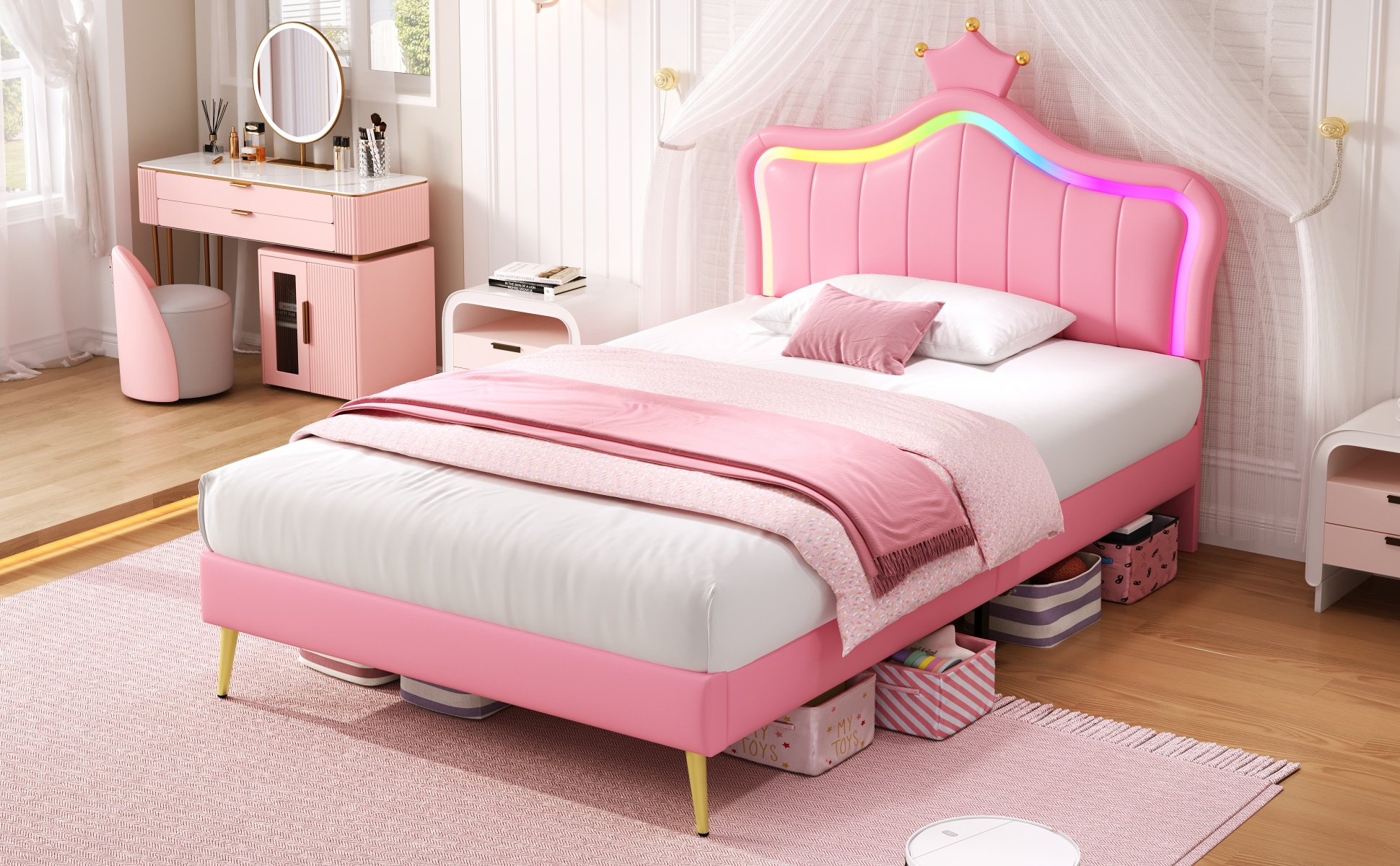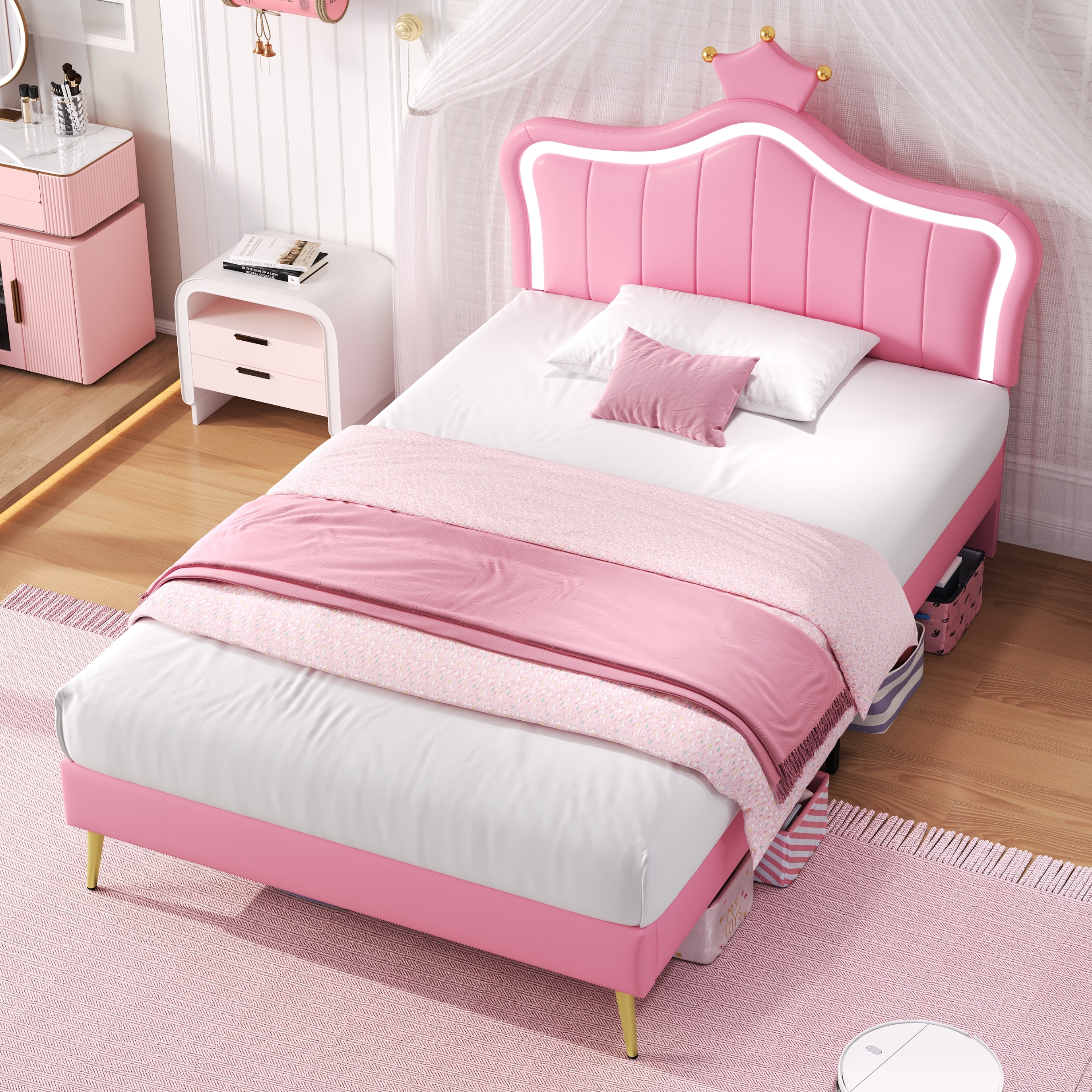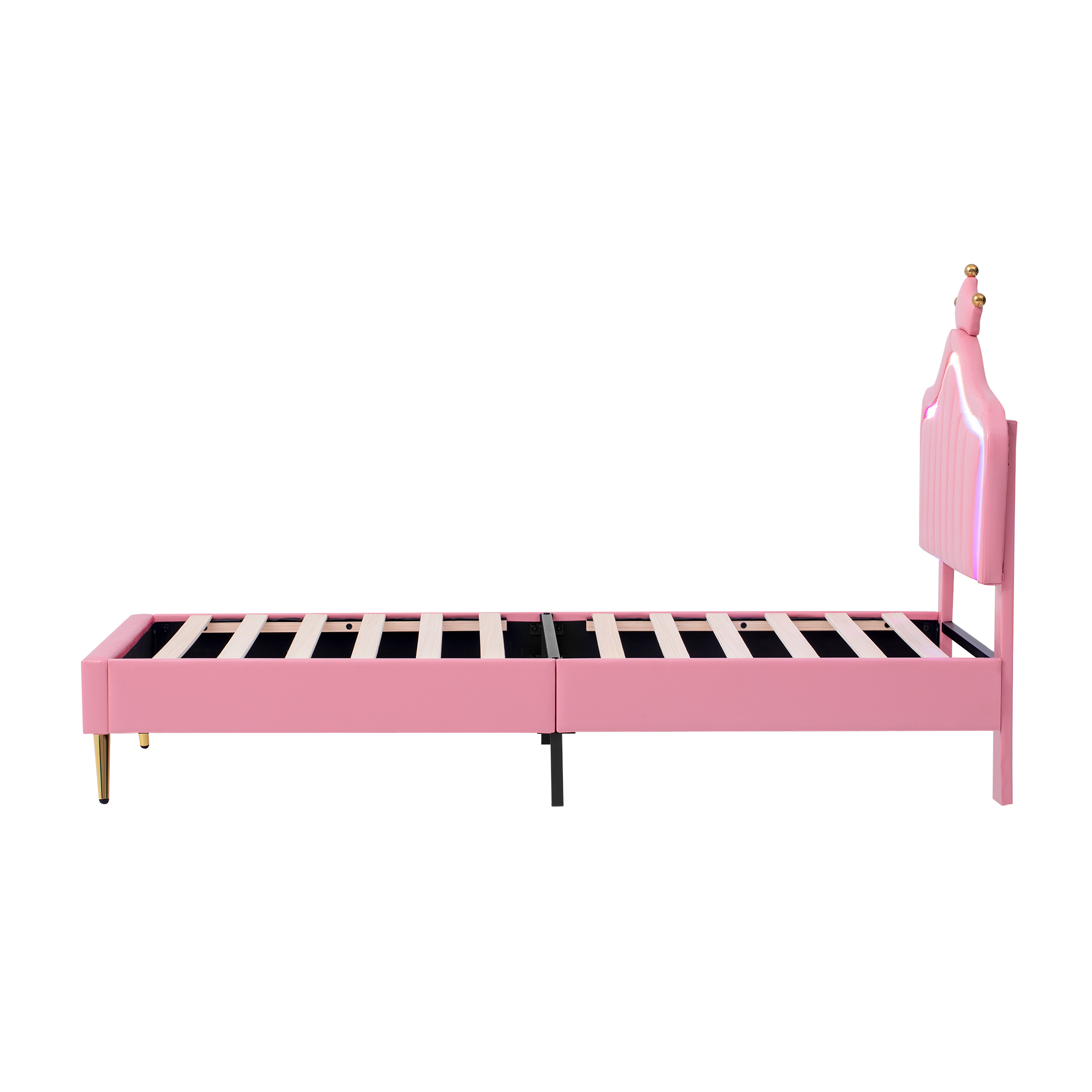 Product Name:3ft Single Upholstered Bed with LED Adjustable Crown Shape Headboard, PU Leather Bed Frame with Solid Wood Slat, No Box Spring Needed, Easy Assembly, Pink (No Mattress)