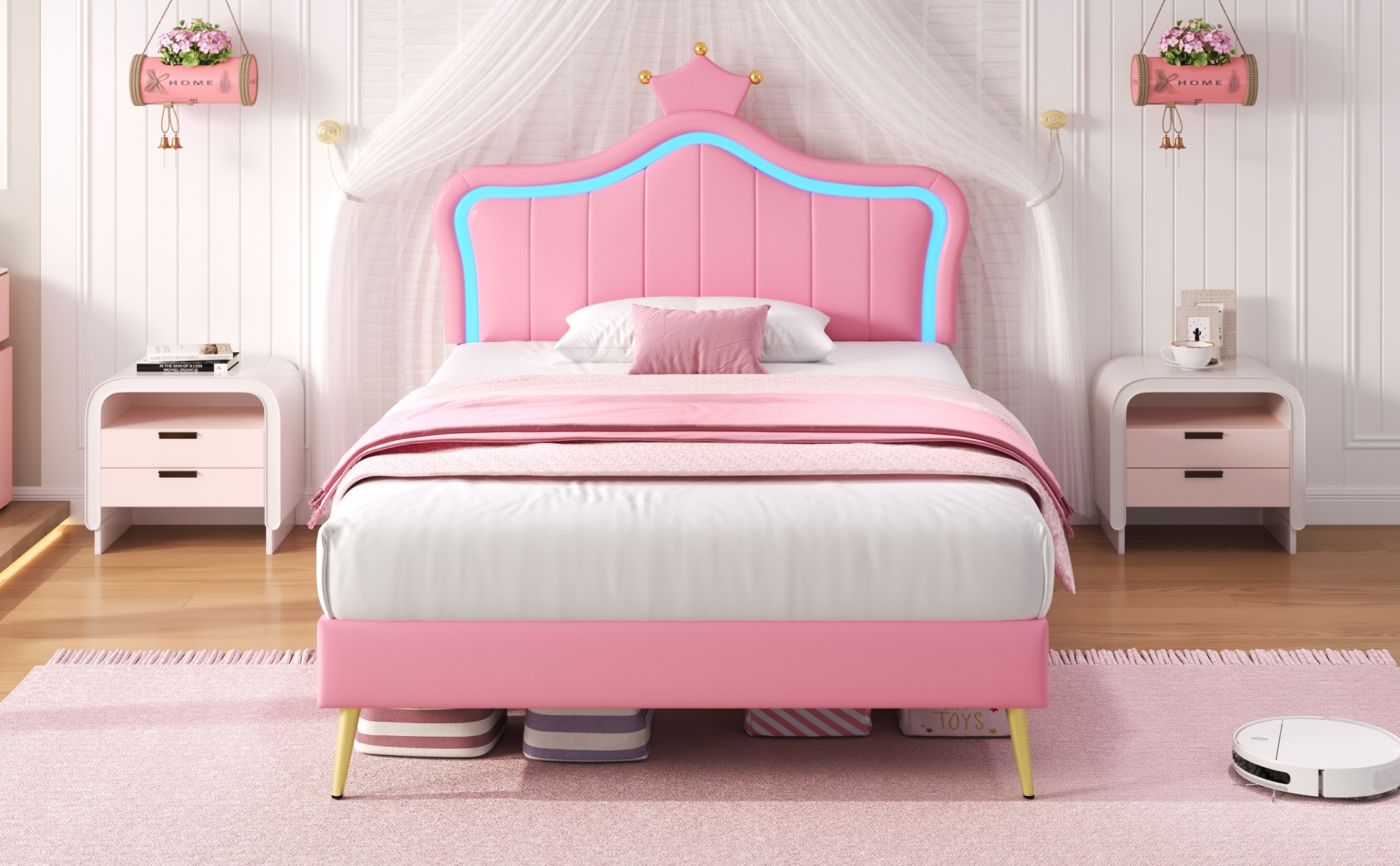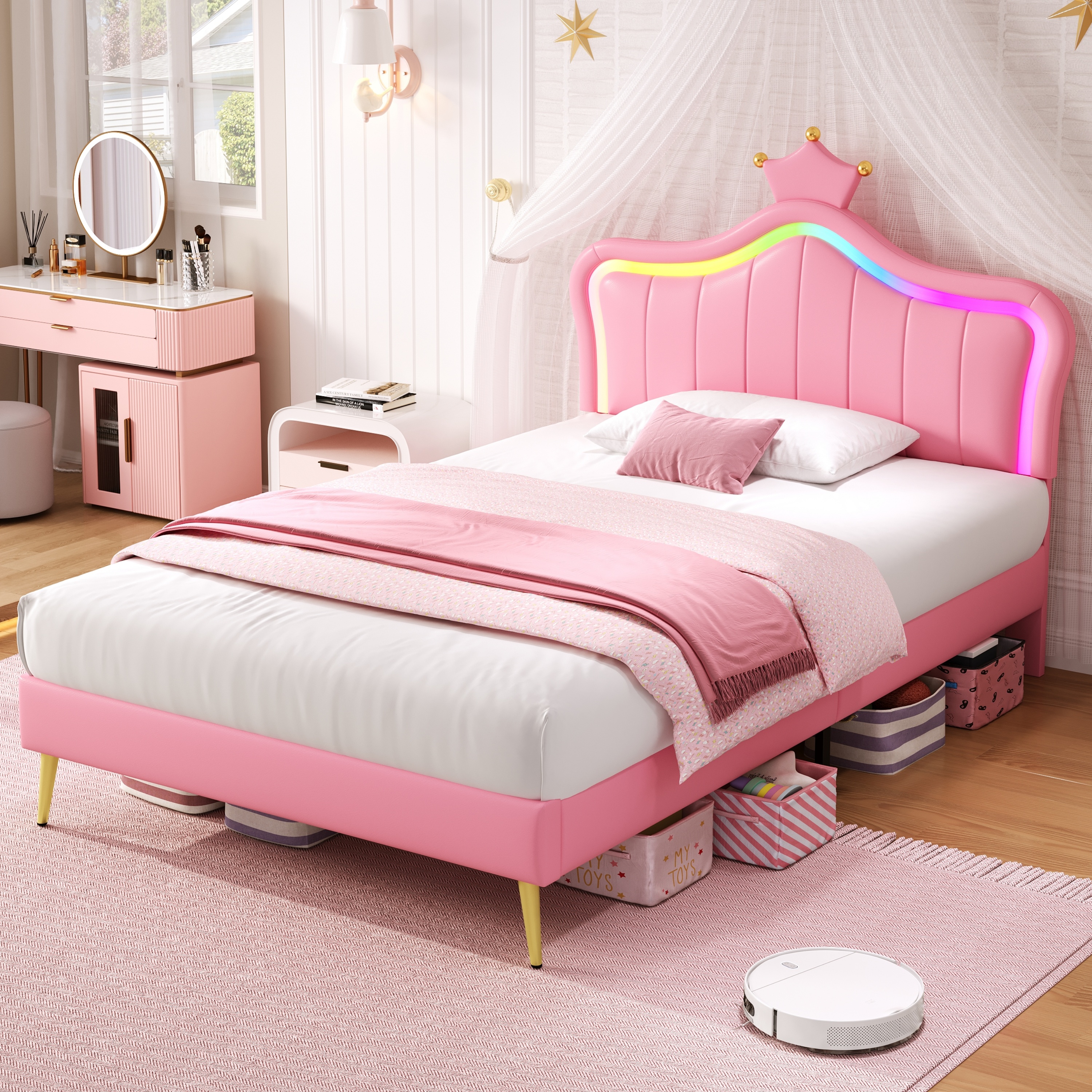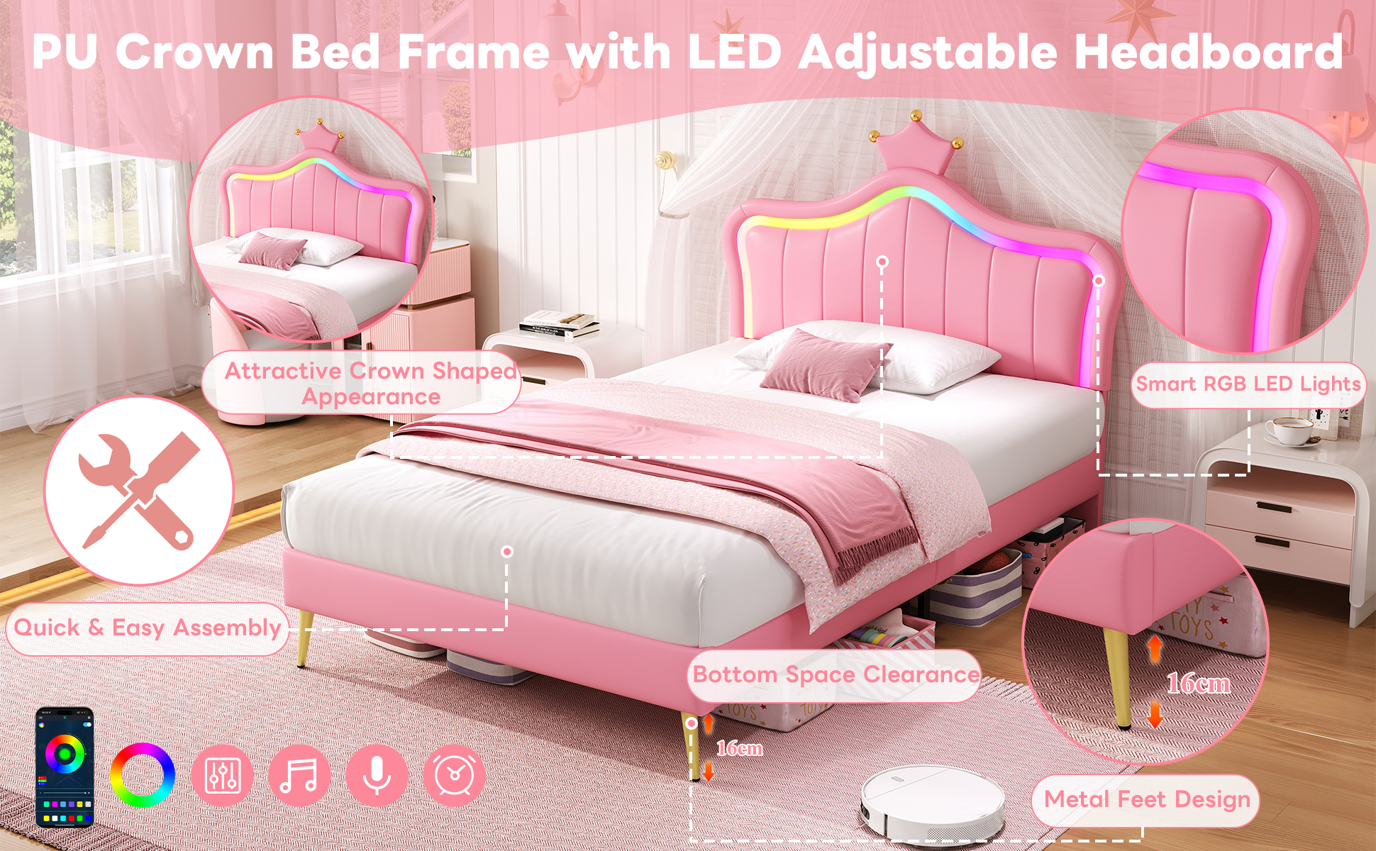 | Special Features | RGB LED lighting strip & Adjustable crown shape headboard & Bottom space clearance & Metal feet design |
