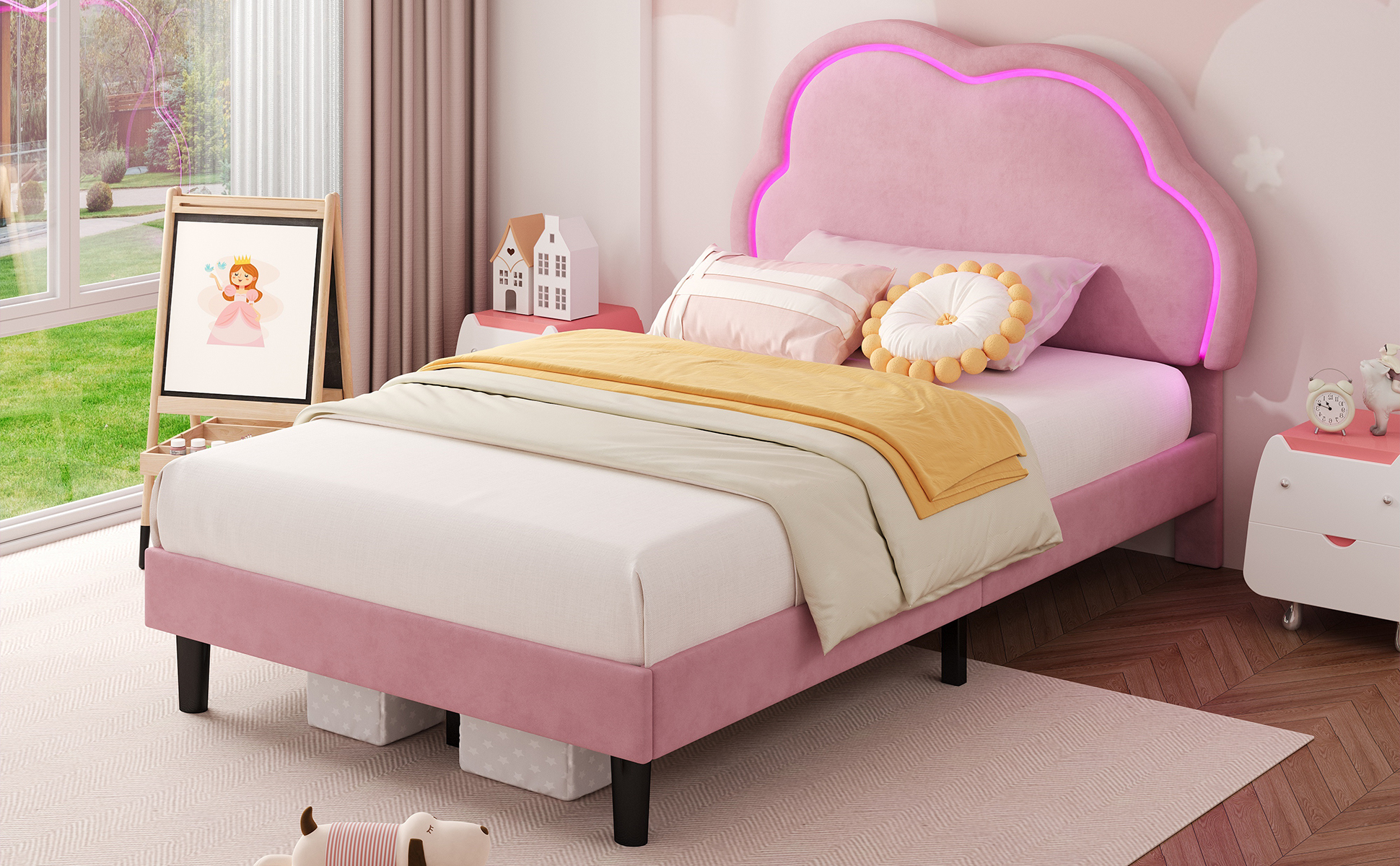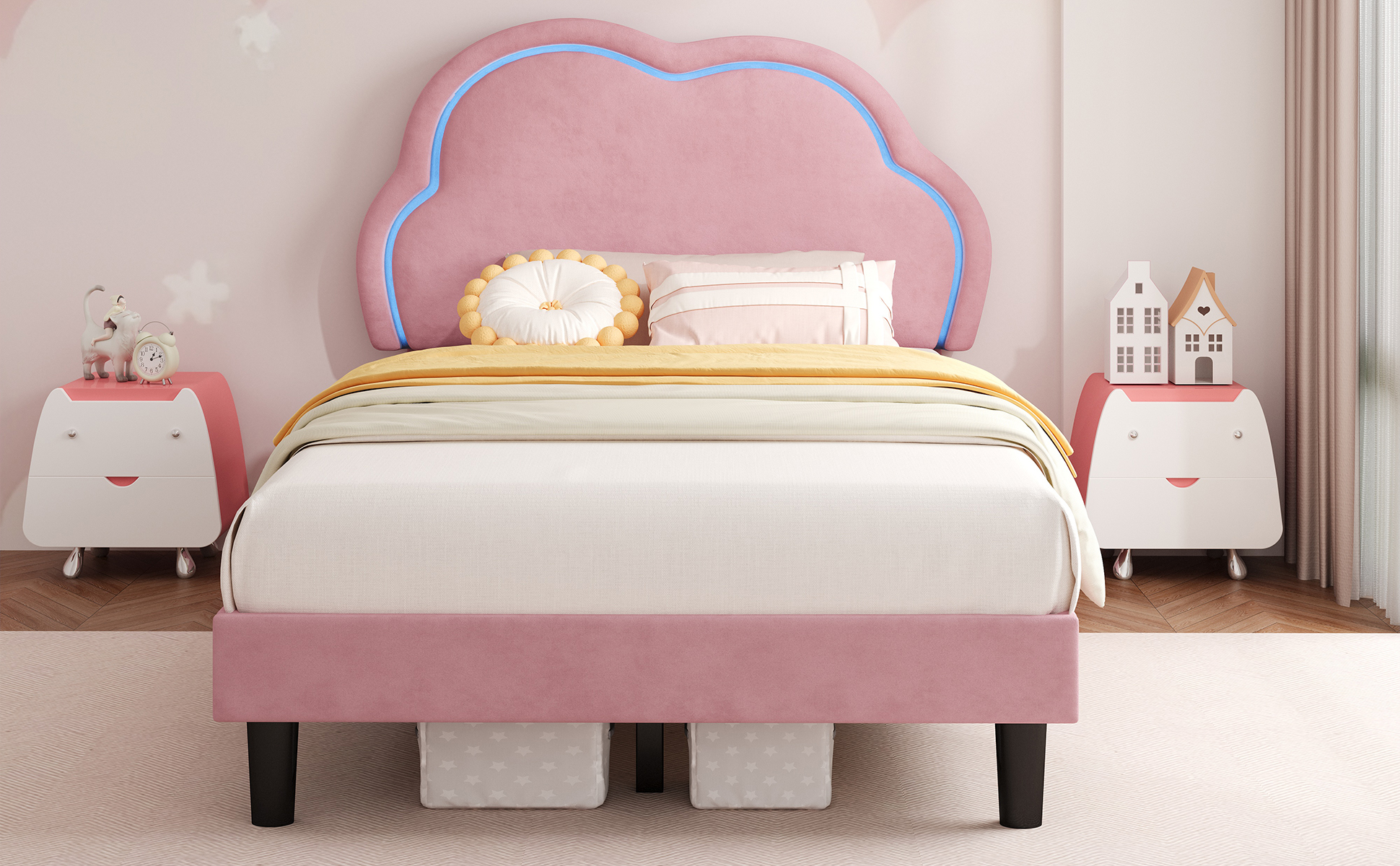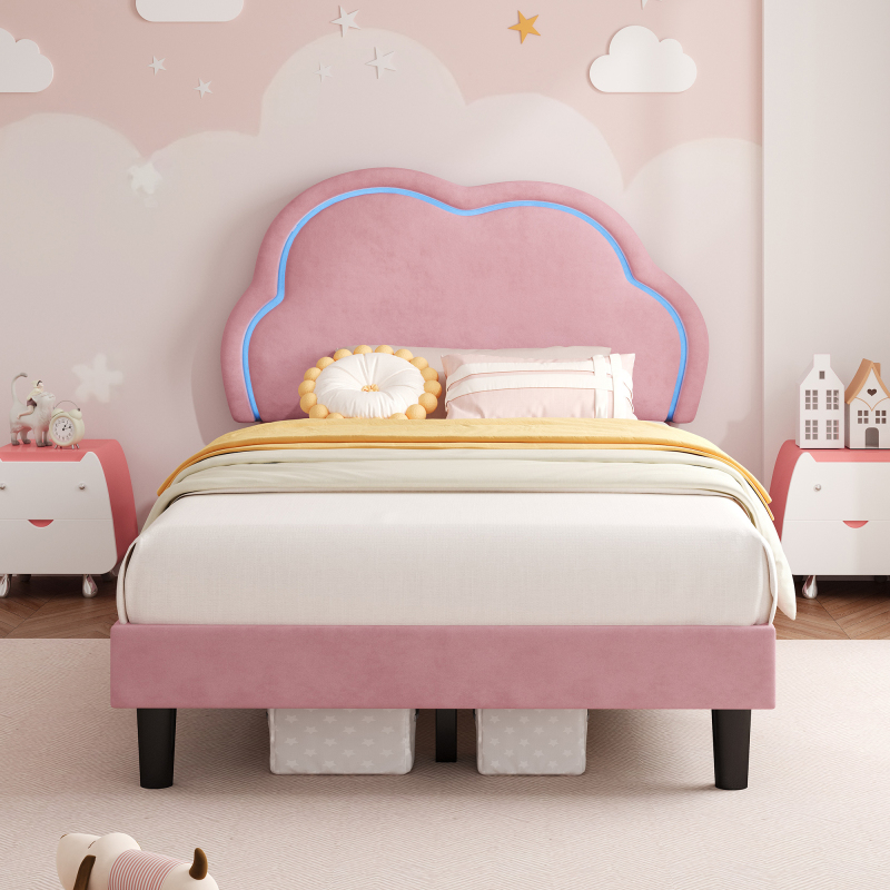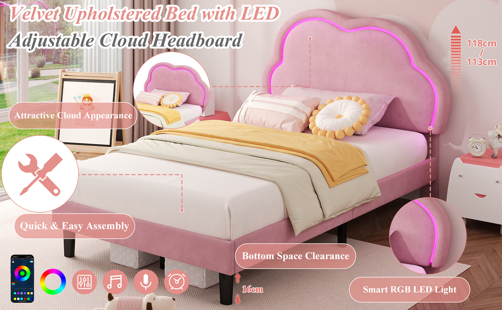 Product Name:3ft Single Upholstered Bed with LED Adjustable Cute Cloud Headboard, Soft Velvet Bed Frame with Solid Wood Slat, No Box Spring Needed, Easy Assembly, Pink (No Mattress)