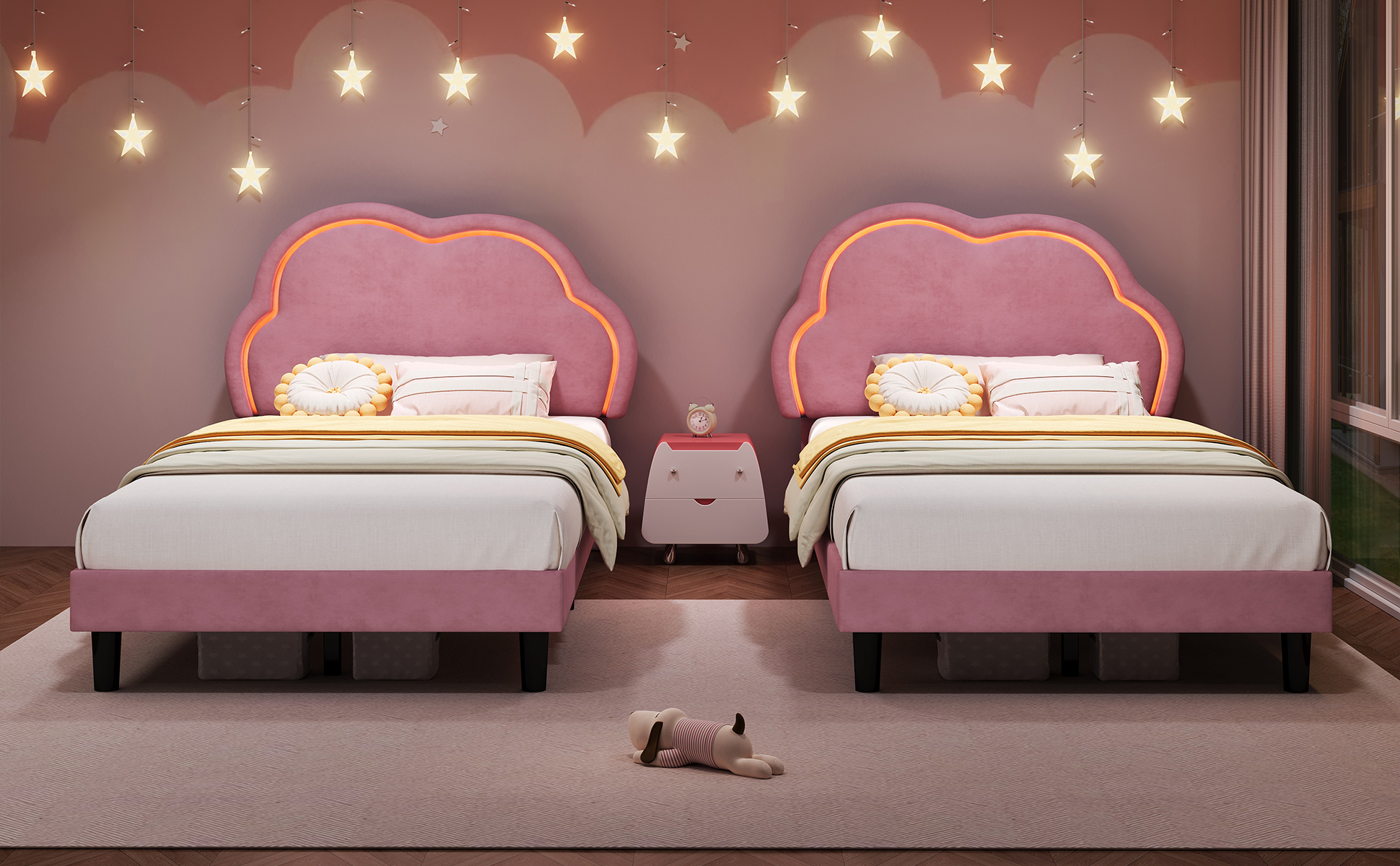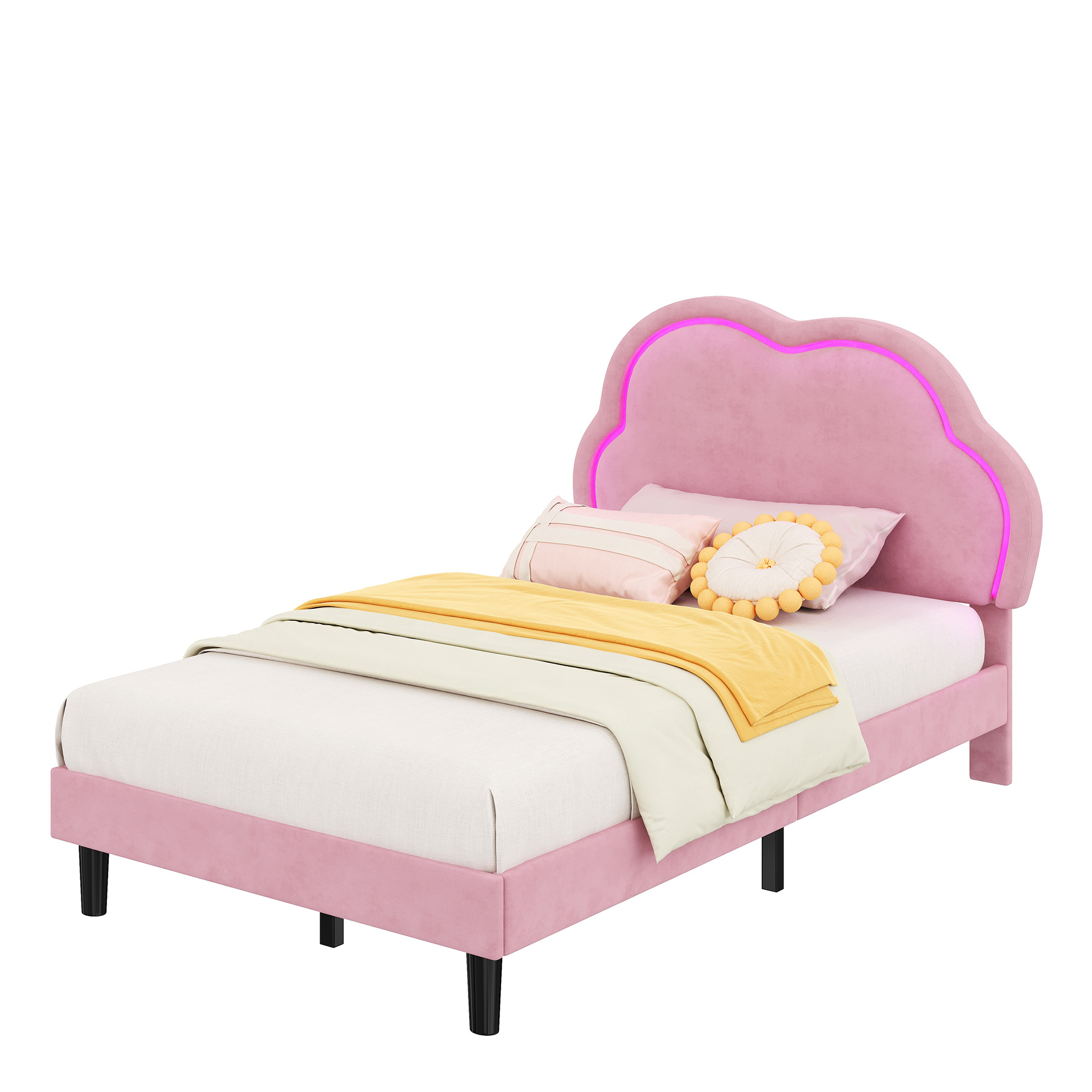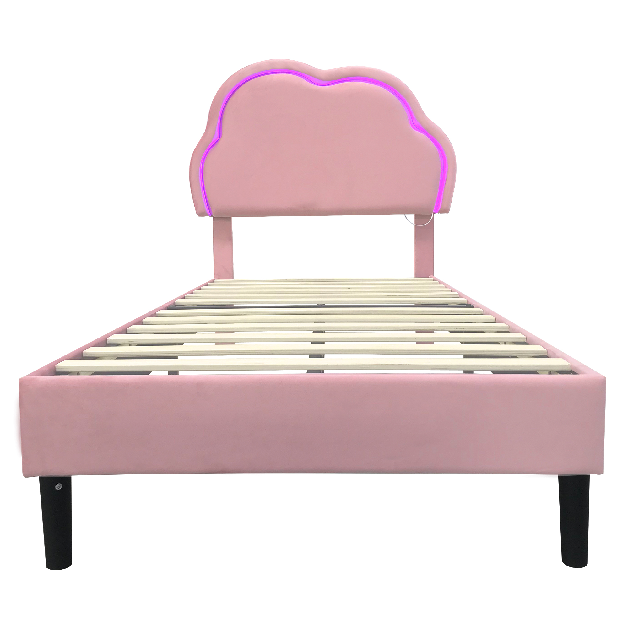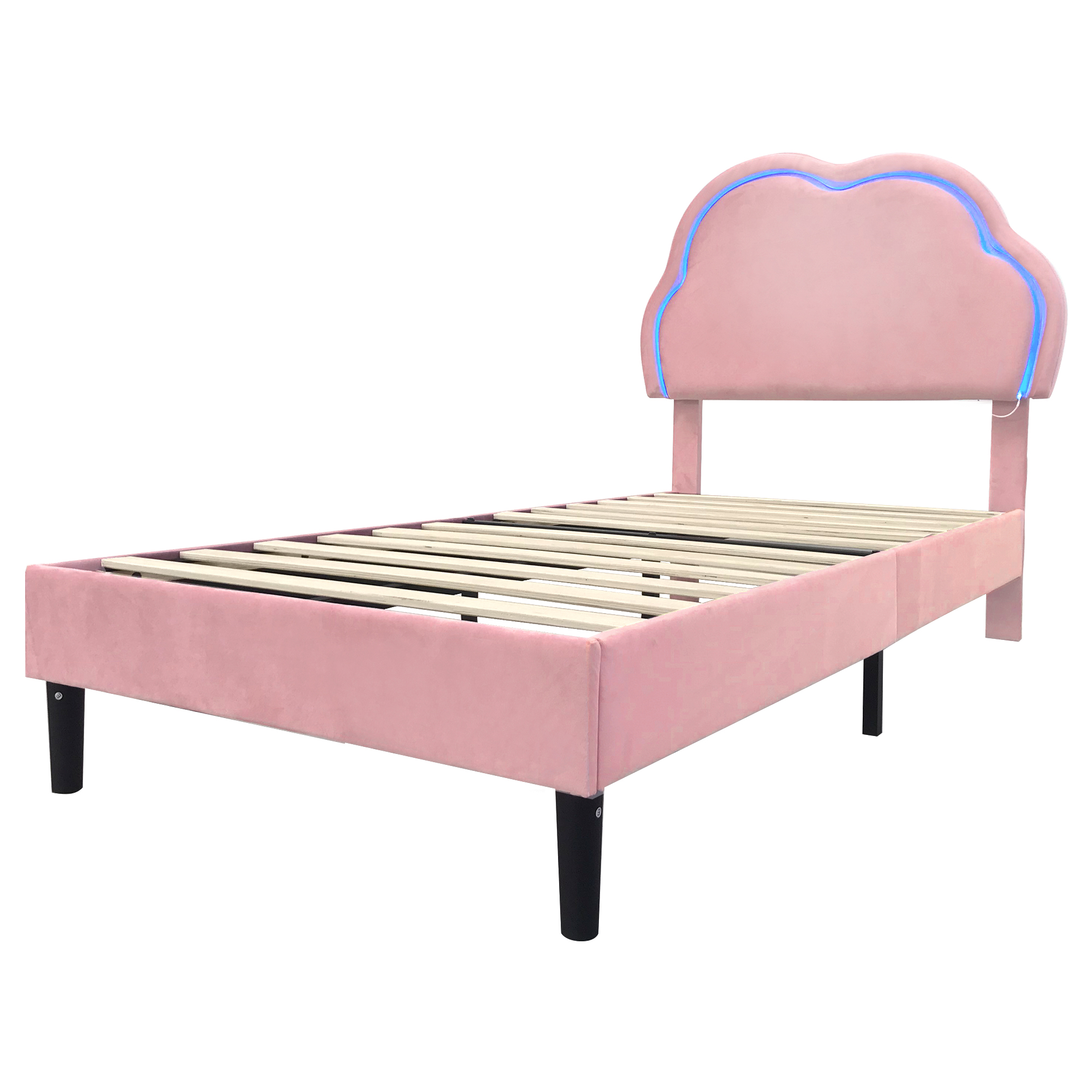 Product Name:3ft Single Upholstered Bed with LED Adjustable Cute Cloud Headboard, Soft Velvet Bed Frame with Solid Wood Slat, No Box Spring Needed, Easy Assembly, Pink (No Mattress)