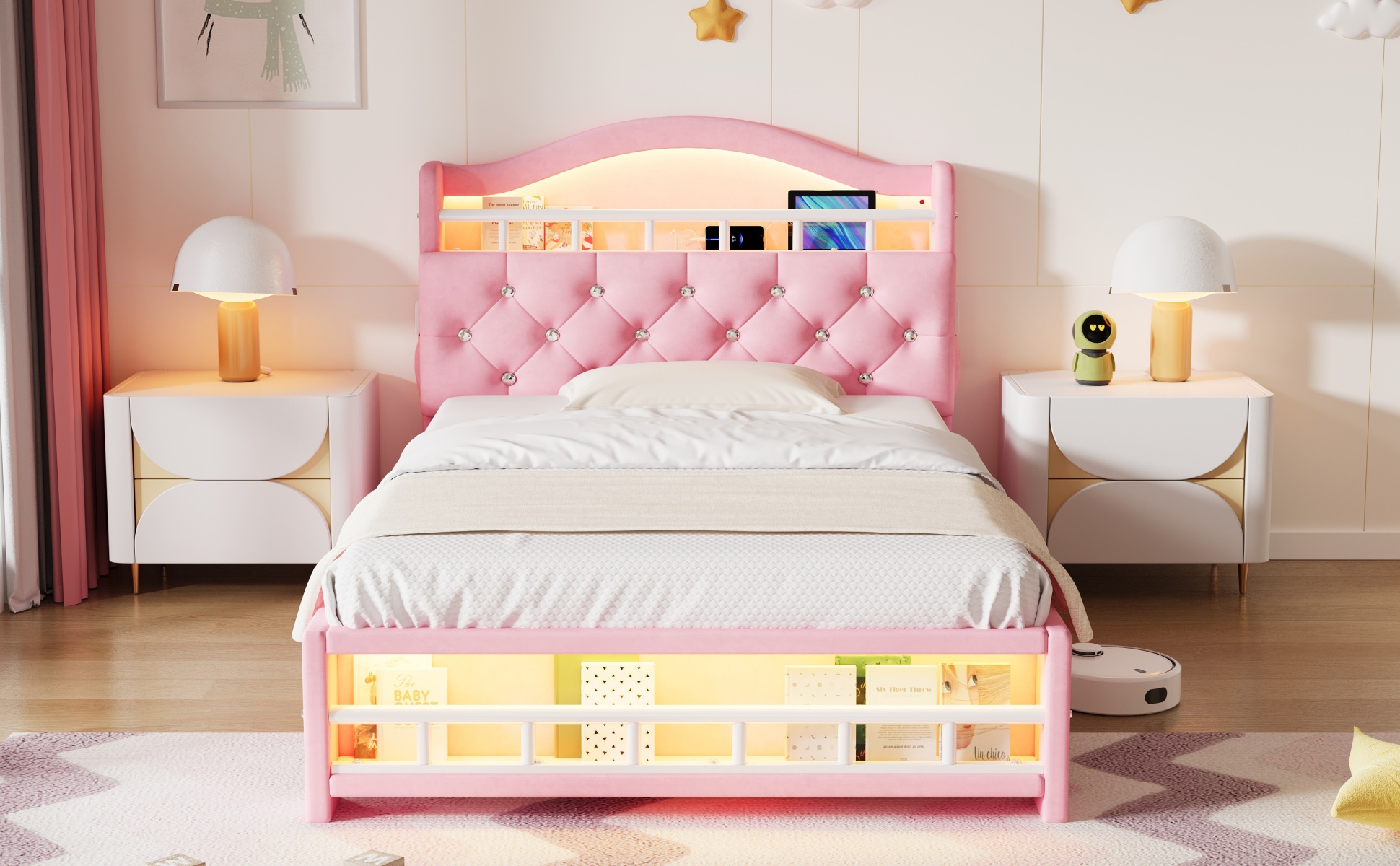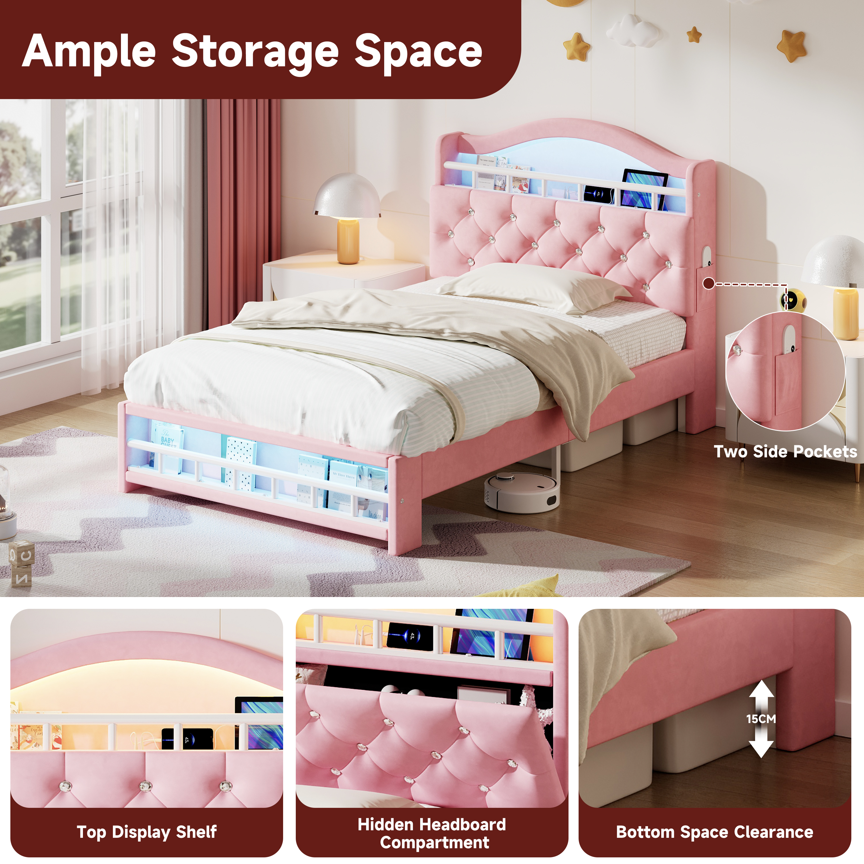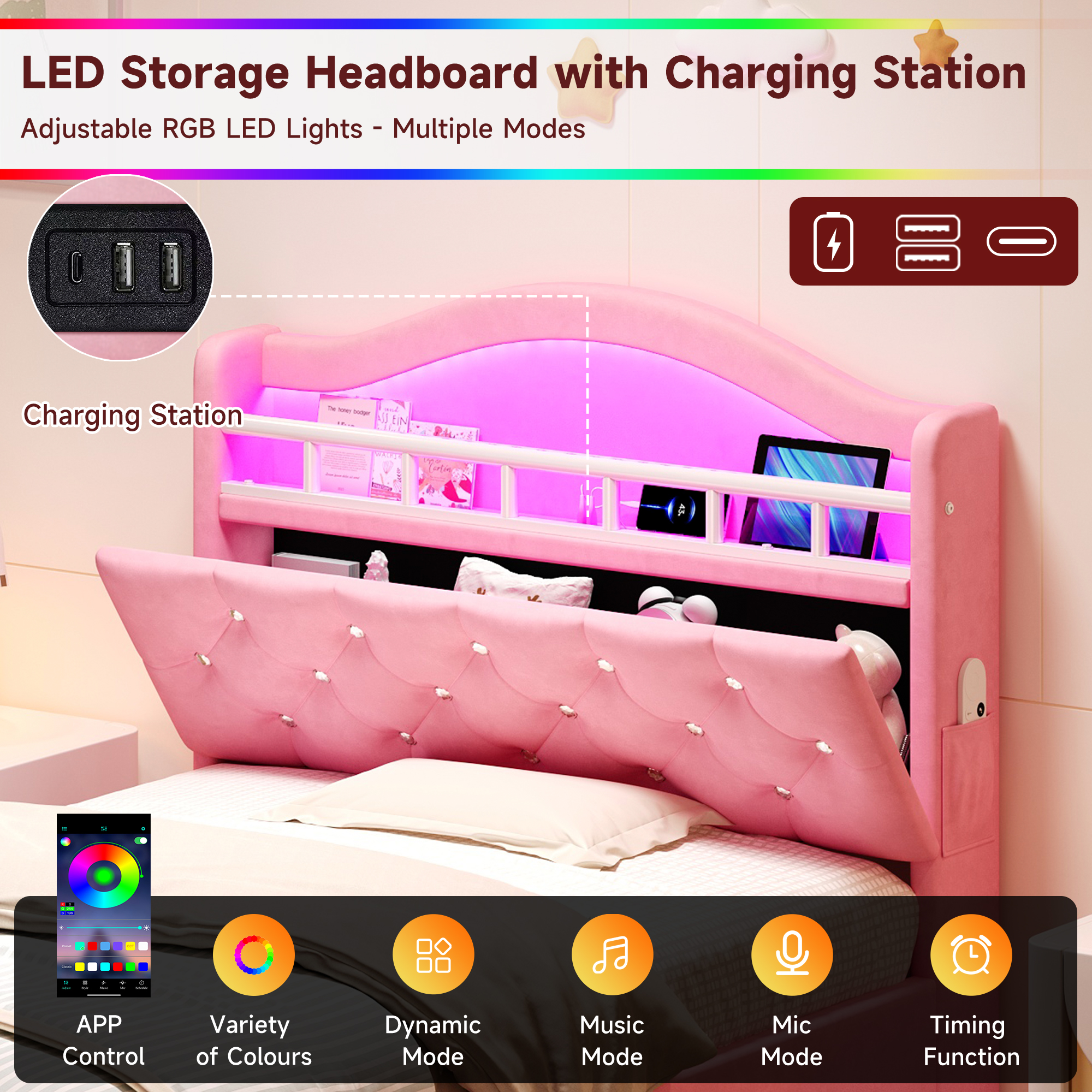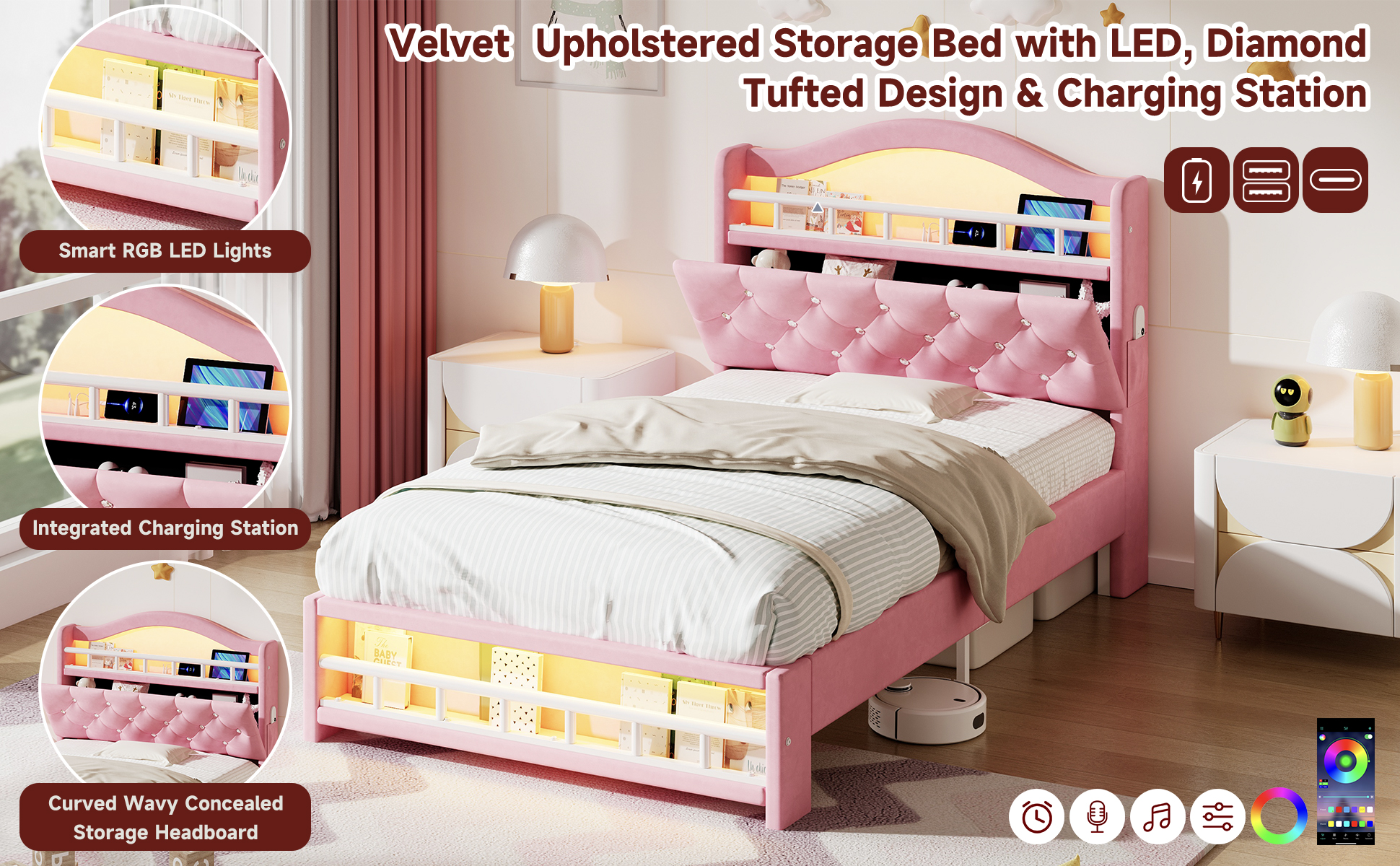 The girl bed with princess style,especially headboard with design lines,creating a romantic and glamorous vibe.Combination of hidden storage and open shelves,making sure that everything within easy reach you use frequently,keeping bedroom tidy. Its bedside equipped with Type-C port and USB ports to ensure your devices are always charged and ready to use. Combined colorful RGB LED lighting strips and button-tufted design, this upholstered bed frame can lend chic and subtle beauty to your bedroom. Velvet fabric features skin-friendly,breathable,soft touch,bring you and your family exceptional comfort Special Features: - Multi-zone Storage Space: hidden headboard storage & open shelves - Diamond Tufted Design - Smart RGB LED Lights - Charging Station:Type-C port & USB port - Soft velvet fabric and high resilience sponge - Easy assembly and care
