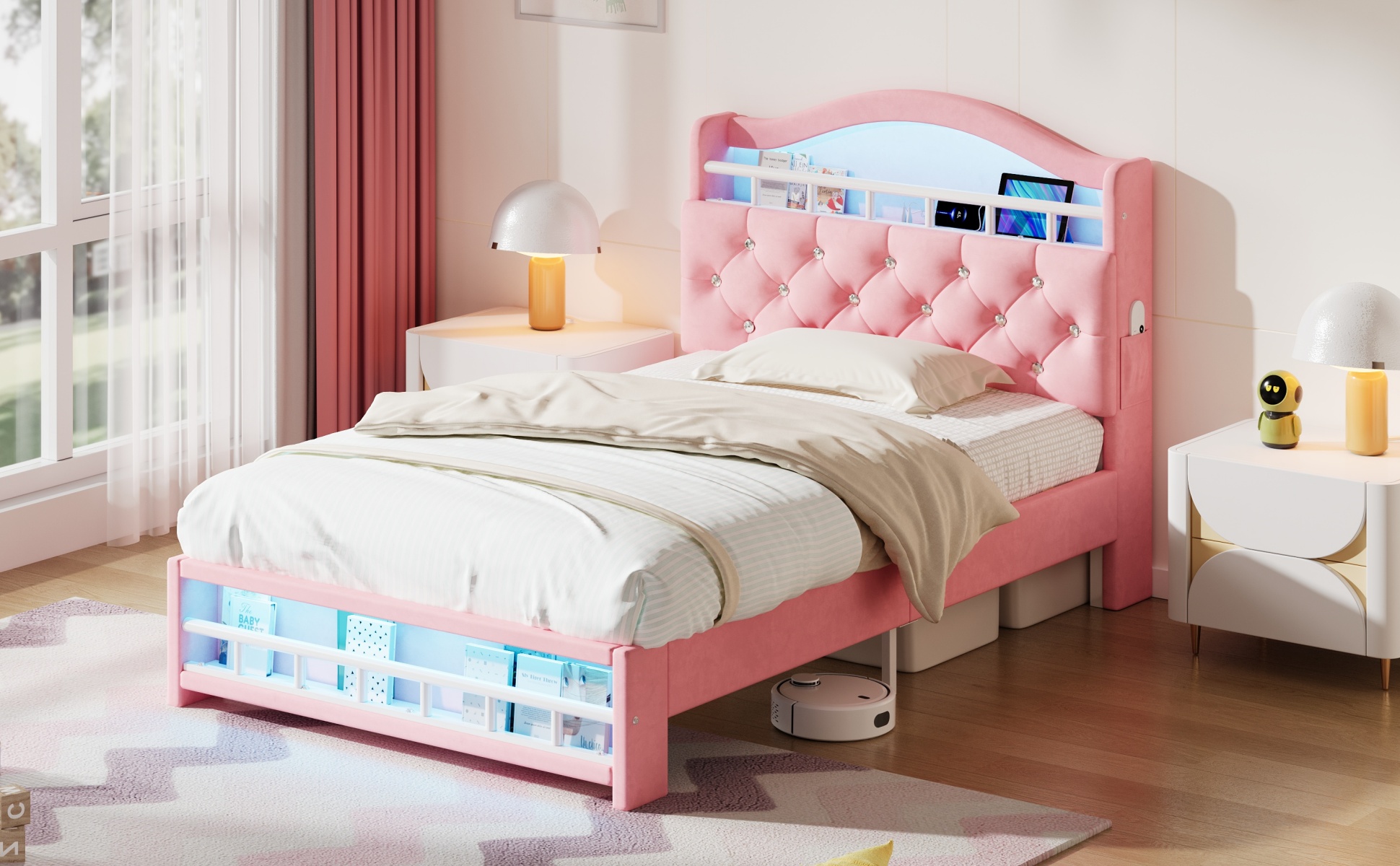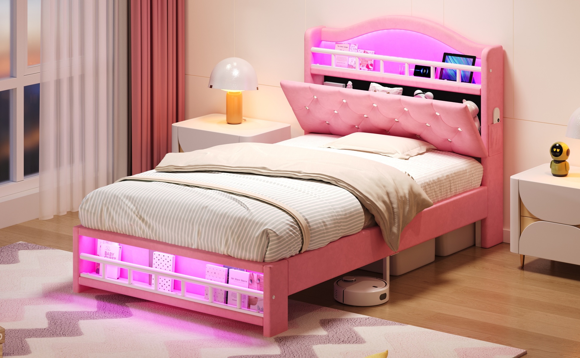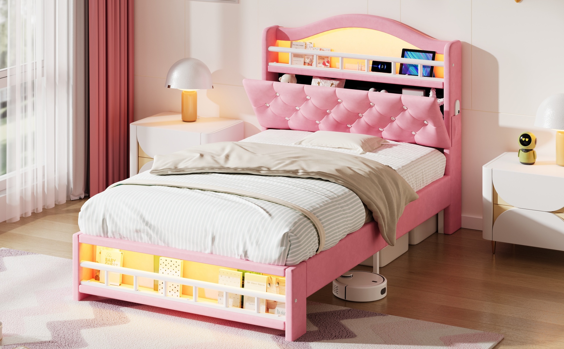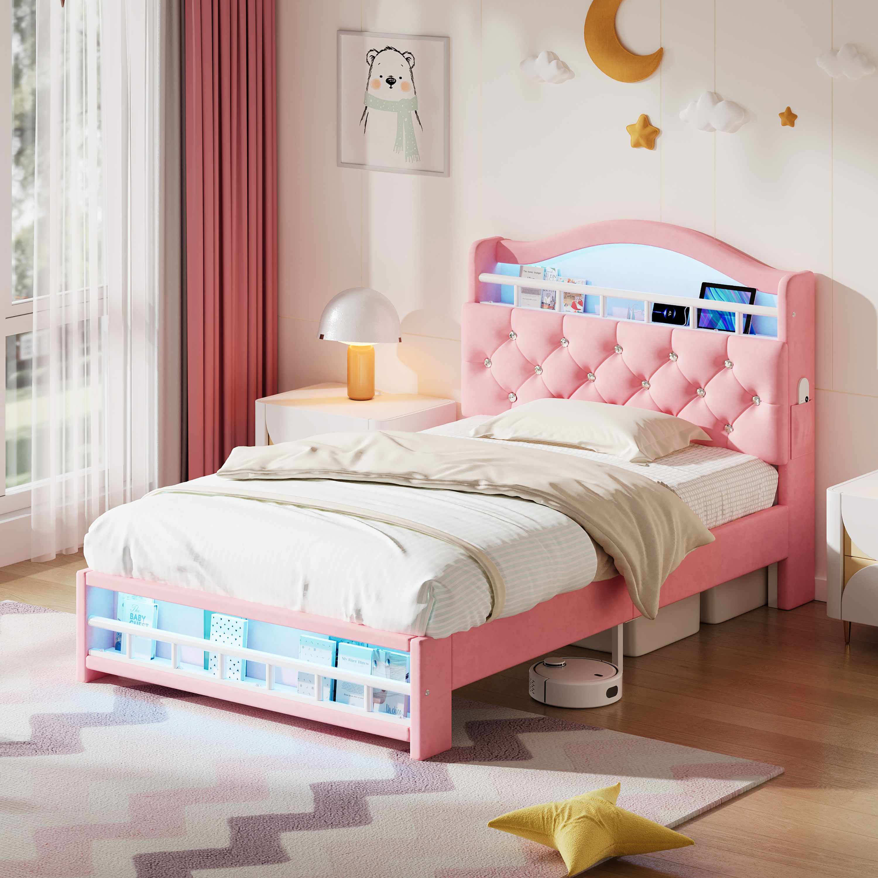 The girl bed with princess style,especially headboard with design lines,creating a romantic and glamorous vibe.Combination of hidden storage and open shelves,making sure that everything within easy reach you use frequently,keeping bedroom tidy. Its bedside equipped with Type-C port and USB ports to ensure your devices are always charged and ready to use. Combined colorful RGB LED lighting strips and button-tufted design, this upholstered bed frame can lend chic and subtle beauty to your bedroom. Velvet fabric features skin-friendly,breathable,soft touch,bring you and your family exceptional comfort Special Features: - Multi-zone Storage Space: hidden headboard storage & open shelves - Diamond Tufted Design - Smart RGB LED Lights - Charging Station:Type-C port & USB port - Soft velvet fabric and high resilience sponge - Easy assembly and care