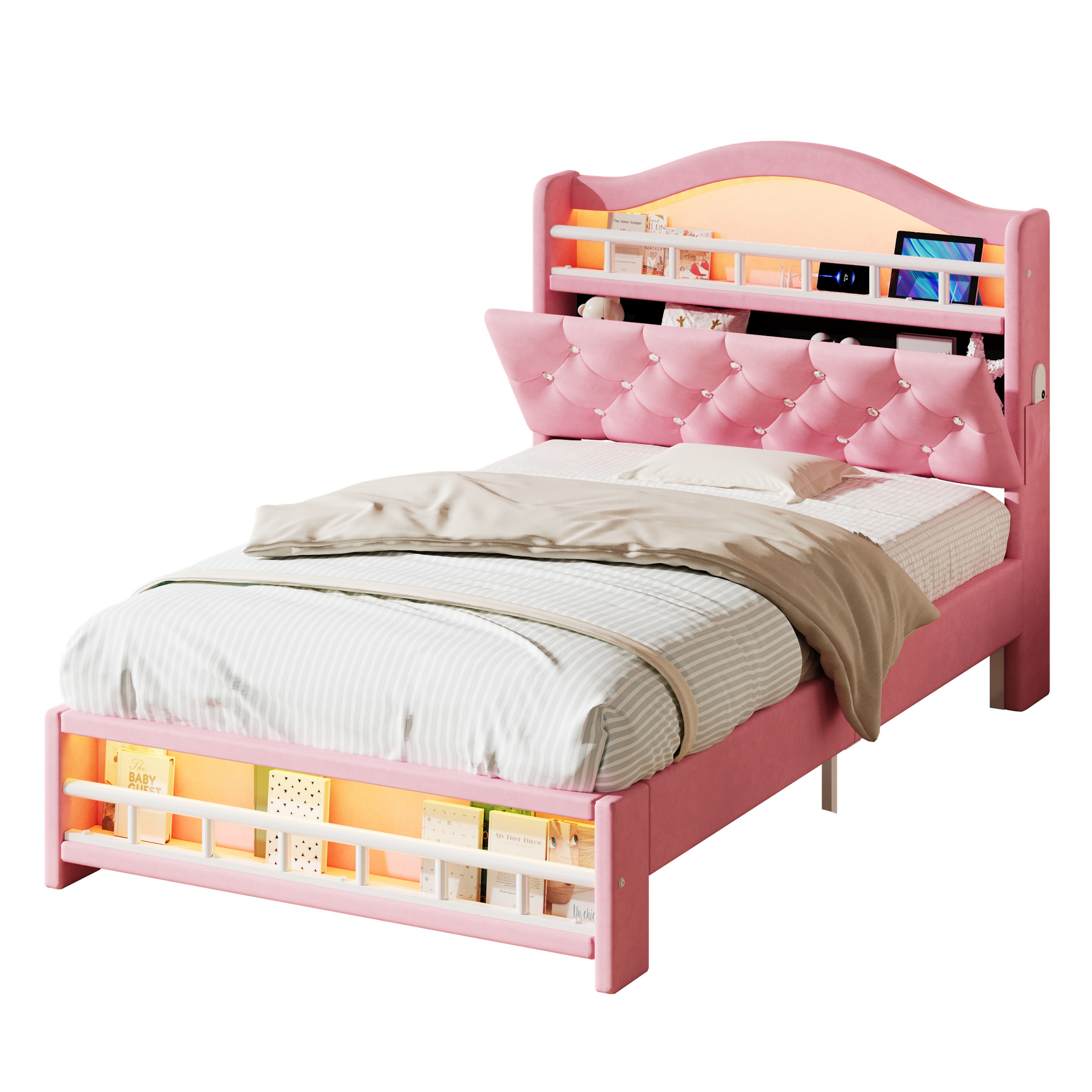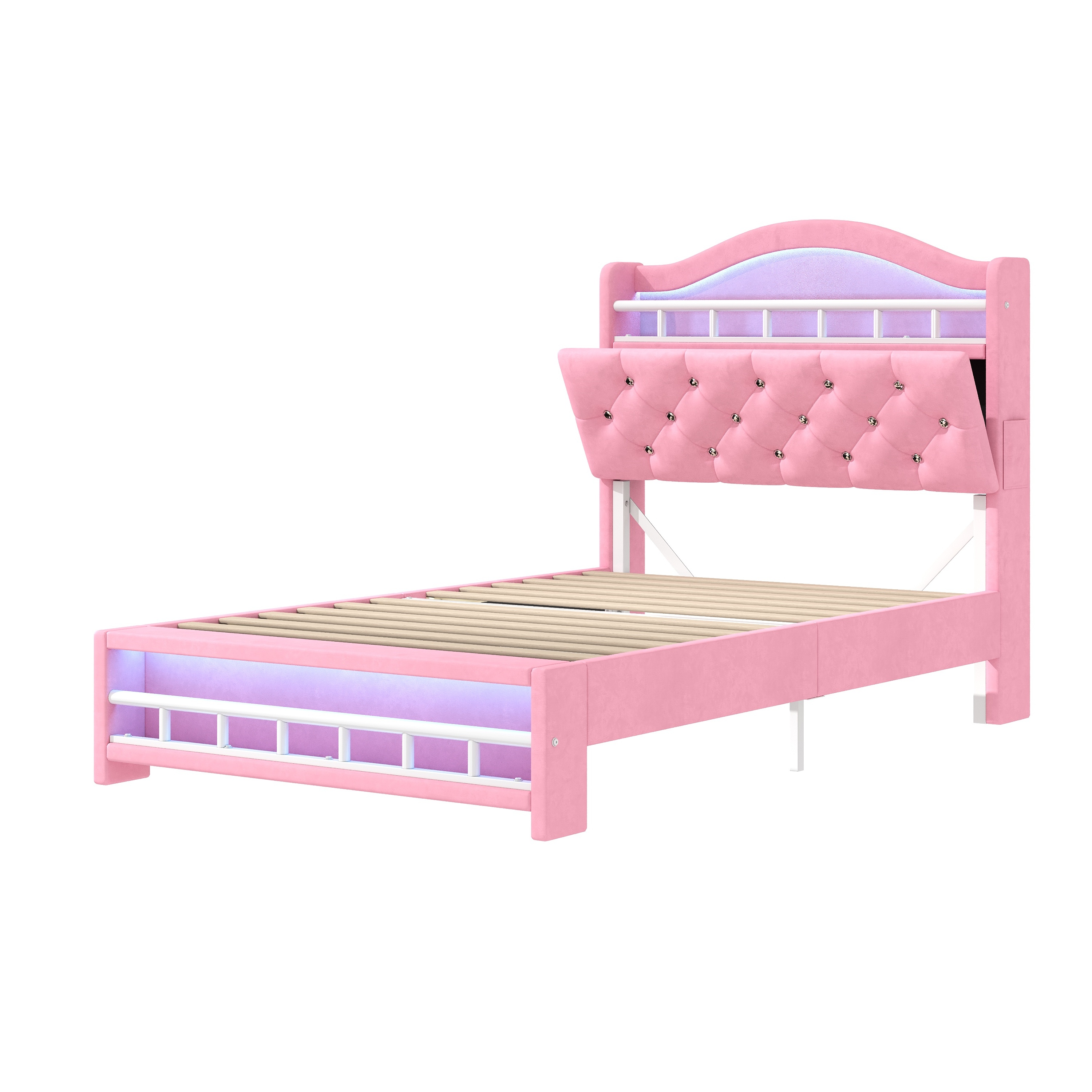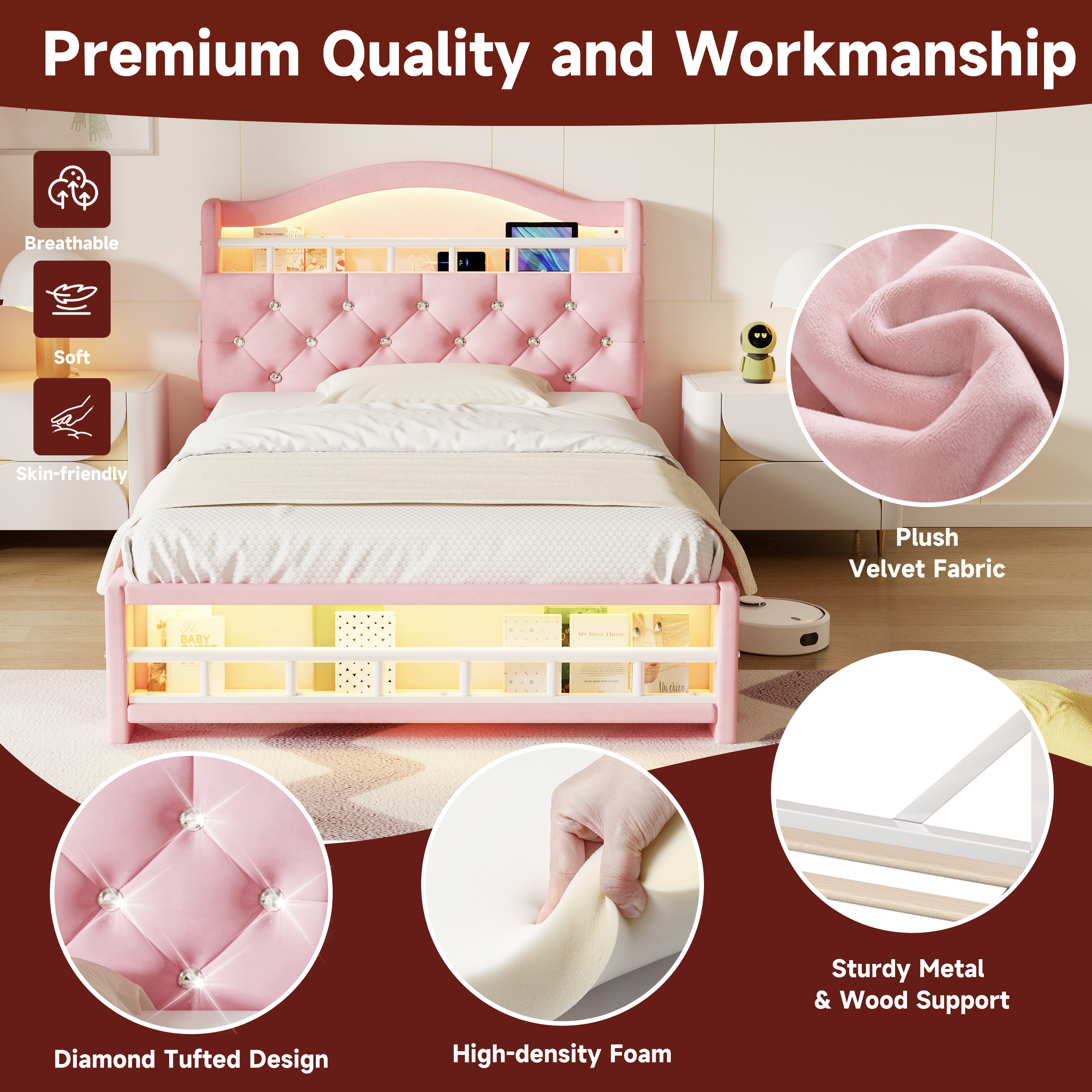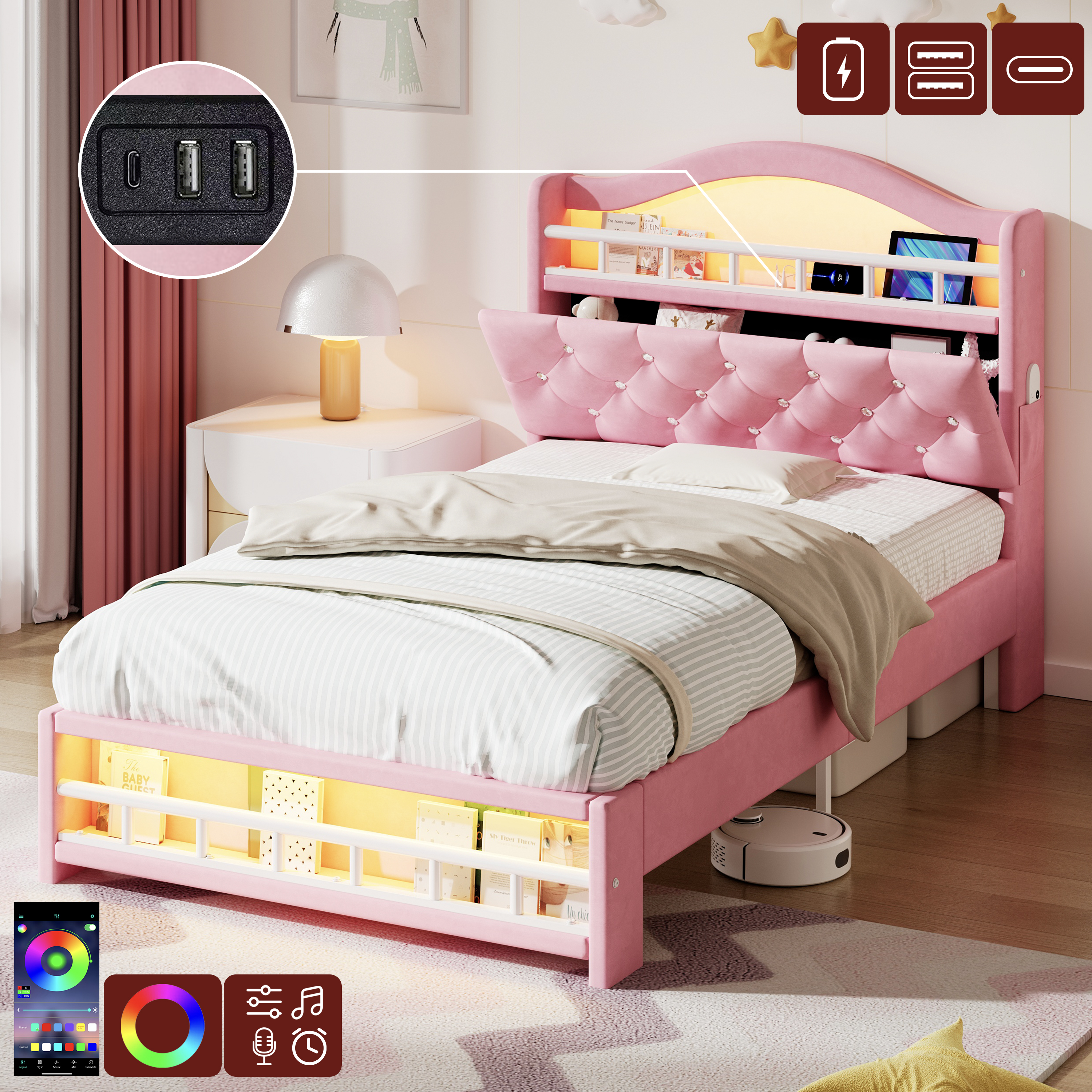 The girl bed with princess style,especially headboard with design lines,creating a romantic and glamorous vibe.Combination of hidden storage and open shelves,making sure that everything within easy reach you use frequently,keeping bedroom tidy. Its bedside equipped with Type-C port and USB ports to ensure your devices are always charged and ready to use. Combined colorful RGB LED lighting strips and button-tufted design, this upholstered bed frame can lend chic and subtle beauty to your bedroom. Velvet fabric features skin-friendly,breathable,soft touch,bring you and your family exceptional comfort Special Features: - Multi-zone Storage Space: hidden headboard storage & open shelves - Diamond Tufted Design - Smart RGB LED Lights - Charging Station:Type-C port & USB port - Soft velvet fabric and high resilience sponge - Easy assembly and care