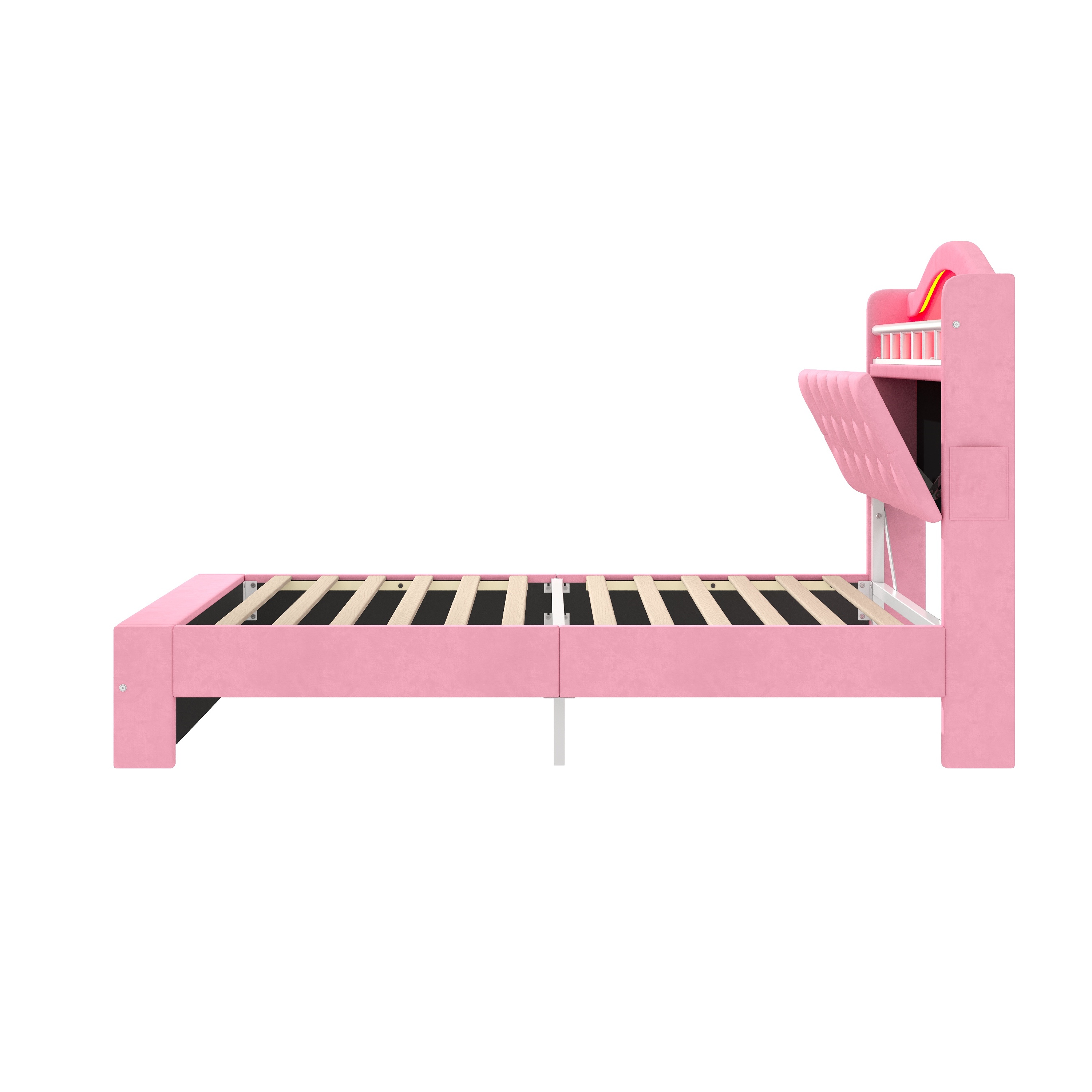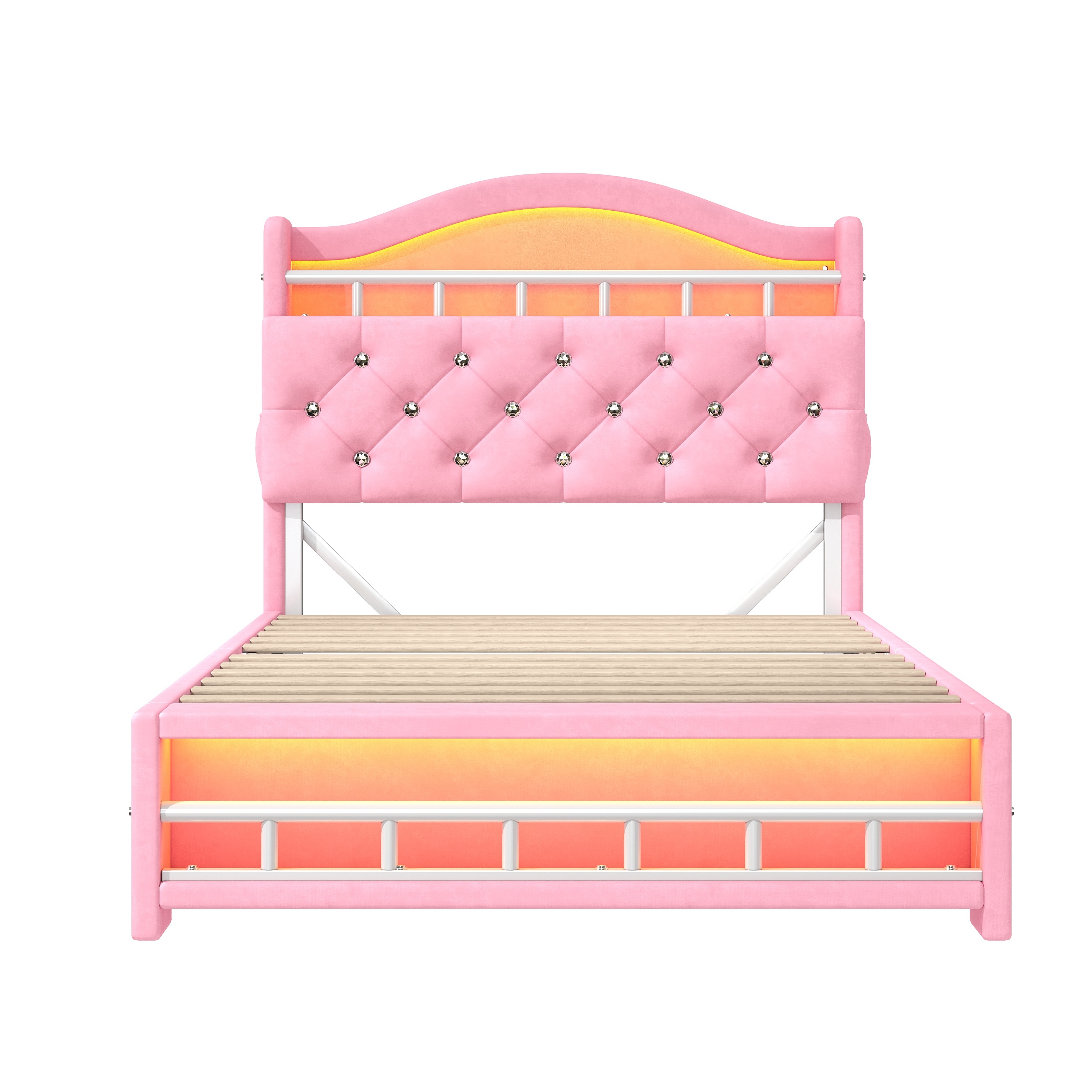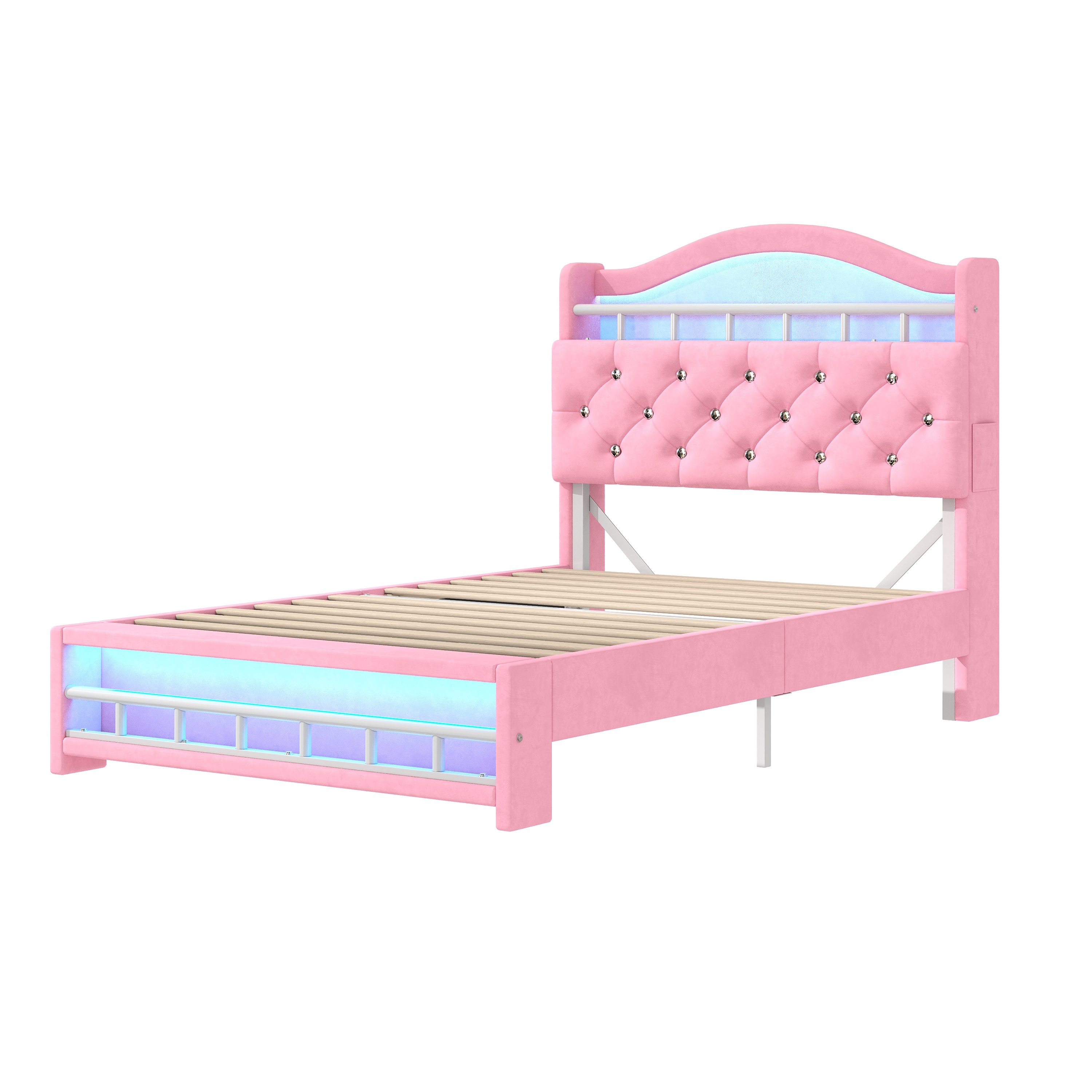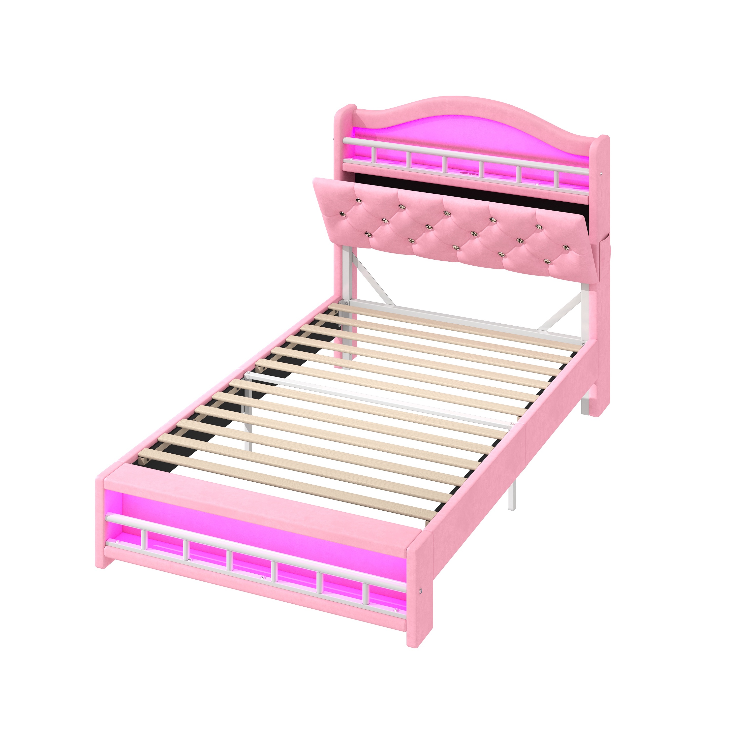 The girl bed with princess style,especially headboard with design lines,creating a romantic and glamorous vibe.Combination of hidden storage and open shelves,making sure that everything within easy reach you use frequently,keeping bedroom tidy. Its bedside equipped with Type-C port and USB ports to ensure your devices are always charged and ready to use. Combined colorful RGB LED lighting strips and button-tufted design, this upholstered bed frame can lend chic and subtle beauty to your bedroom. Velvet fabric features skin-friendly,breathable,soft touch,bring you and your family exceptional comfort Special Features: - Multi-zone Storage Space: hidden headboard storage & open shelves - Diamond Tufted Design - Smart RGB LED Lights - Charging Station:Type-C port & USB port - Soft velvet fabric and high resilience sponge - Easy assembly and care