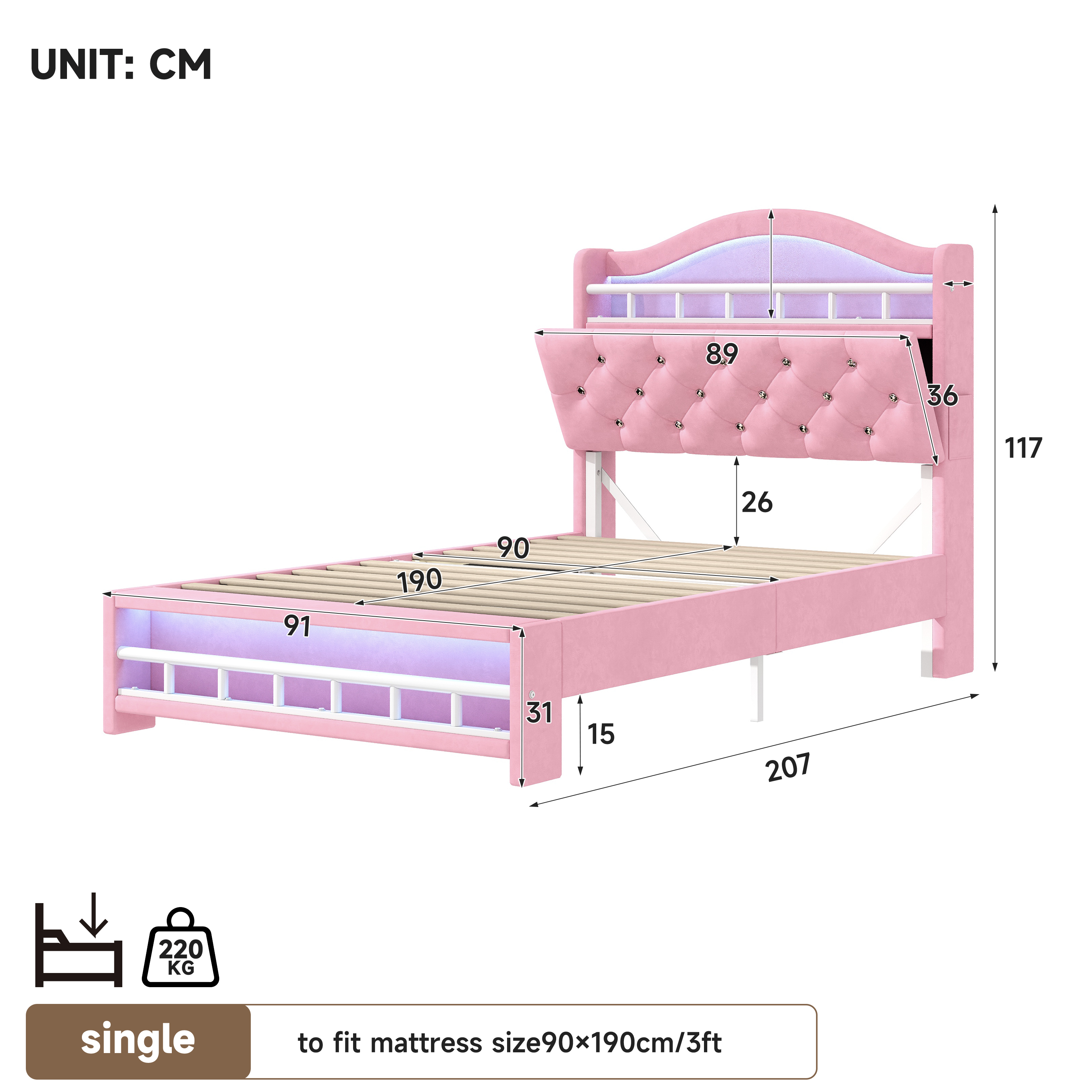 Product Name:3ft Single Upholstered Velvet Bed Frame, LED Bed Frame with Charging Station & Diamond Tufted Headboard, Concealed Headboard Storage with USB and Type - C Ports, Easy Assembly, Pink (No Mattress)