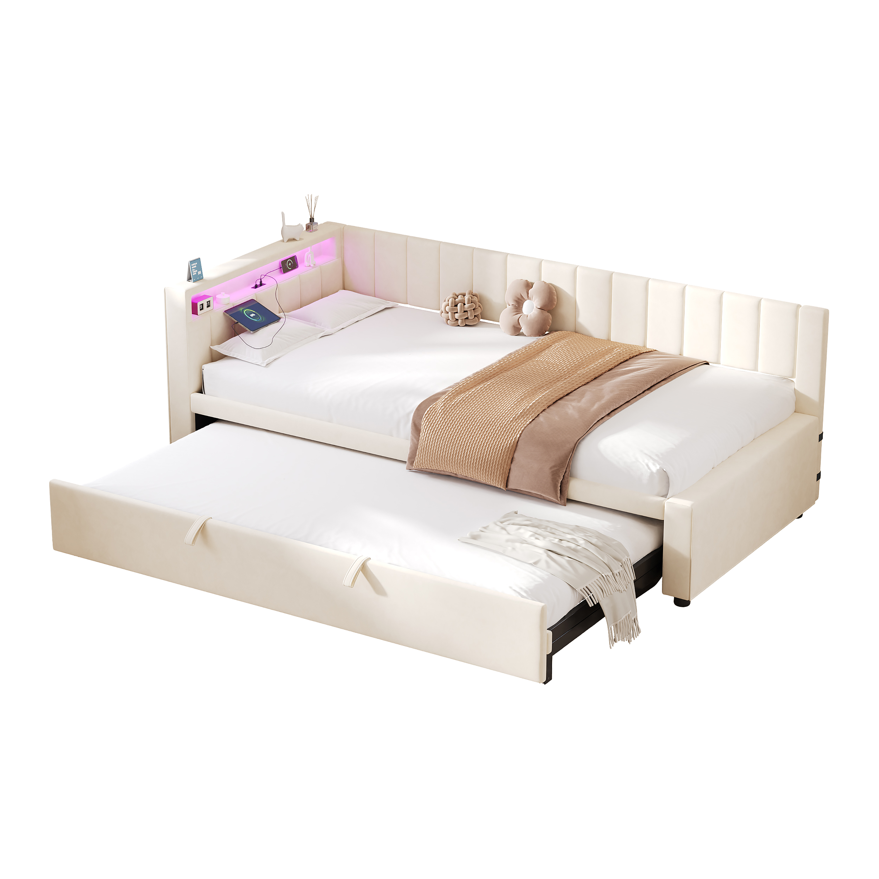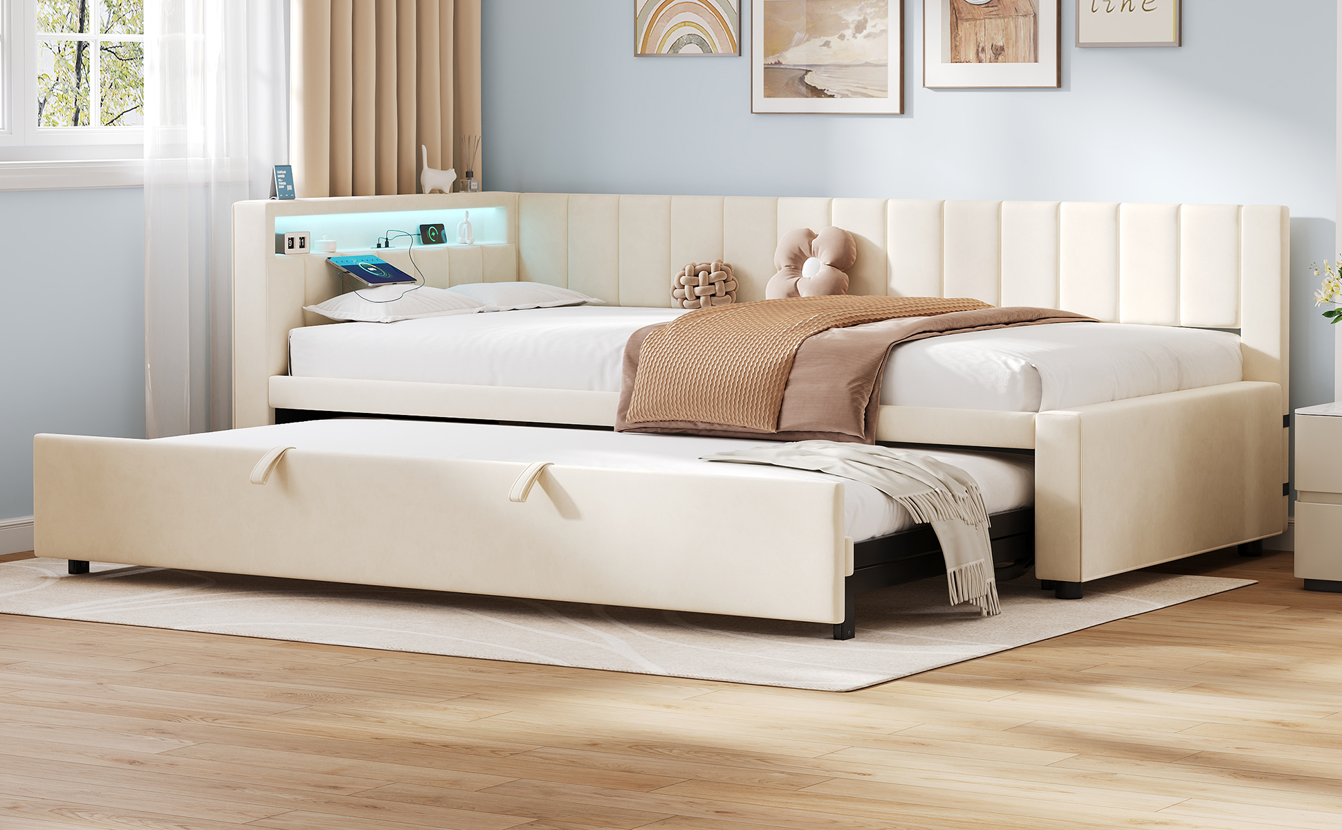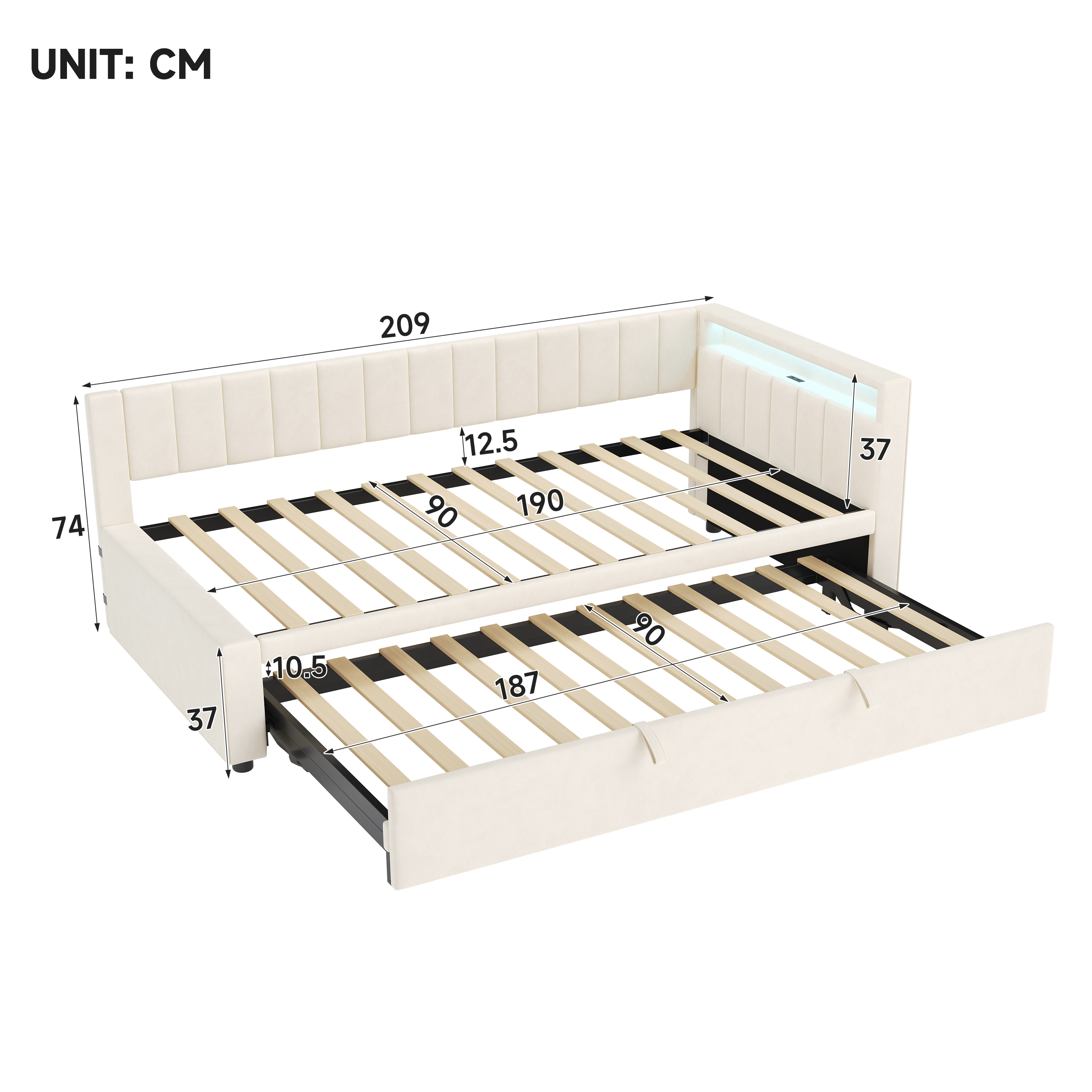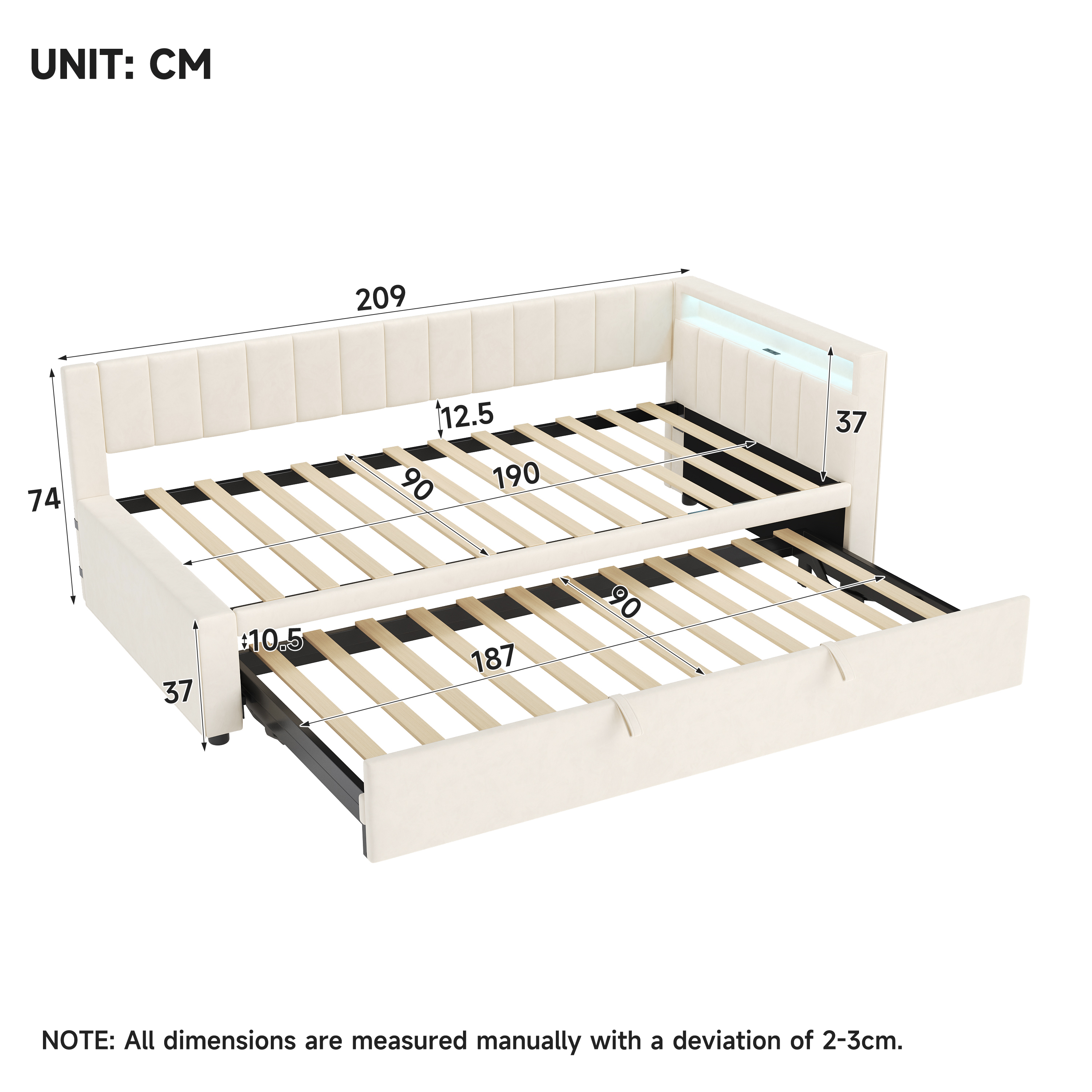 Product Name:3ft Single Velvet Daybed, Sofa Bed with RGB LED Lights and Charging Station, Upholstered Sofa Bed with Trundle, Pull out Trundle Bed for Living Room, Bedroom or Study, Beige (No Mattress)