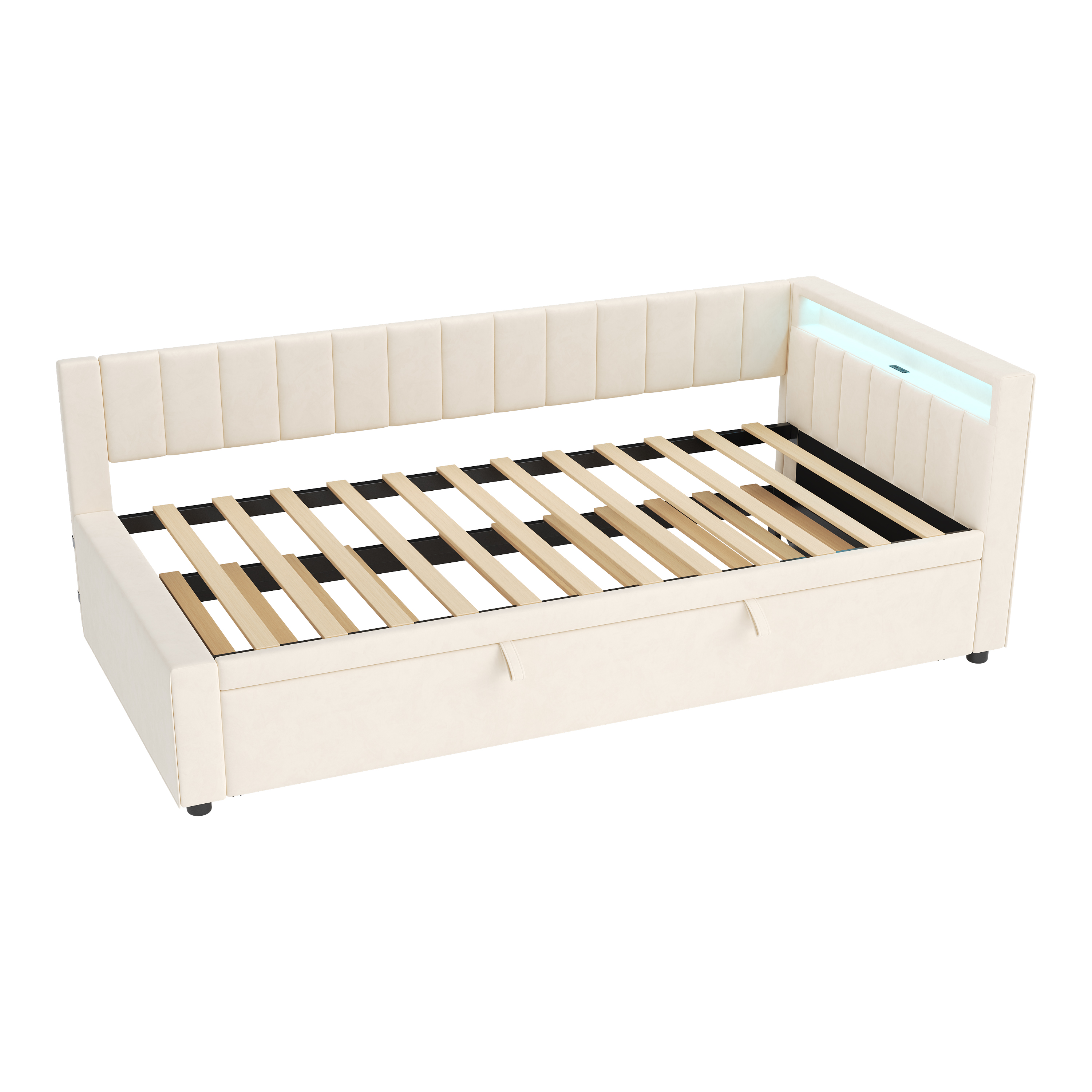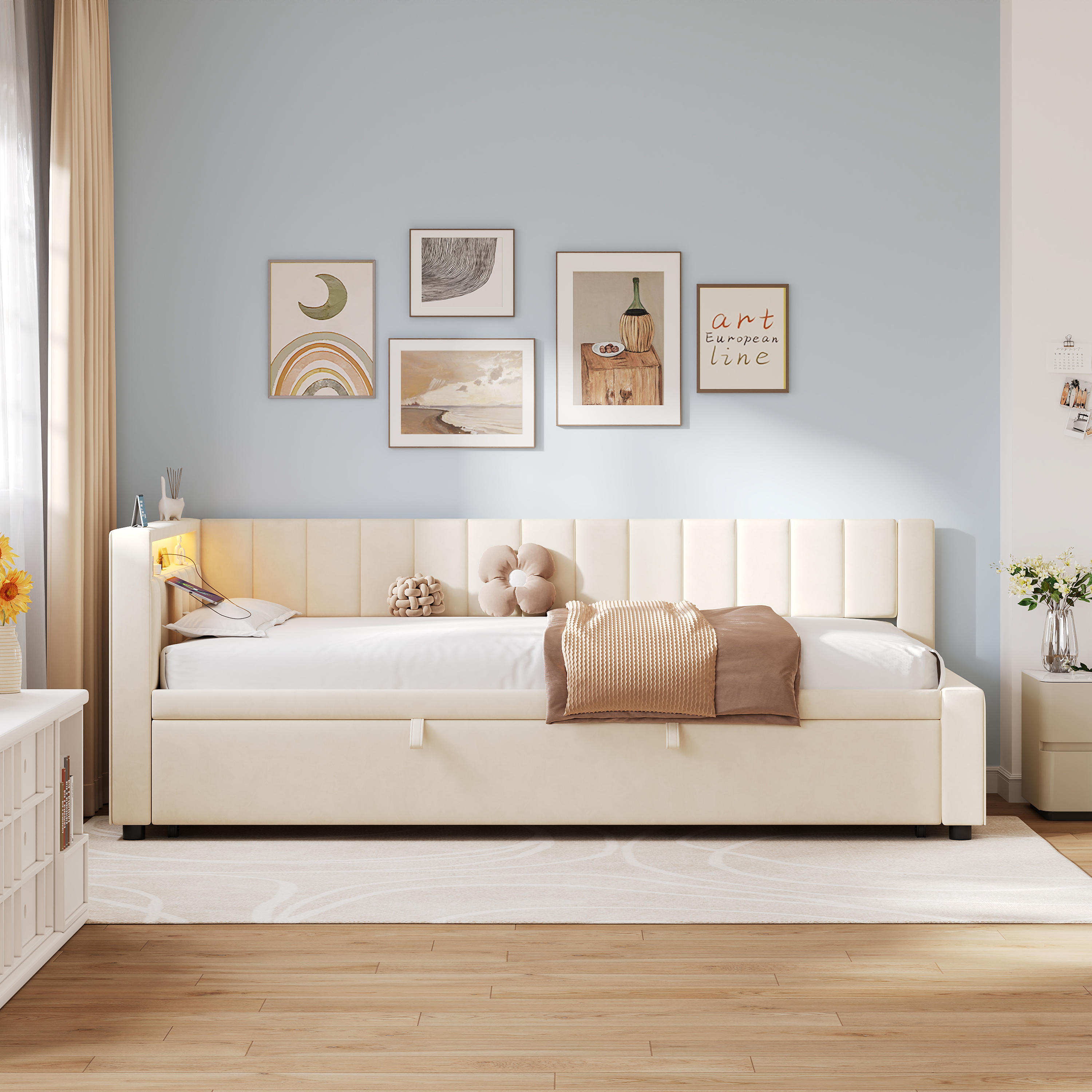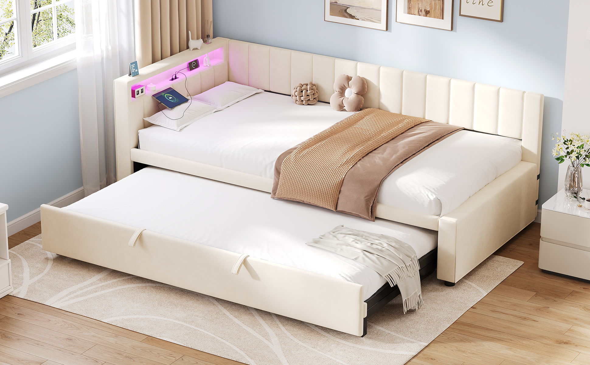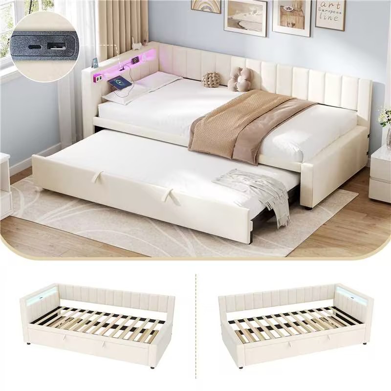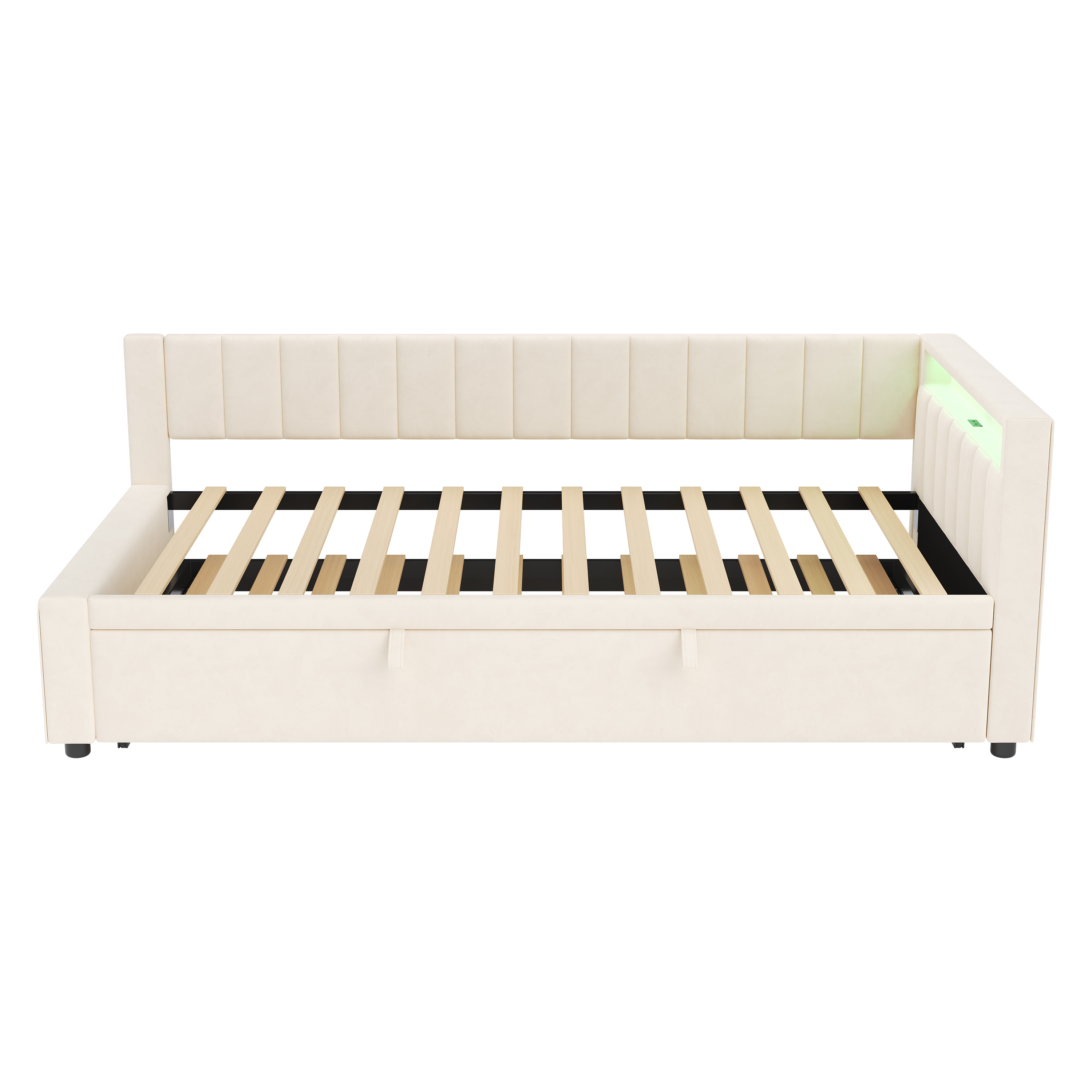 Product Name:3ft Single Velvet Daybed, Sofa Bed with RGB LED Lights and Charging Station, Upholstered Sofa Bed with Trundle, Pull out Trundle Bed for Living Room, Bedroom or Study, Beige (No Mattress)