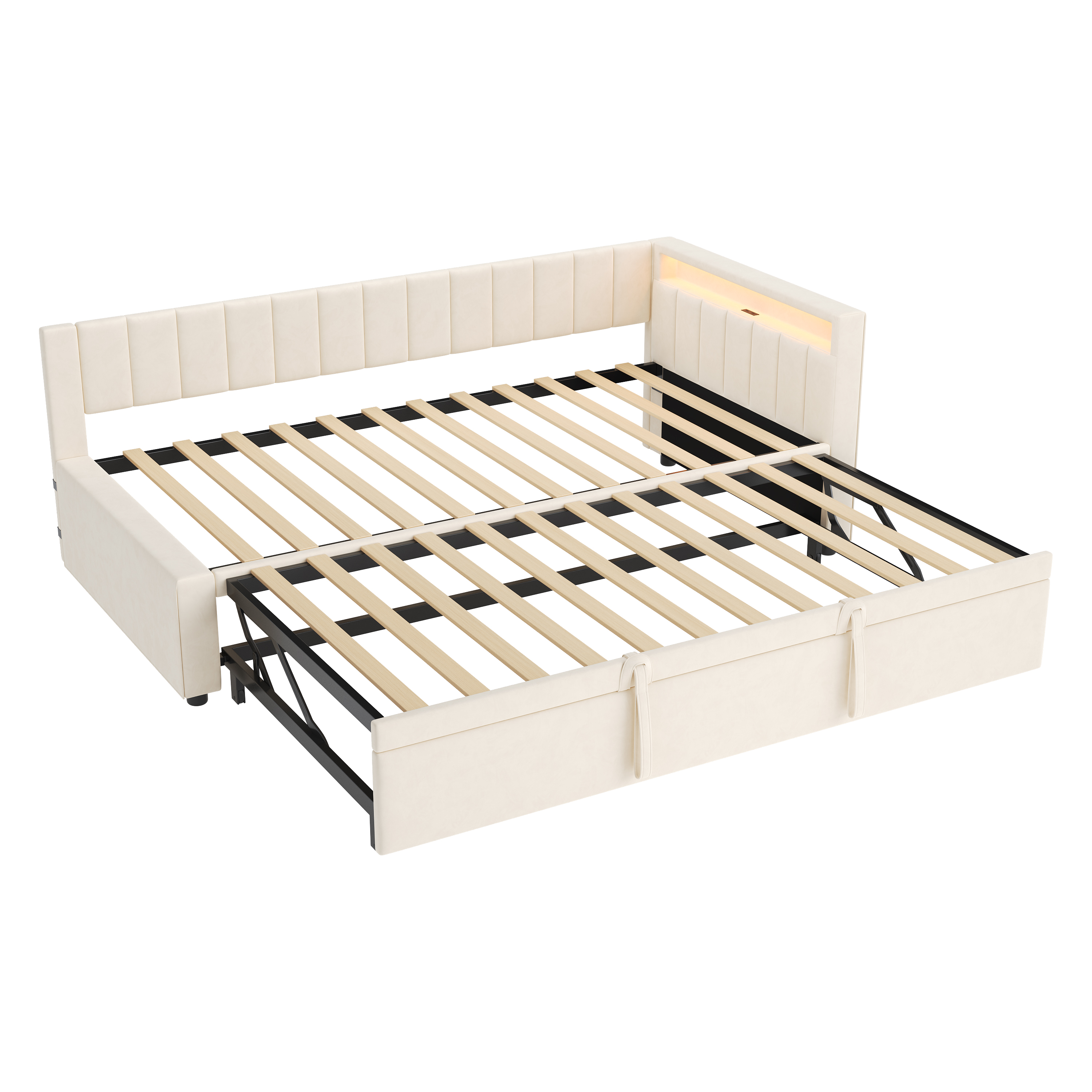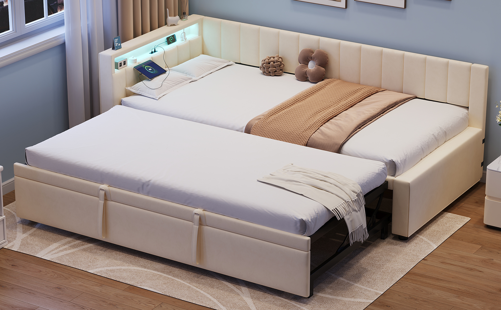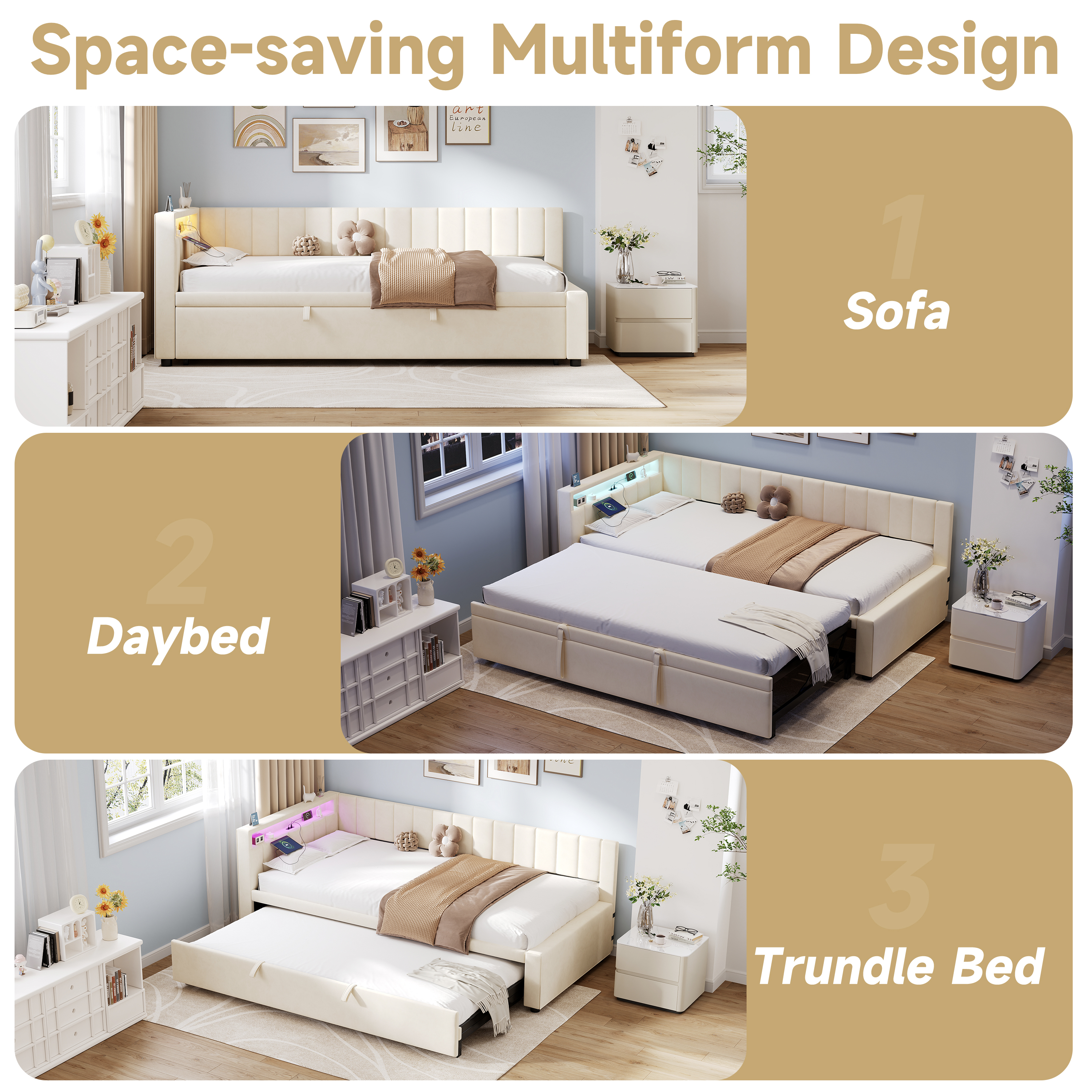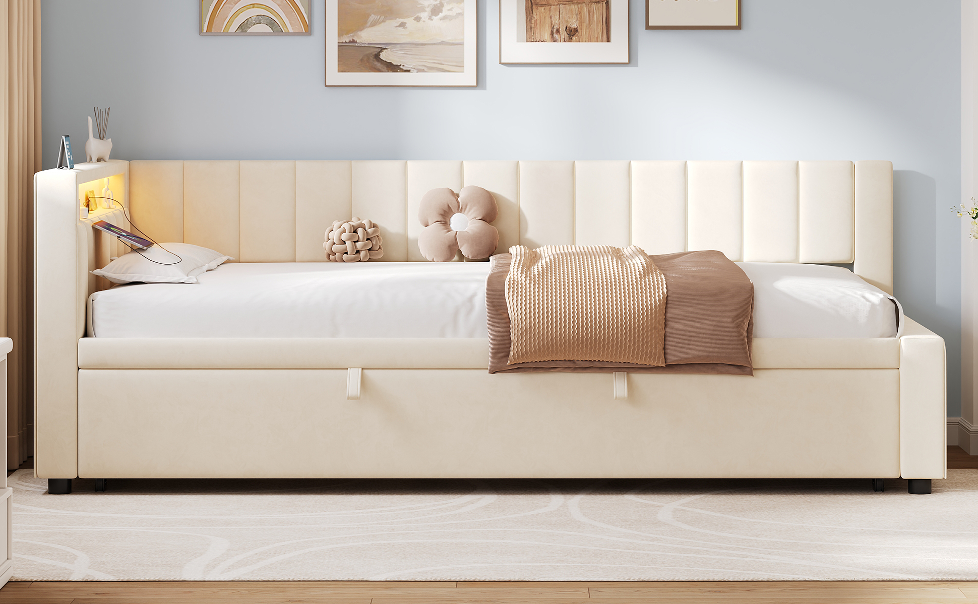 Product Name:3ft Single Velvet Daybed, Sofa Bed with RGB LED Lights and Charging Station, Upholstered Sofa Bed with Trundle, Pull out Trundle Bed for Living Room, Bedroom or Study, Beige (No Mattress)
