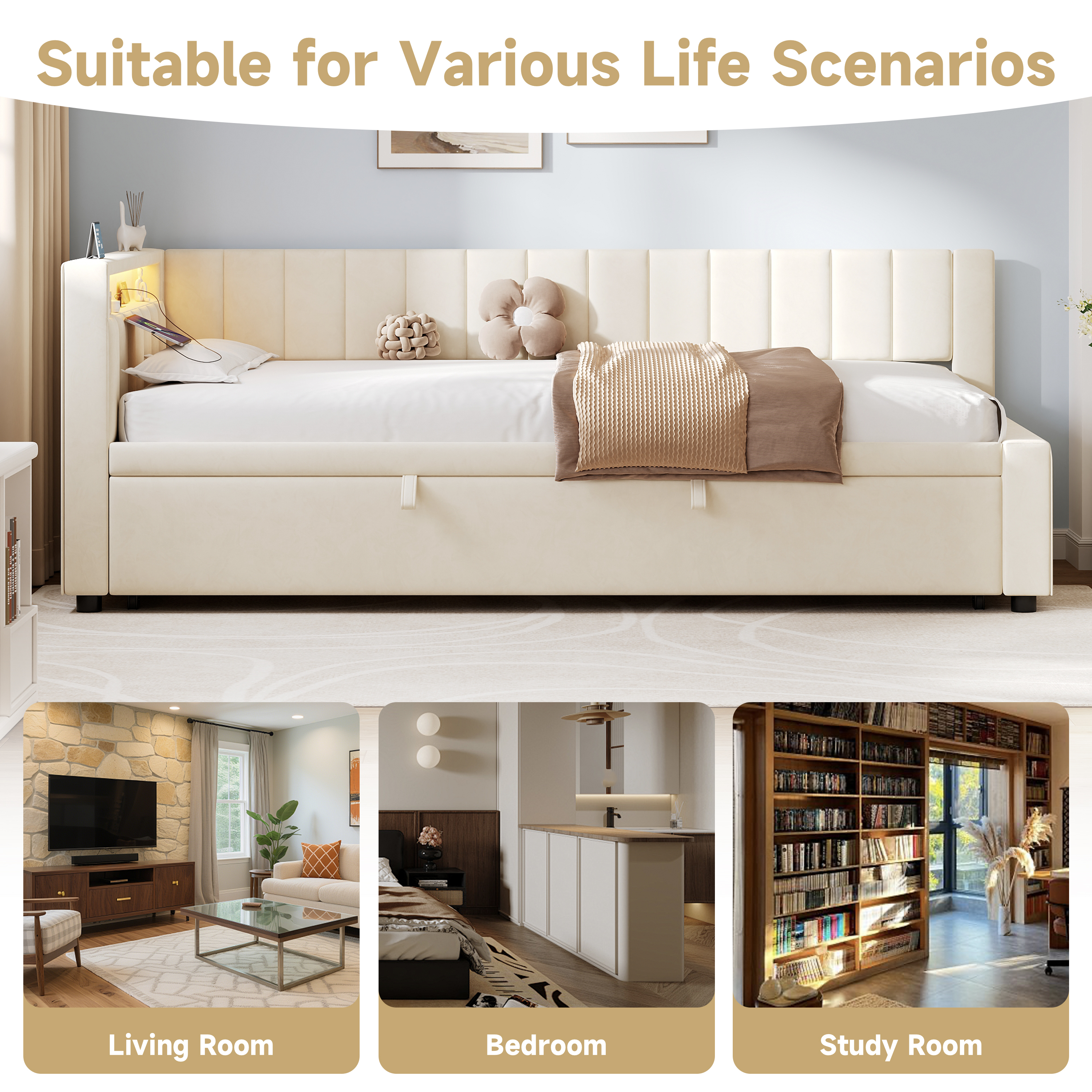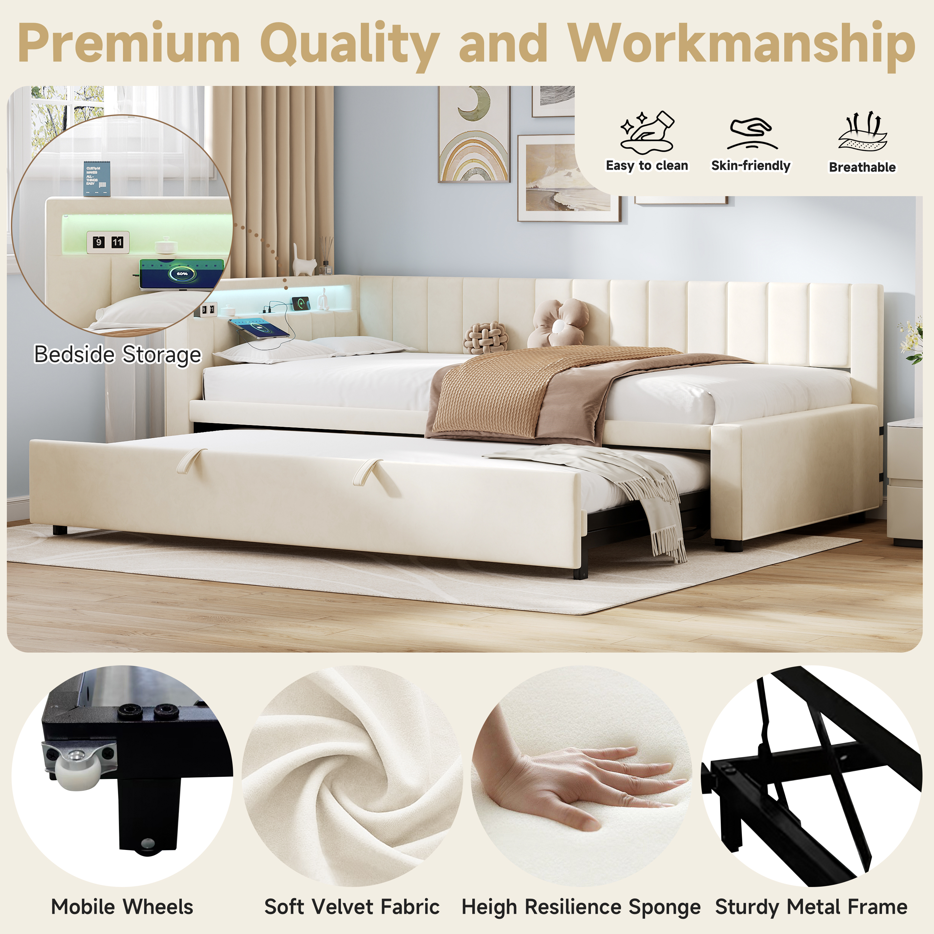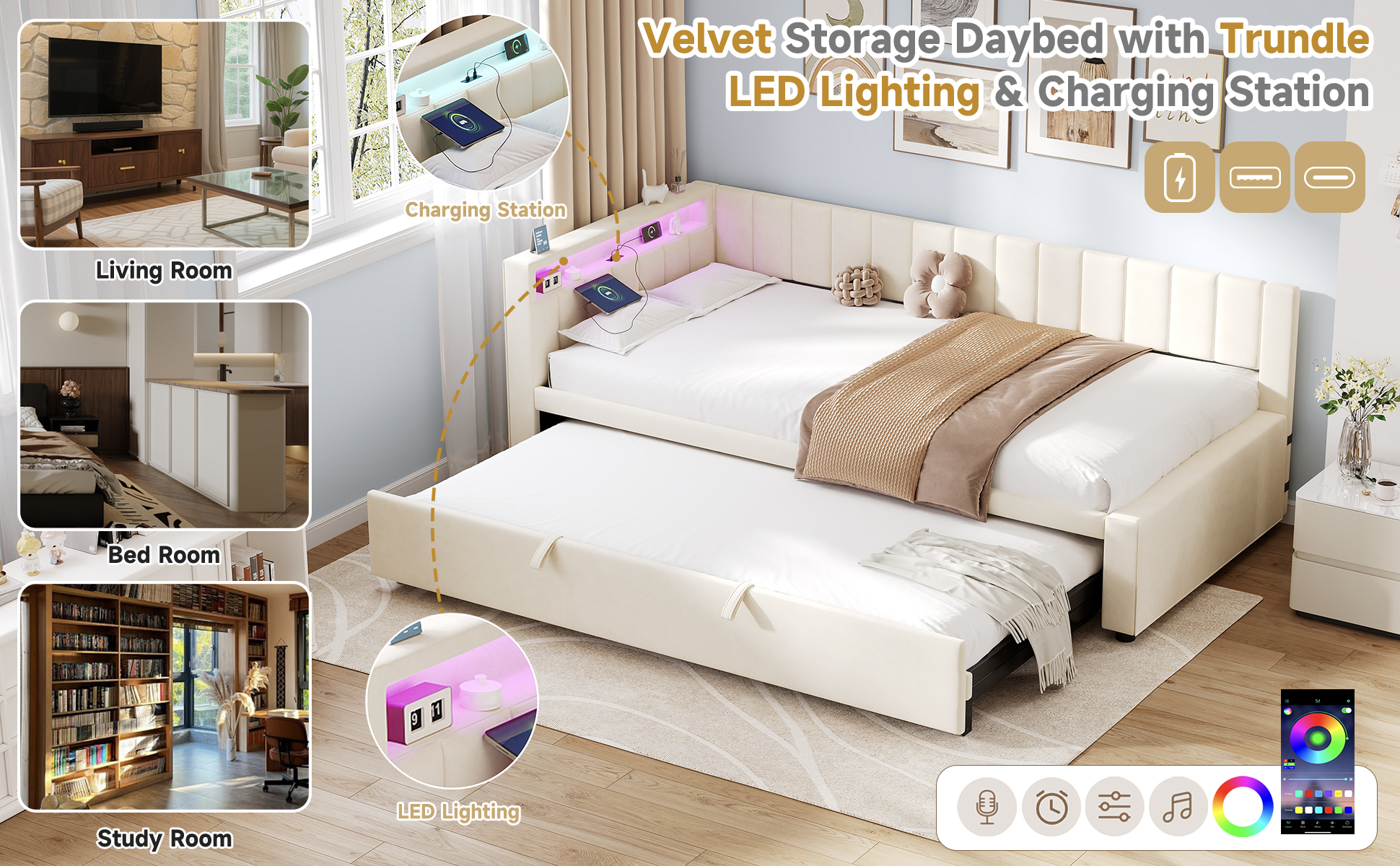 This multifunctional velvet daybed seamlessly combines modern technology with practical design. Featuring an integrated charging station and app-controlled LED lighting, it offers a smart solution for contemporary living. The space-saving trundle design allows for easy conversion between a stylish sofa and a comfortable sleeping area, making it suitable for various scenarios such as living rooms, bedrooms, or study rooms. Wrapped in luxurious velvet with a sturdy frame, this bed delivers both style and durability for any modern home. Special Features: - Charging station - App-controlled RGB LED lighting - Beside storage - Skin-friendly velvet and high resilience sponge - Smooth-gliding wheels for easy conversion - Sturdy metal and wood support frame - Two assembly methods - Space-saving multiform design