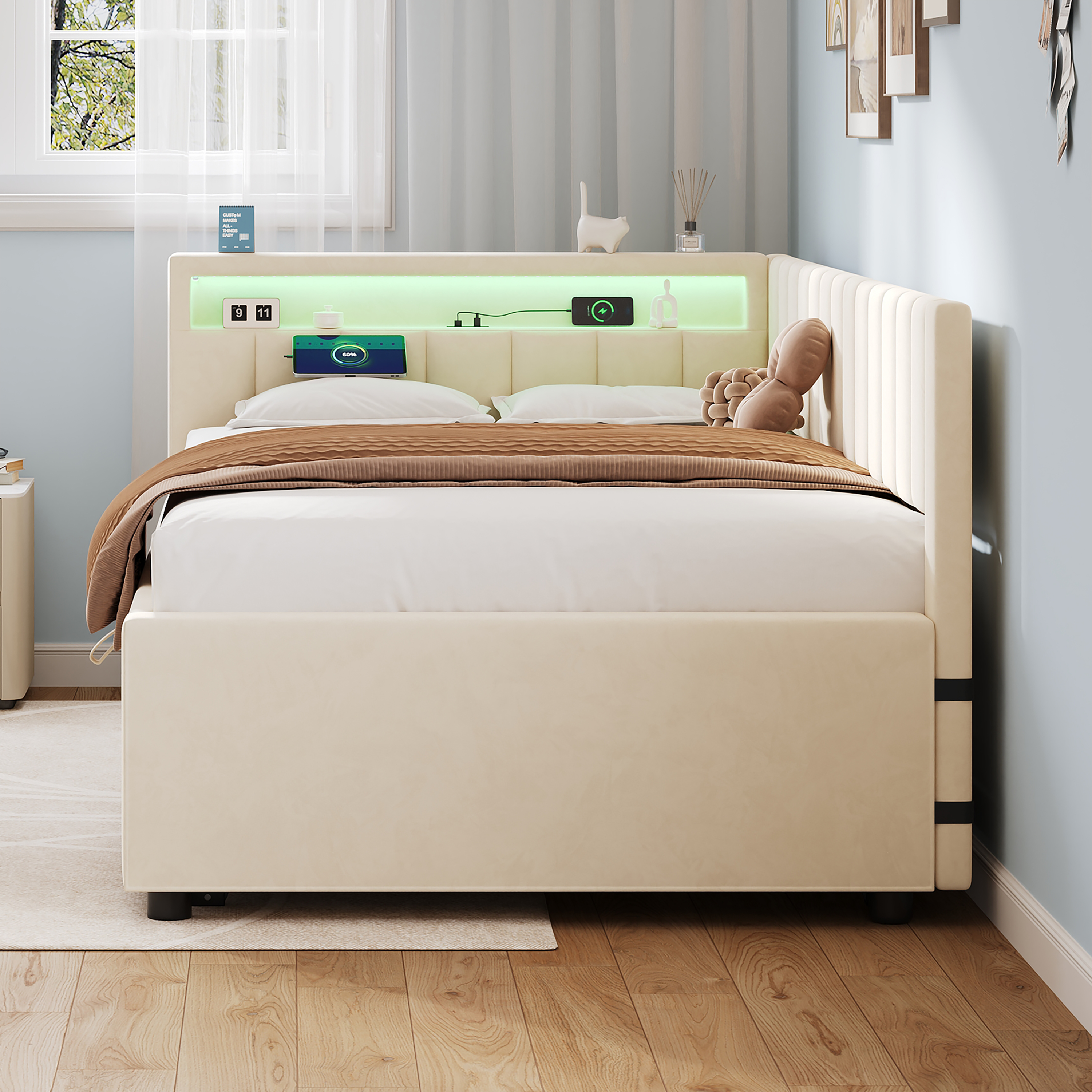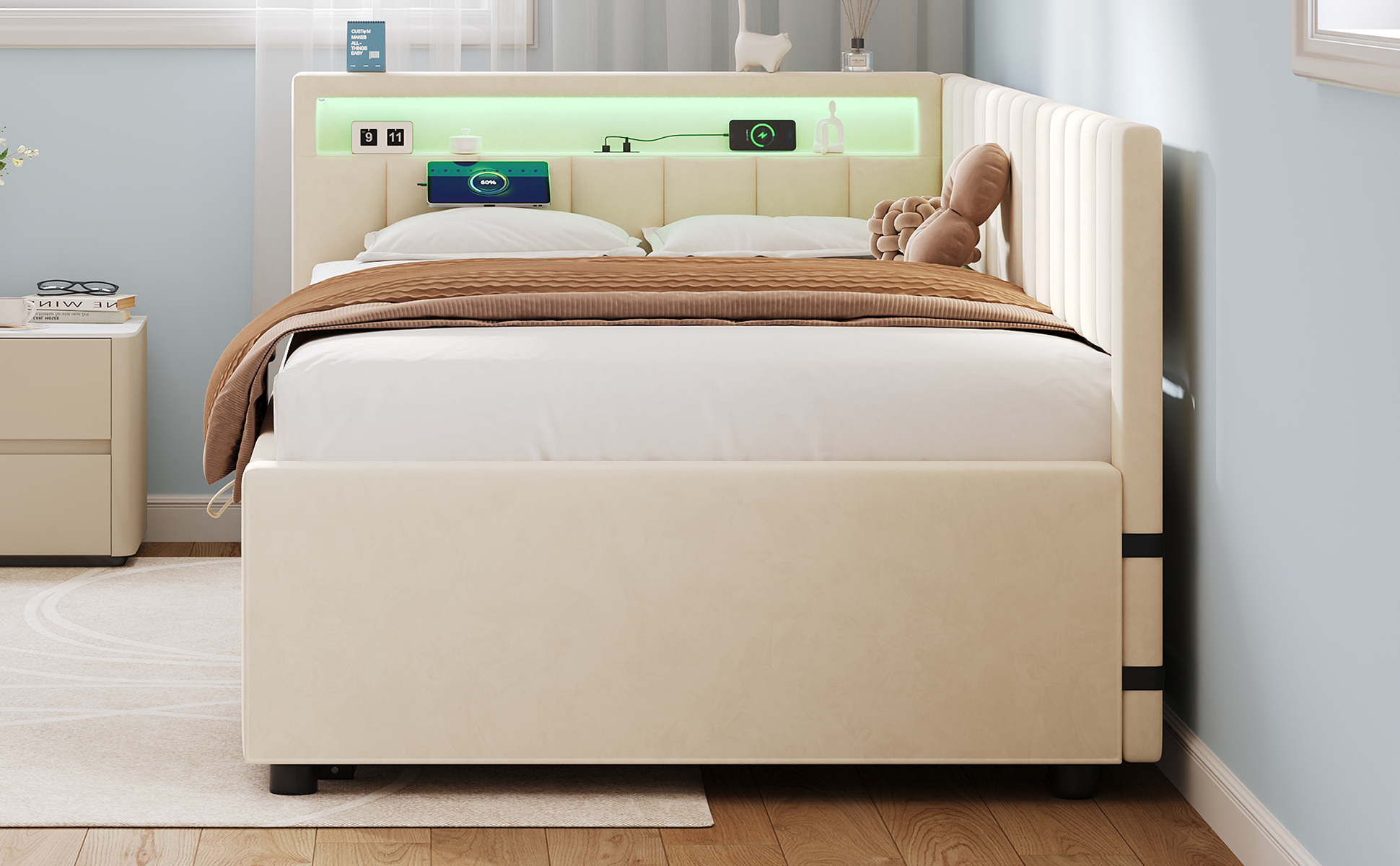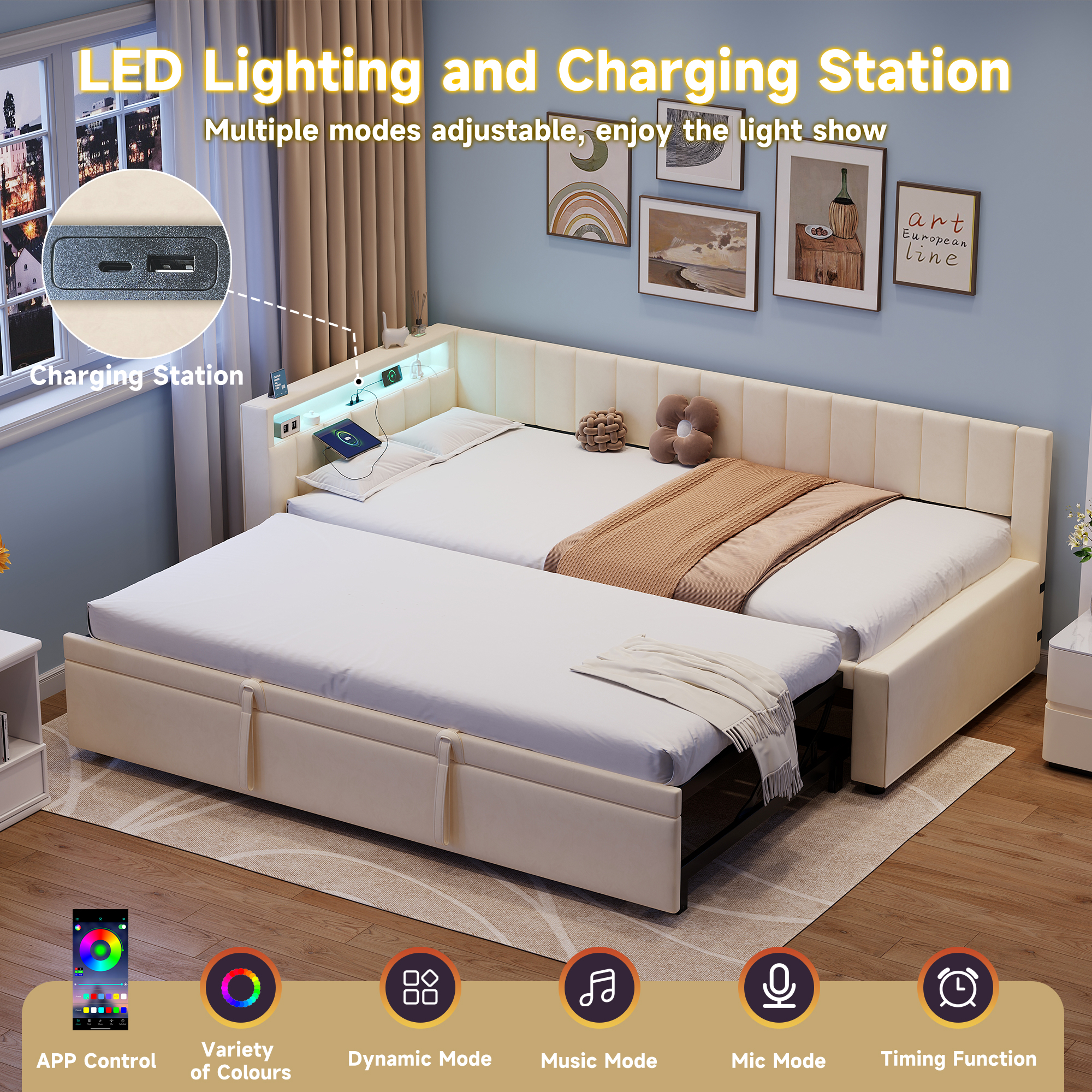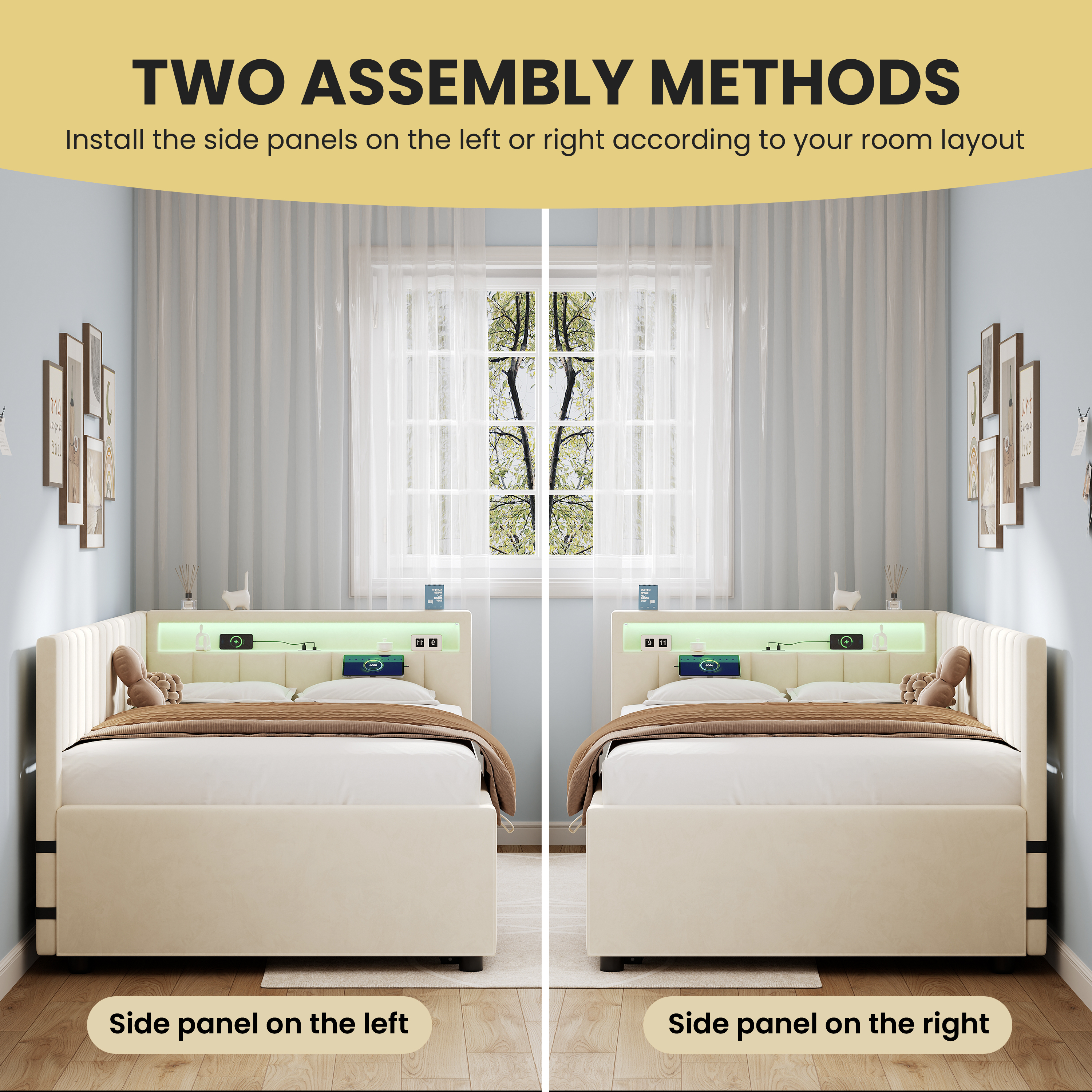 This multifunctional velvet daybed seamlessly combines modern technology with practical design. Featuring an integrated charging station and app-controlled LED lighting, it offers a smart solution for contemporary living. The space-saving trundle design allows for easy conversion between a stylish sofa and a comfortable sleeping area, making it suitable for various scenarios such as living rooms, bedrooms, or study rooms. Wrapped in luxurious velvet with a sturdy frame, this bed delivers both style and durability for any modern home. Special Features: - Charging station - App-controlled RGB LED lighting - Beside storage - Skin-friendly velvet and high resilience sponge - Smooth-gliding wheels for easy conversion - Sturdy metal and wood support frame - Two assembly methods - Space-saving multiform design