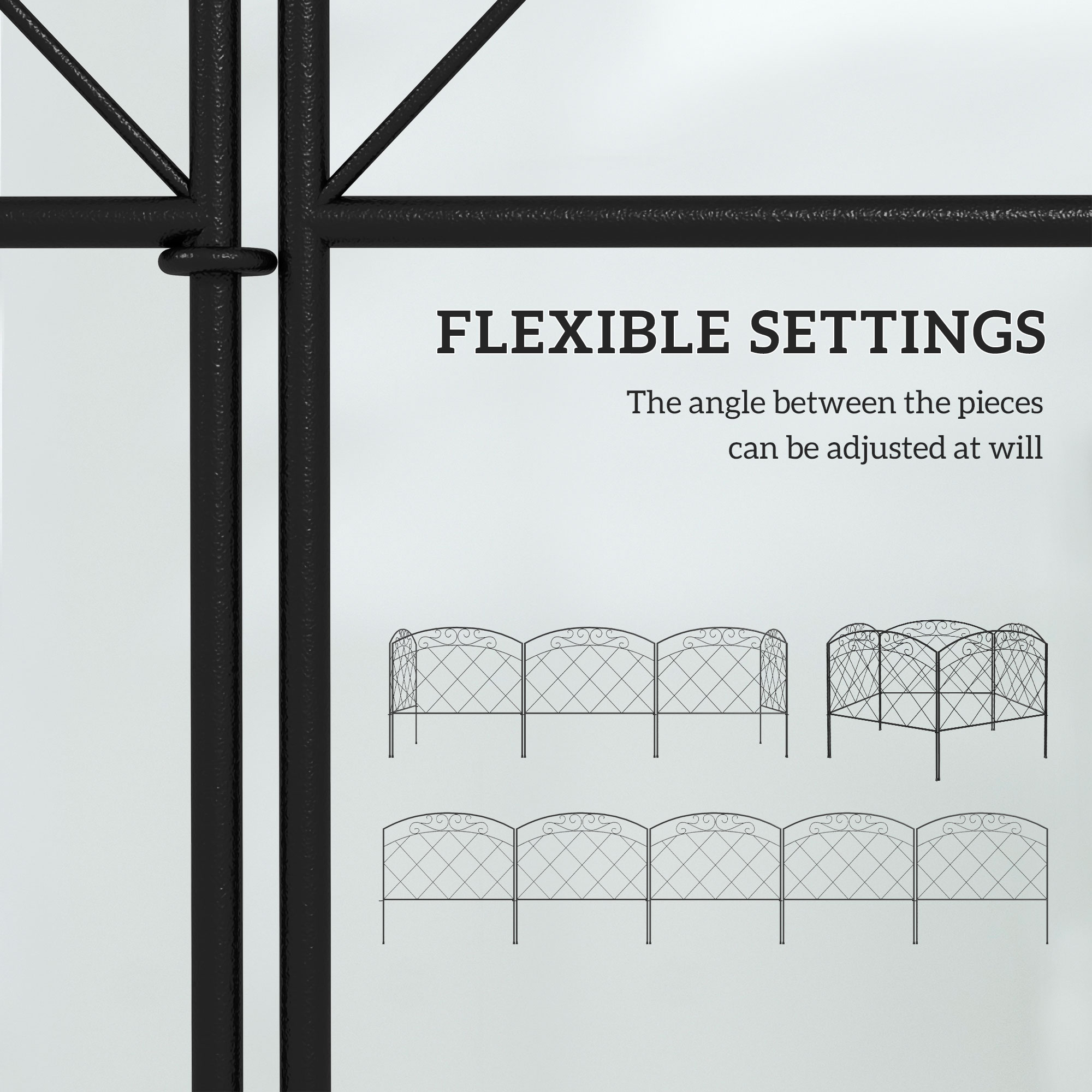 A beautiful and practical fence which can easily be shaped to suit you: this piece is a great entrance to your home. 3 m long, each panel can be flexed to a different position, making it great for obscure shaped areas. Made from metal for a strong structure, the powder coating offers extra protection and strength. The inner gridding and top circles create a pretty look.