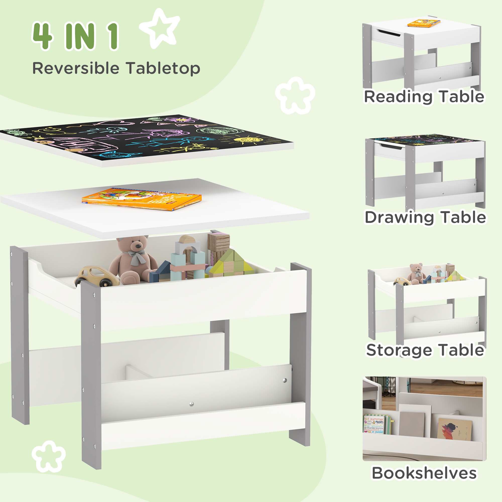 - 4-in-1 Versatile Design: A space to read, draw, snack, and store items. This toddler table has a reversible top with a smooth side for reading or crafts and a chalkboard side for doodles. Lift the lid for storage, and use the side compartments for books or toys.