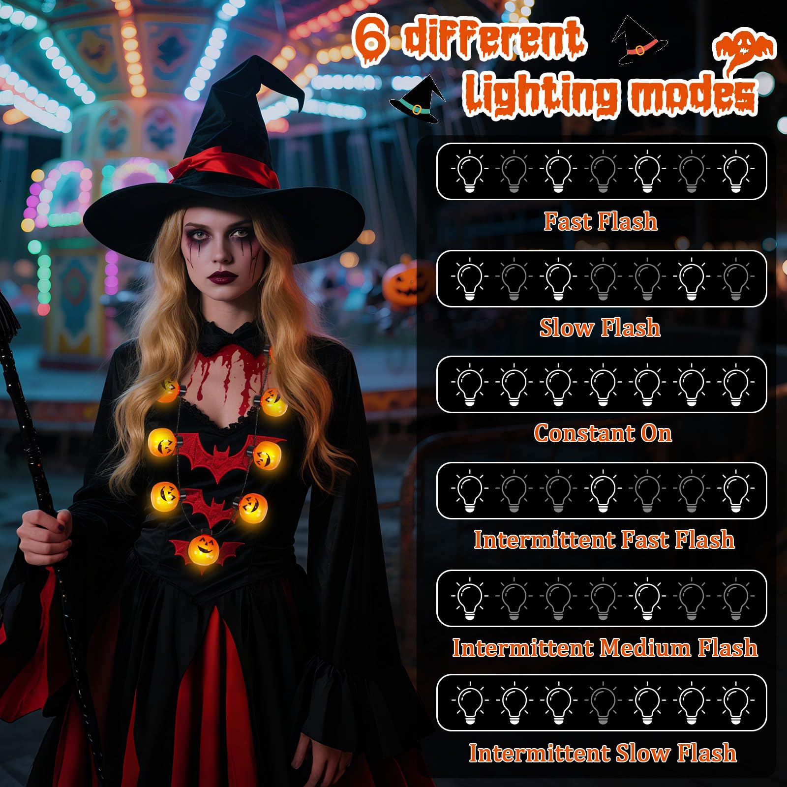 Lighting Mode and Use: The Halloween light up necklace is equipped with 6 flashing modes, including fast flashing, slow flashing and constant lighting, which can be freely switched according to the scene and personal preferences, bringing different visual effects. Halloween necklace light up is also very simple to operate. Press the switch,Halloween glow necklace will light up immediately, forming a cool glitter effect and easily creating a mysterious atmosphere of Halloween