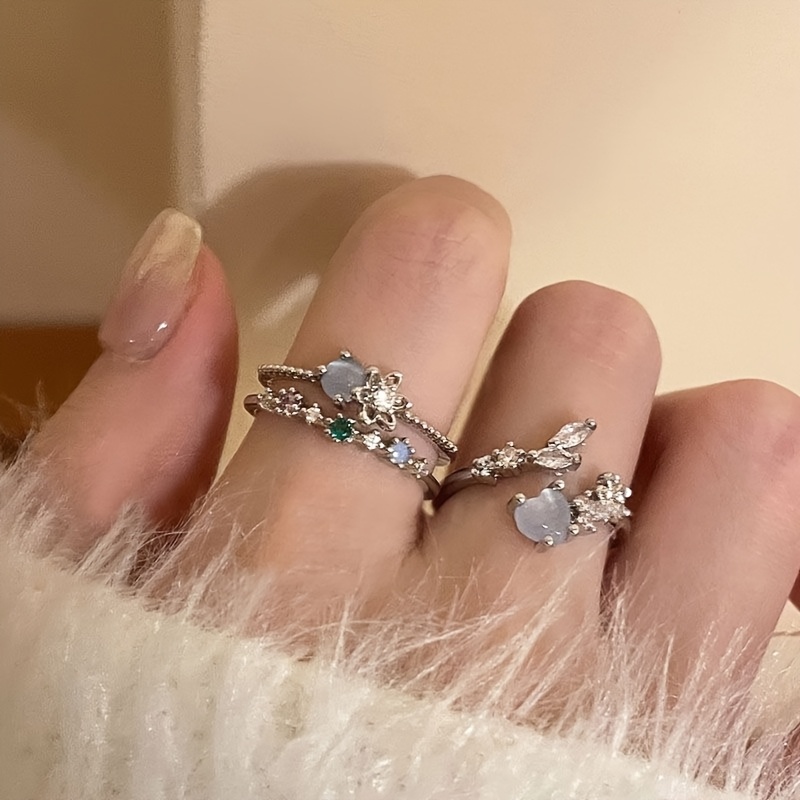 3pcs Set Of Women's Ocean Blue Heart-Shaped Moonstone Open Rings, High-End Adjustable Unique Design Ladies' Hand Jewelry