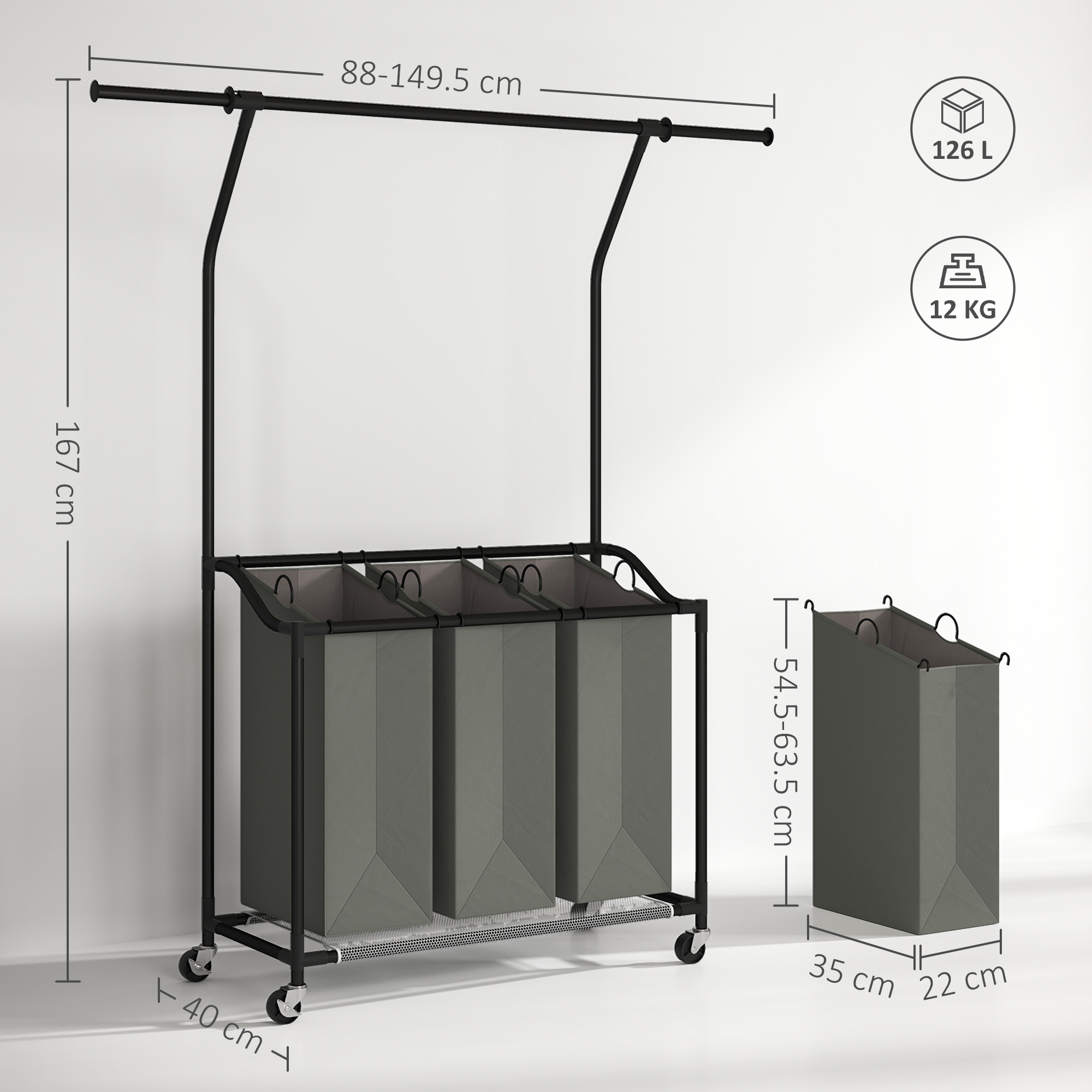 Washing days simplified with this laundry basket with wheels. It comes with three 42L bags - plenty of space to separate dirty clothes as you need. Glide it around with the four wheels, so you don't hurt yourself when moving; two brakes allow the unit to stand in place. Complete with a retractable and removable top rail for hanging garments.