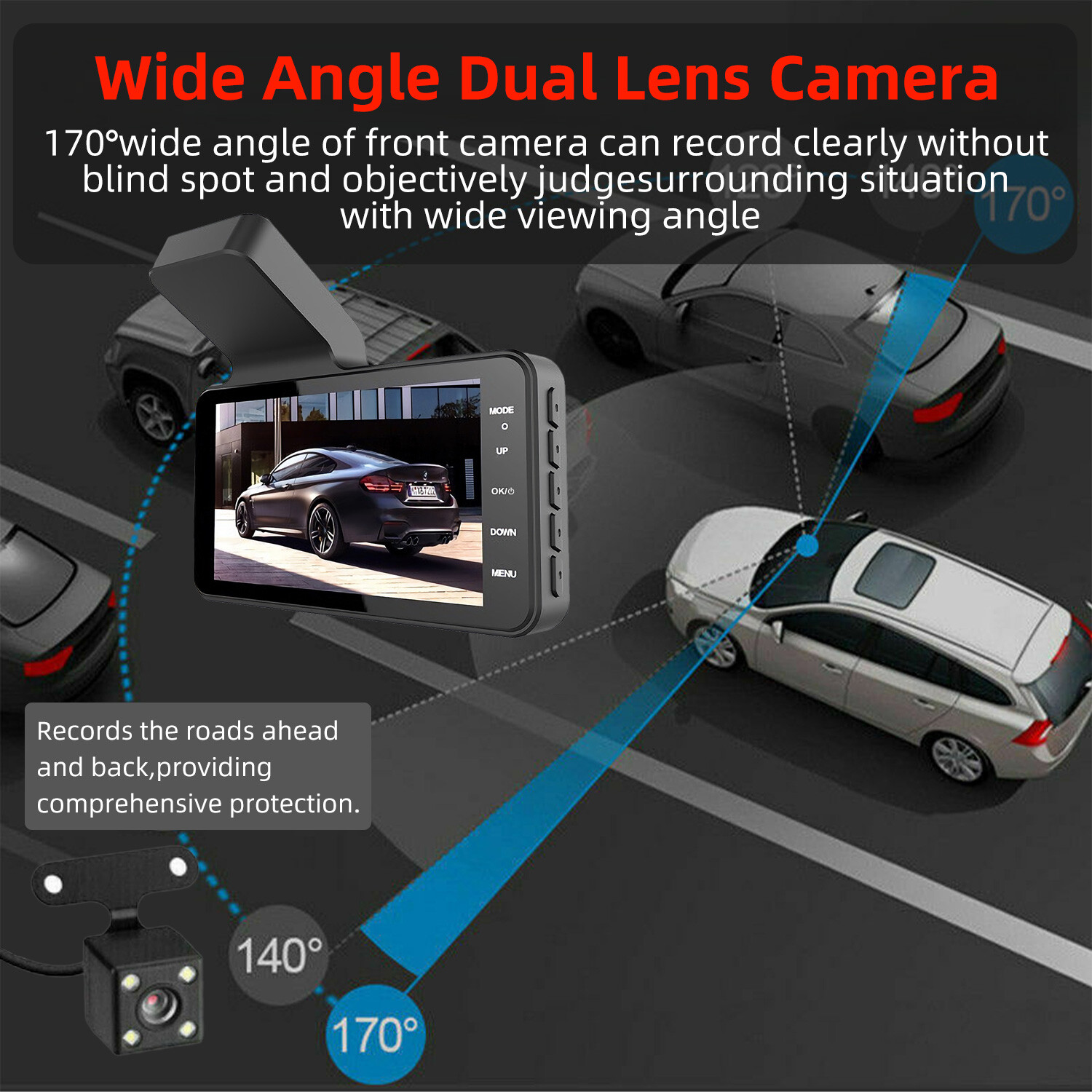 3.Wide Angle Dual Lens Camera: 170°wide angle of front camera can record clearly without blind spot and objectively judge surrounding situation with wide viewing angle. With 120°waterproof rear camera, it can record well even if you are rear-ended from behind and provide evidence for you. (Note: Rear camera is Optional!)