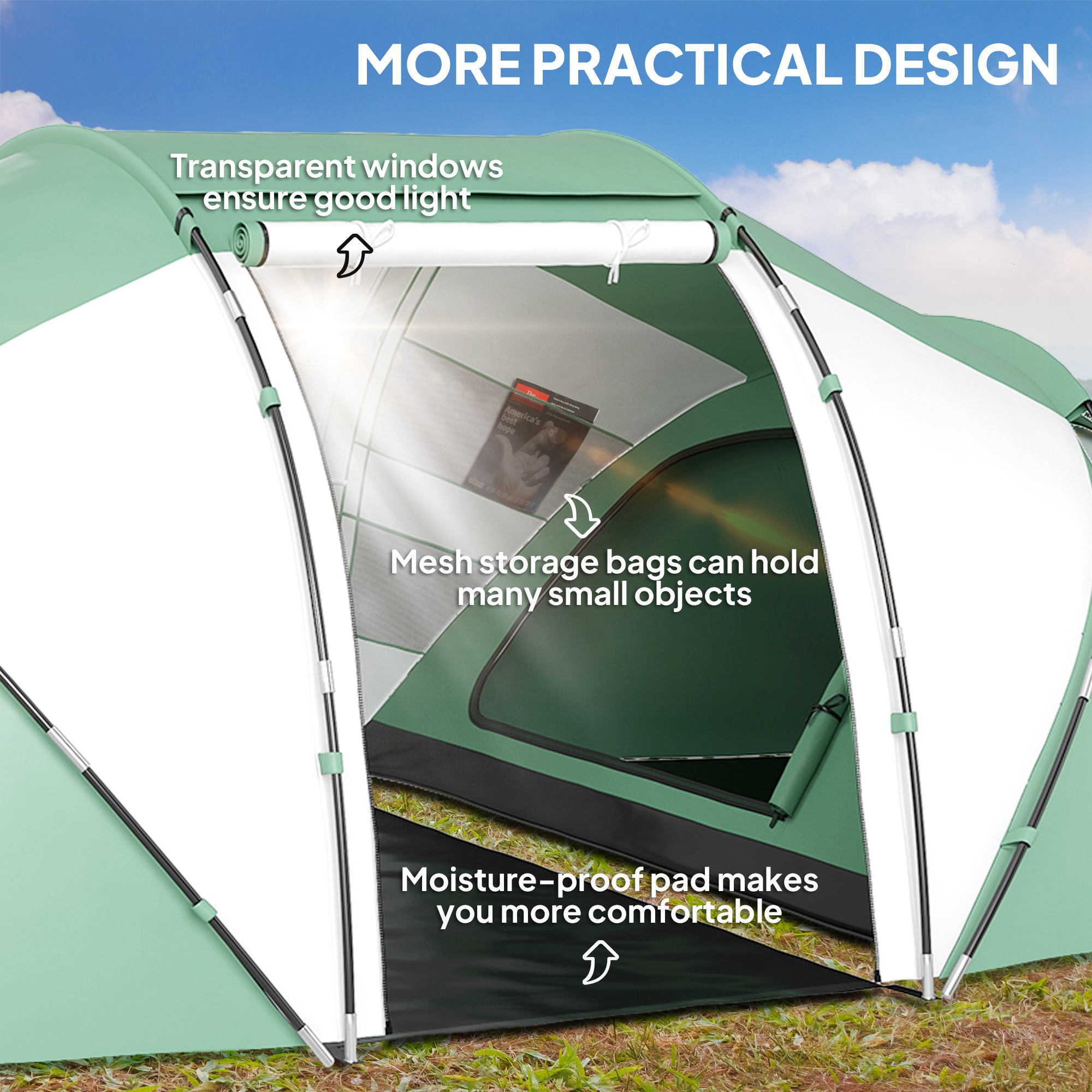 This tent is great for camping, hiking or even festivals. Its spacious design can accommodate up to four-six people comfortably, thanks to the two bedrooms and living room, making it excellent for enjoying time with friends and family. Made from polyester taffeta with fibreglass poles for support and structure, it is UV and water resistant for use in both the sun and rain. It is finished with mesh windows to provide plenty of air circulation as well as keep bugs and mosquitoes at bay.