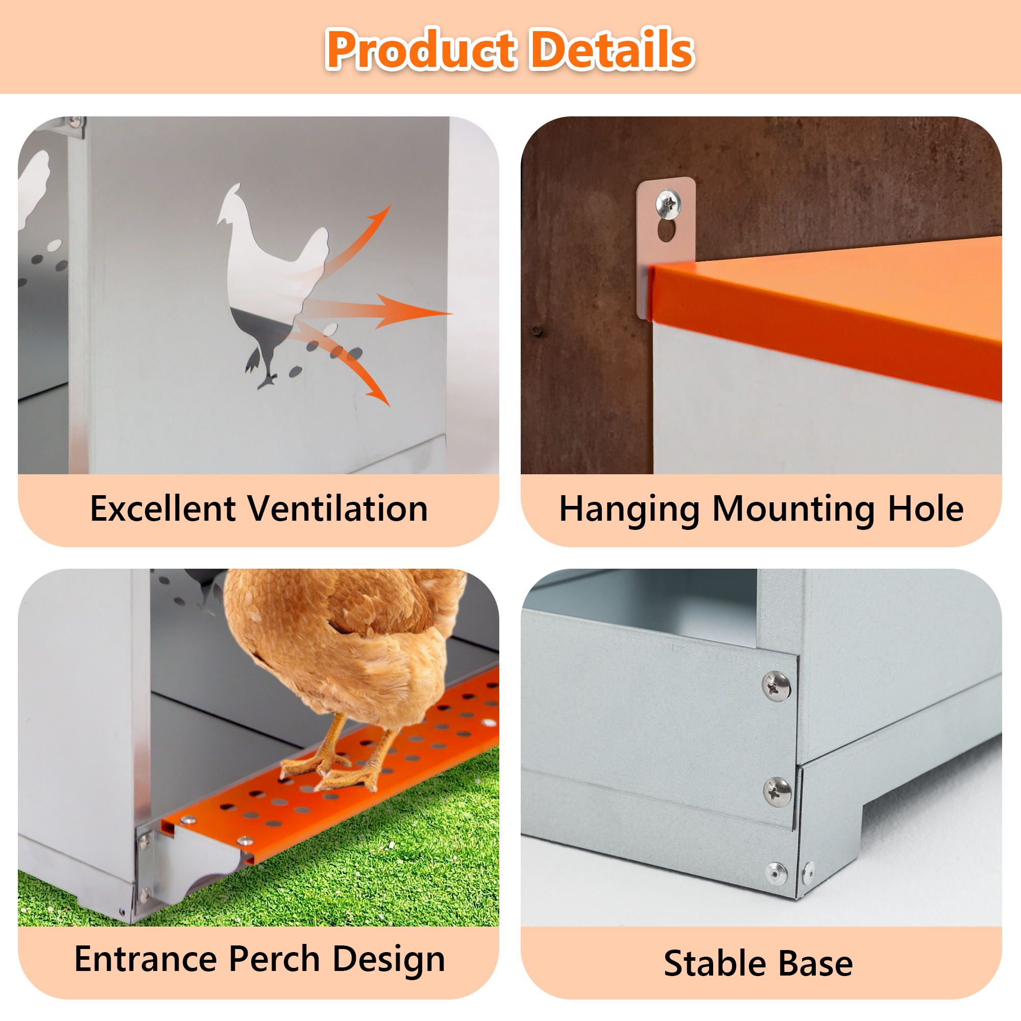 Product Name:4-Bay Metal Nest Box-Wall Mount for Hens/Ducks, Easy Egg Collection & Assembly, Vented Galvanized Steel Coop Equipment Orange