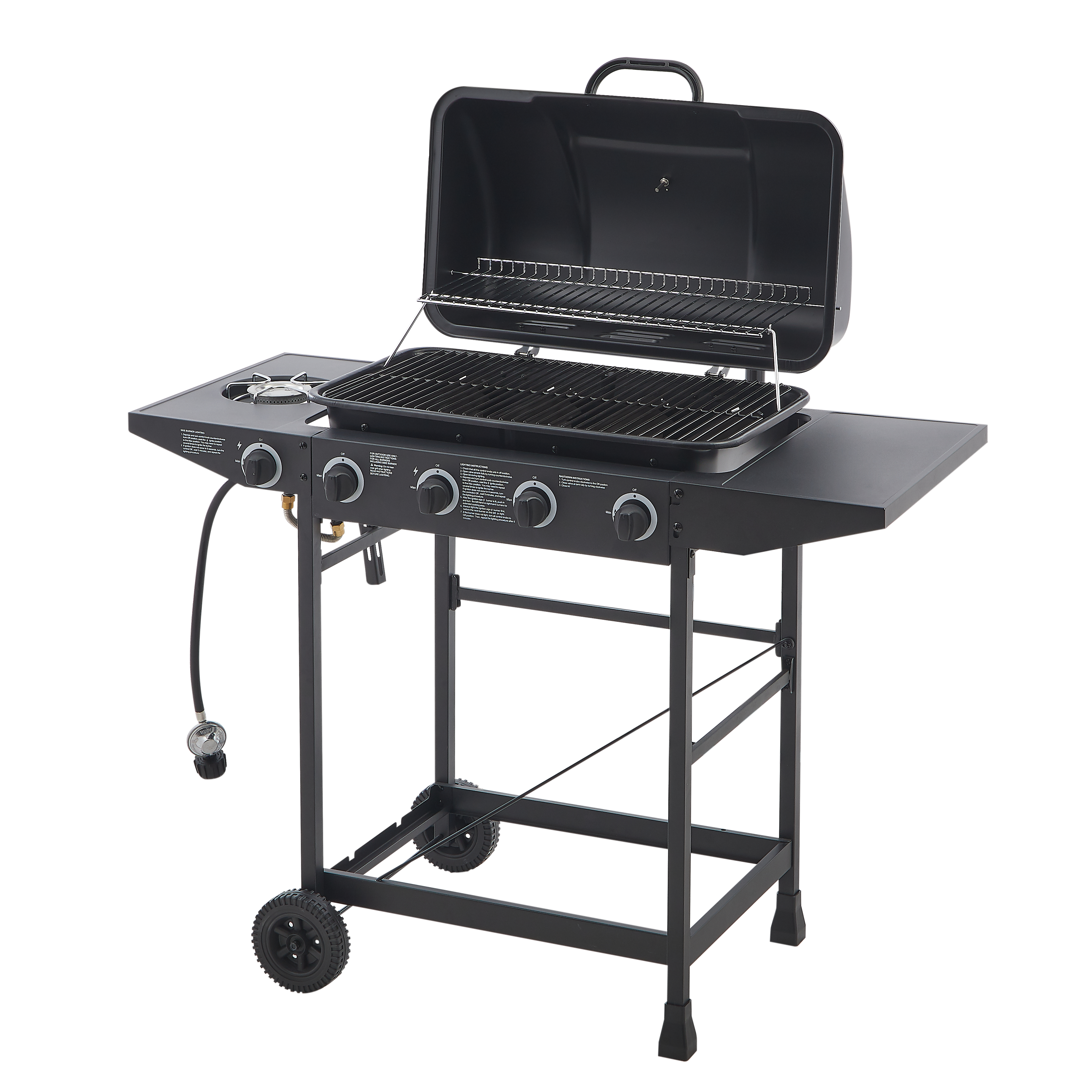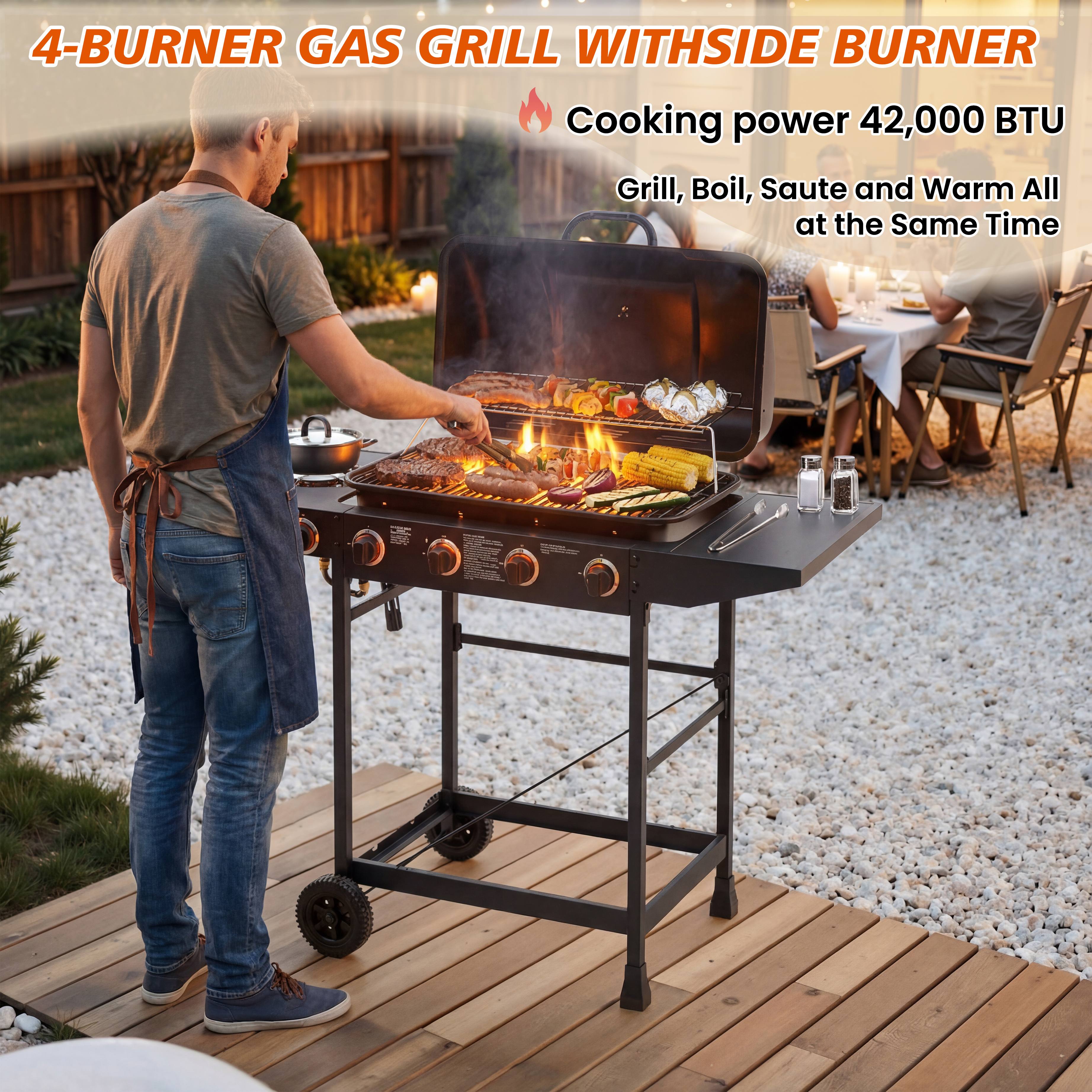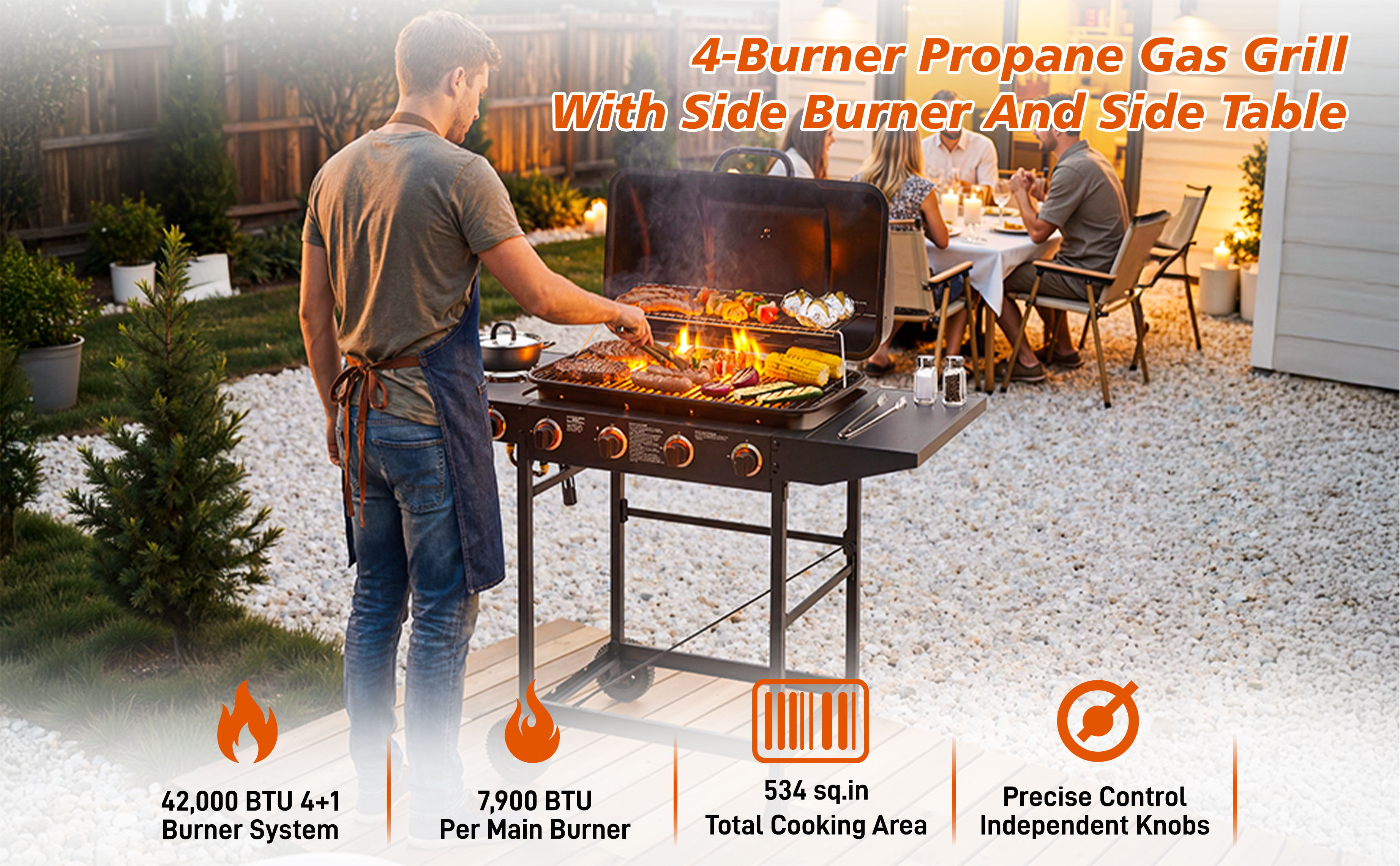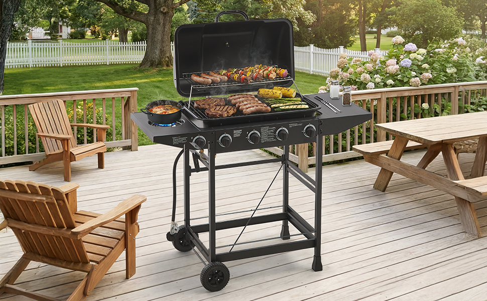 Product Name:4 Burner BBQ Propane Gas Grill with Side Burner 42000 BTU Output Stainless Steel Barbecue Grill with Enamel-Coated Grates and Side Tables for Outdoor Cooking Kitchen and Patio Backyard.