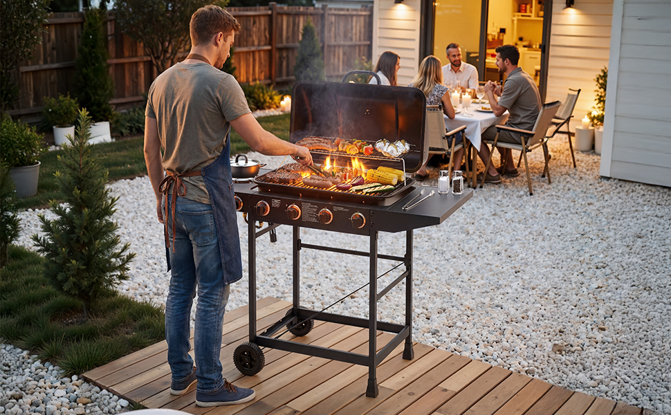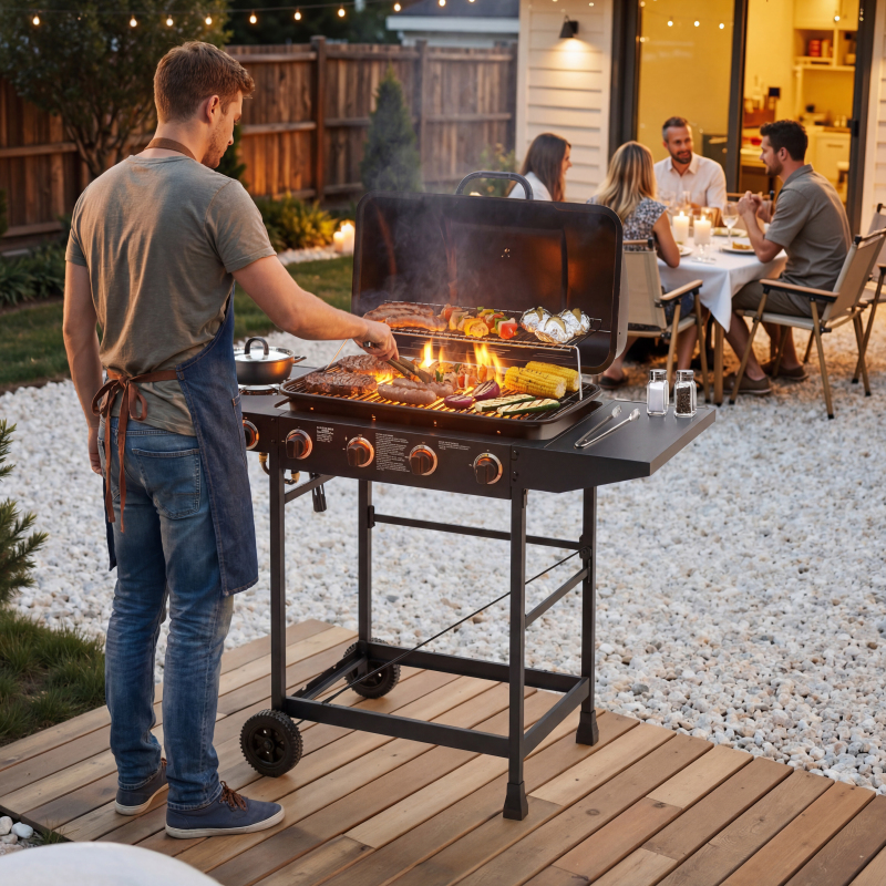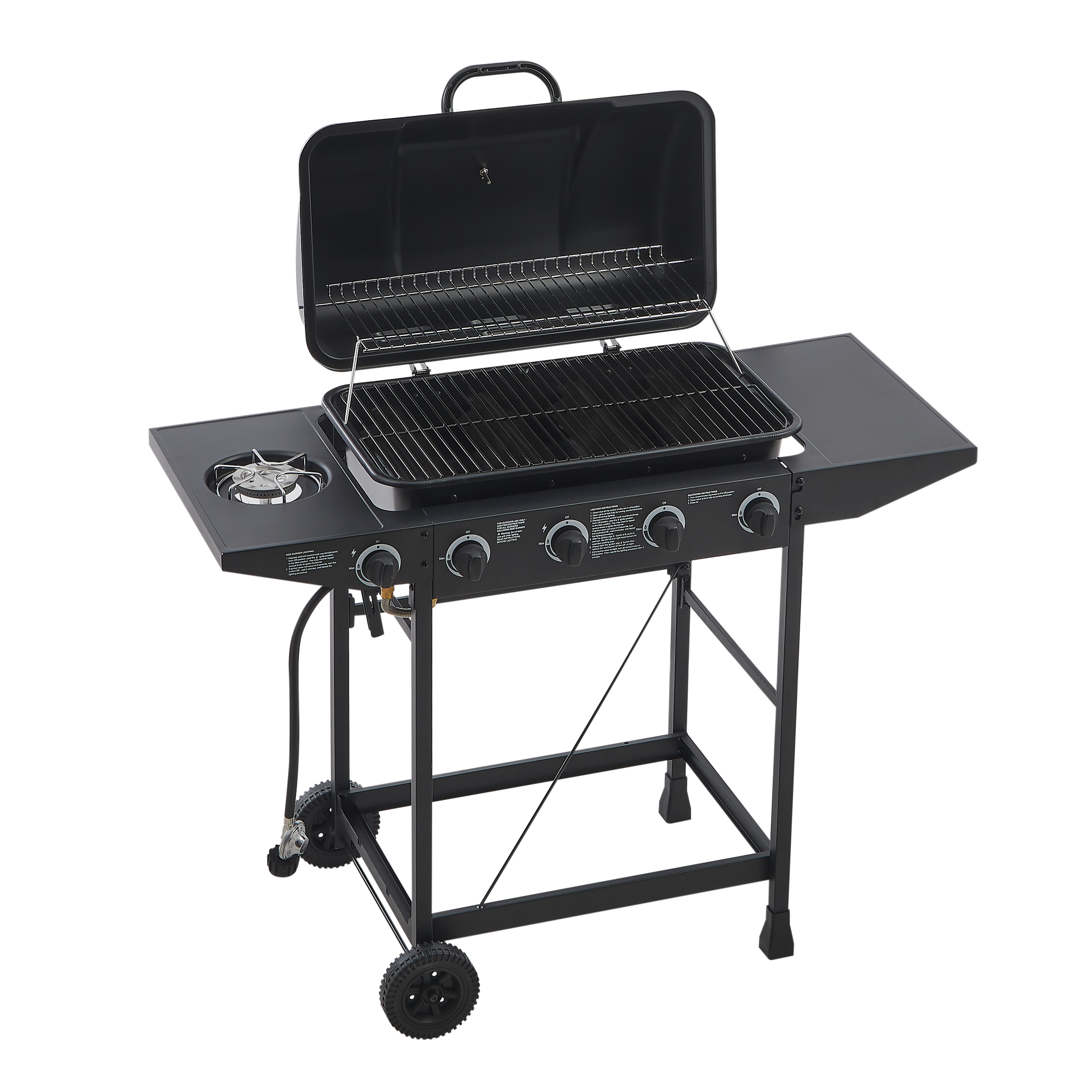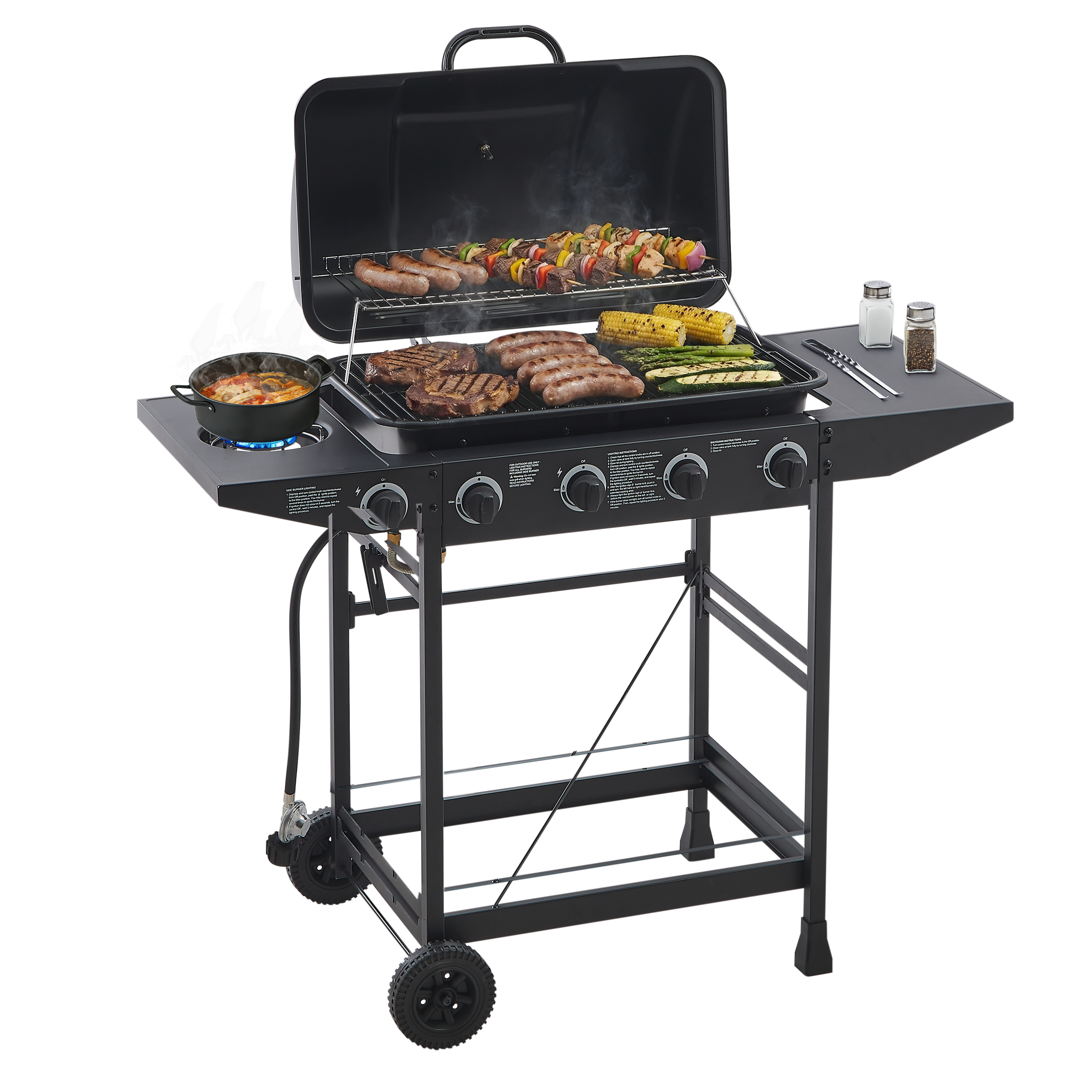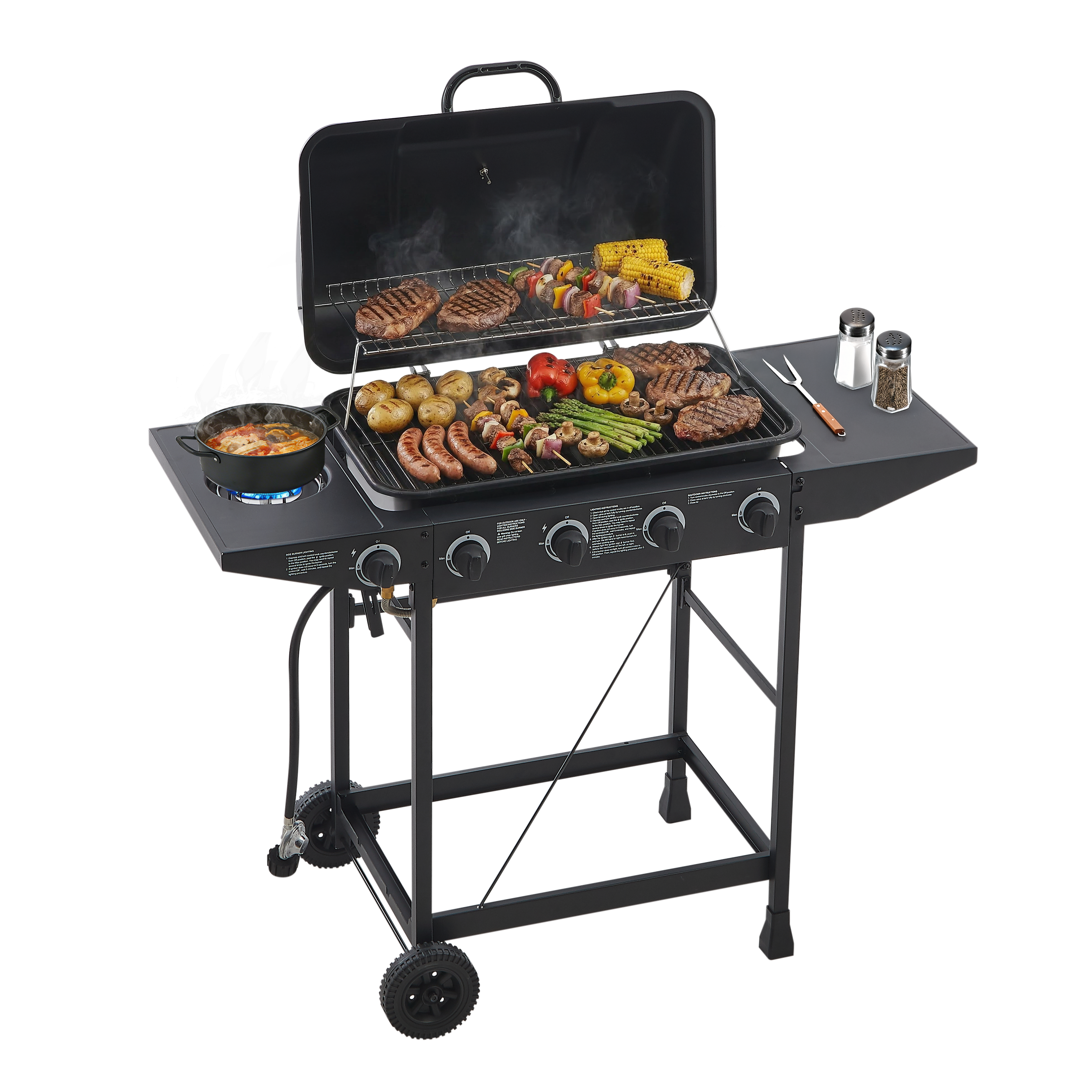 Product Name:4 Burner BBQ Propane Gas Grill with Side Burner 42000 BTU Output Stainless Steel Barbecue Grill with Enamel-Coated Grates and Side Tables for Outdoor Cooking Kitchen and Patio Backyard.