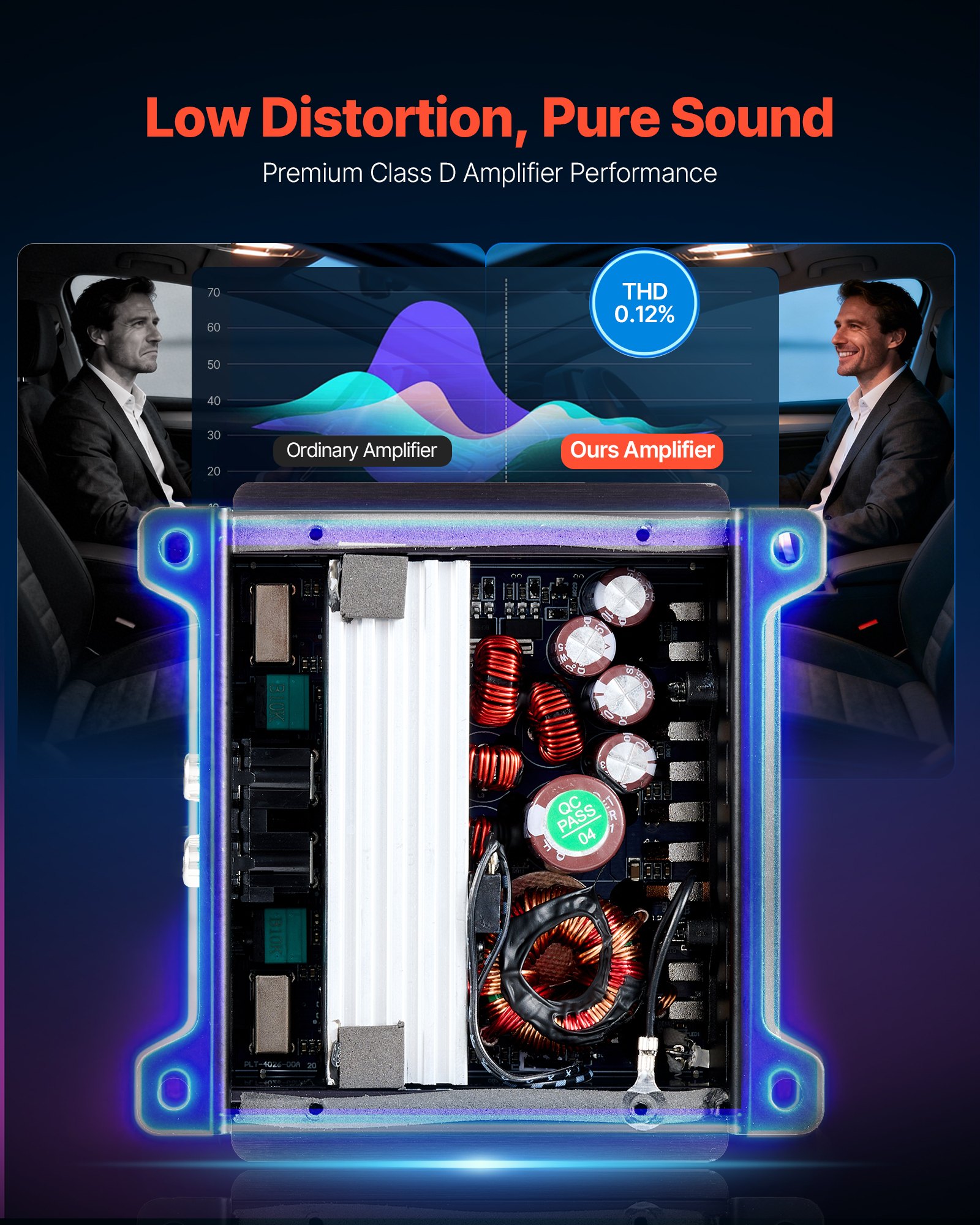 Crystal-Clear Audio Quality: Featuring low distortion (THD 0.12%) and an SNR above 90 dB, this 4 channel amp delivers clean, accurate sound from deep bass to smooth jazz, with minimal unwanted noise