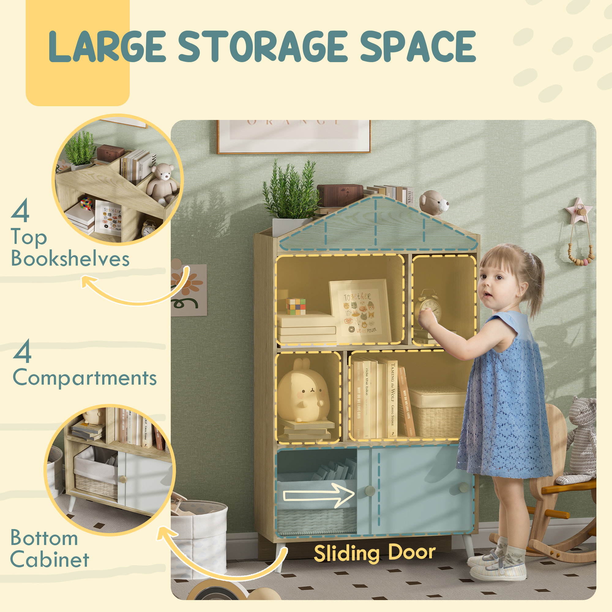 - Spacious Storage: Features top shelves and several storage compartments, including a bottom cabinet with a sliding door, making it a great kids' bookshelf and toy storage solution