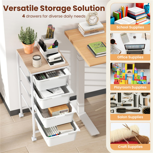 • Organized Convenience: Featuring 4 spacious drawers, this rolling storage cart easily holds office supplies, stationery, craft supplies, building blocks, cosmetics, and more. It helps keep your essentials neatly organized and within quick reach. • Premium Wooden Top: The thick MDF wooden tabletop offers a sturdy and attractive surface for displaying items or working on projects. Its natural wood grain adds more elegance to your living or working area. • Reliable Durability: Constructed with a heavy-duty metal frame, this mobile utility organizer promises long-lasting use and strength. The smooth drawer tracks made of metal withstand frequent opening and closing, enhancing everyday functionality. • Effortless to Move: Equipped with 4 universal casters, including 2 lockable casters, this rolling cart moves quietly and smoothly across various floors. Moreover, the 360° swiveling casters are noise-free and wear resistant, perfect for home use.