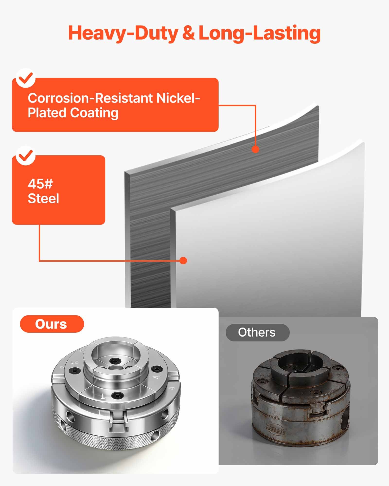Self-Centering Design: Our self-centering lathe chuck automatically keeps your workpiece centered during high-speed rotation. It minimizes misalignment without repeated manual adjustments, improving machining efficiency