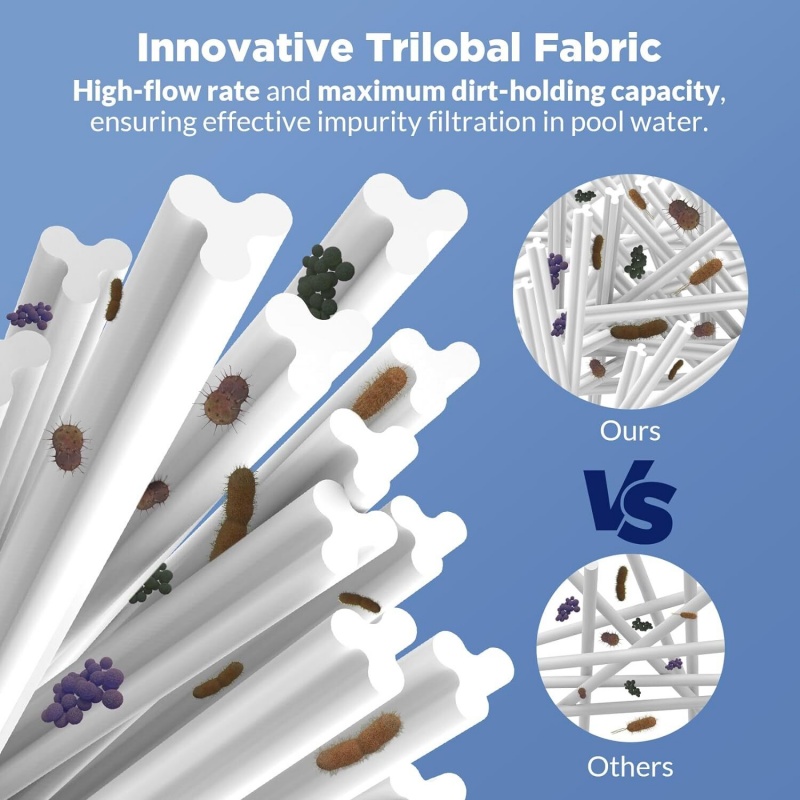 The Best Filtration: Innovative Trilobal Fabric has more larger filtration area to remove sediment, sand, leaves, hair, stone, dirt and dust. Keeping your pool and hot tub clean, Say goodbye to dirty pools with this excellent pool water filter.