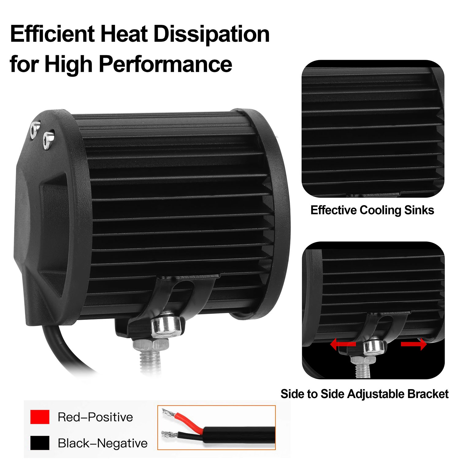 *Efficient Heat Dissipation*:For better performance and durability,these spot lights provide effective dissipation through the fin shaped sink area at the back of each light where it comes into contact with your vehicle. Good dissipation helps to keep to lights cool and extend the lifespan of LEDs to over 30,000 hours.
