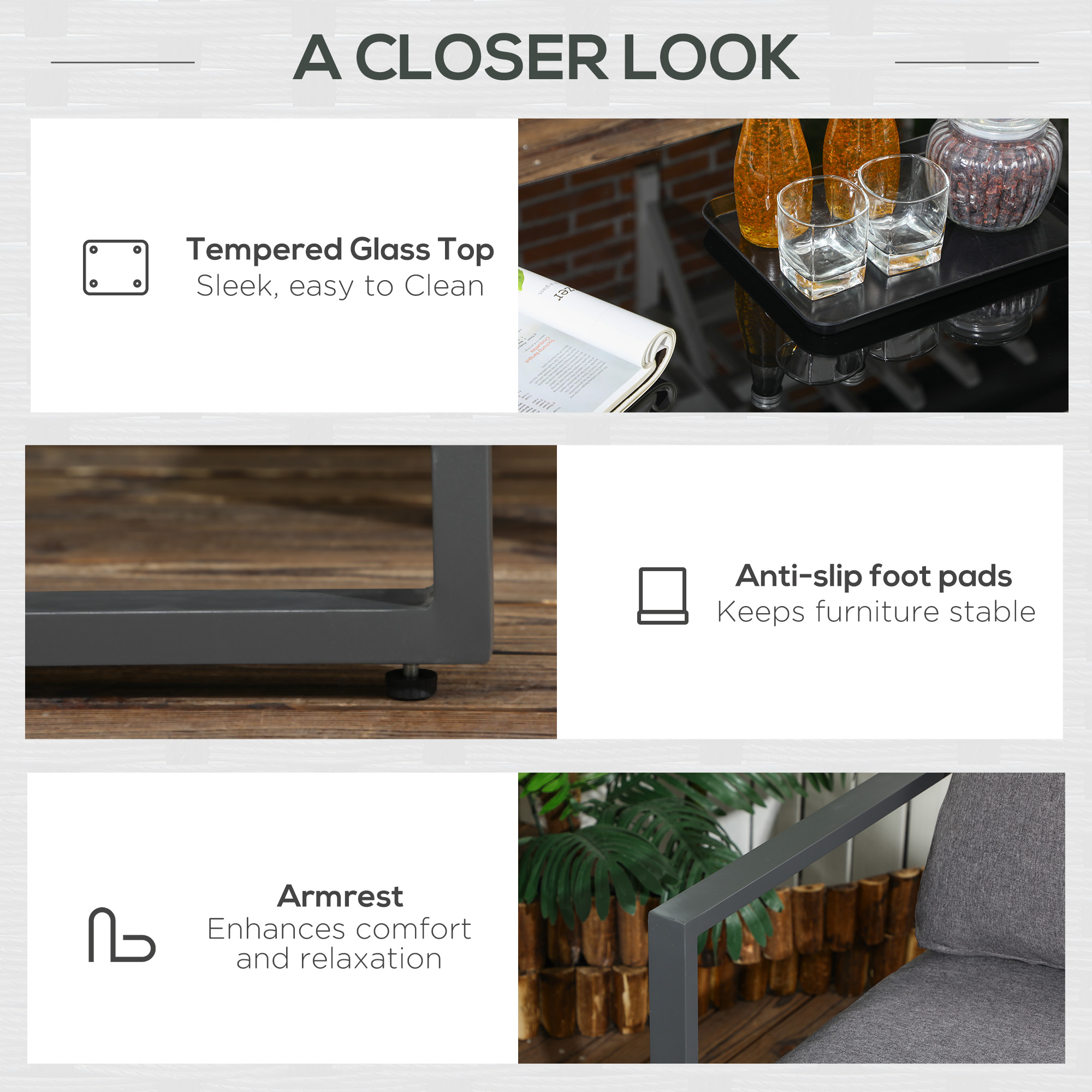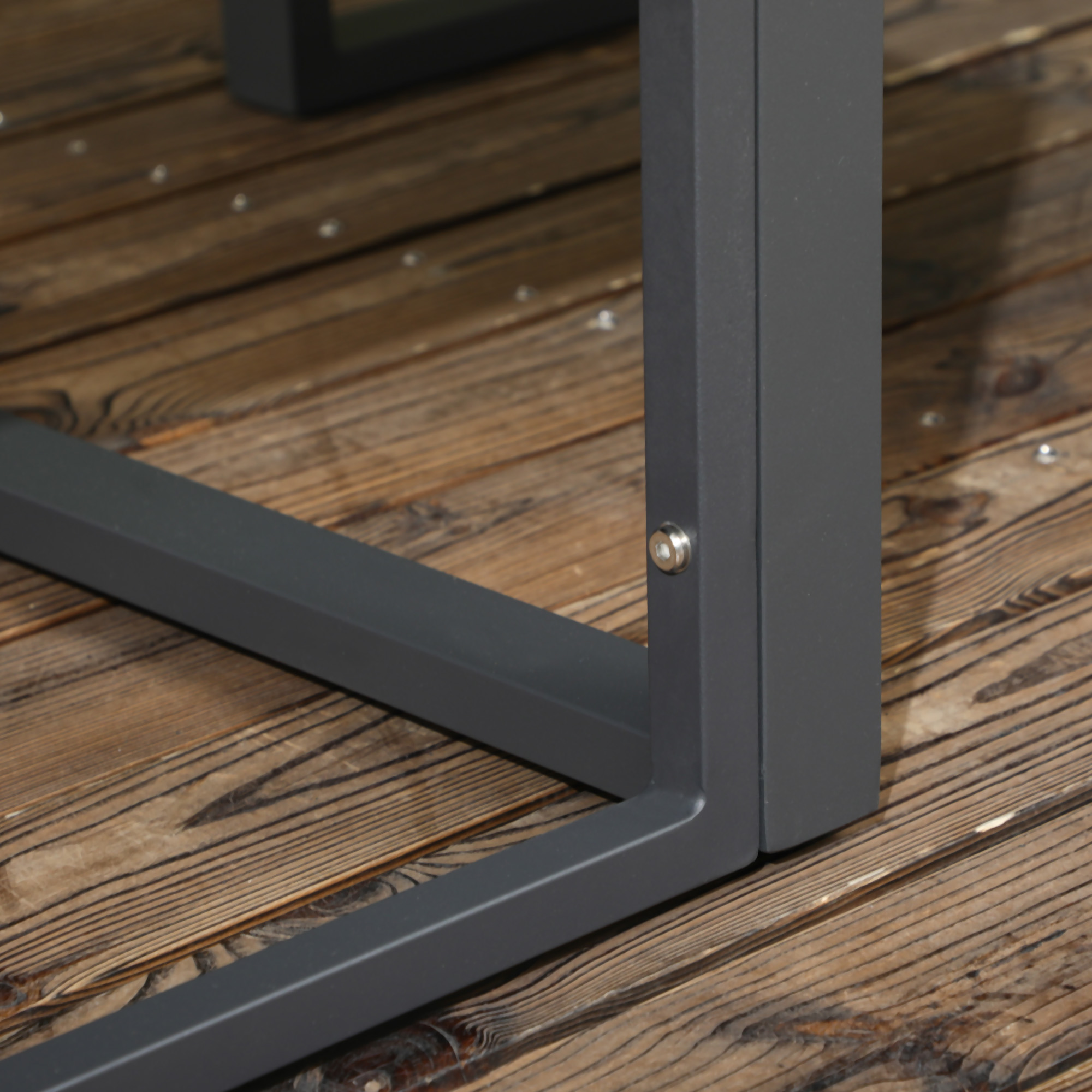 Take comfort back to basics with this four-piece outdoor dining set from . Using aluminium for the frame of the four chairs and the table, each piece has been made with durability and strength in mind, as well as being lightweight for you to move everything around easily. Placed on the seats and the backs of the sofa and two chairs, thick padded cushions ensure you’ll be sitting comfortably, with the high backs and armrests working together for additional comfort and support.