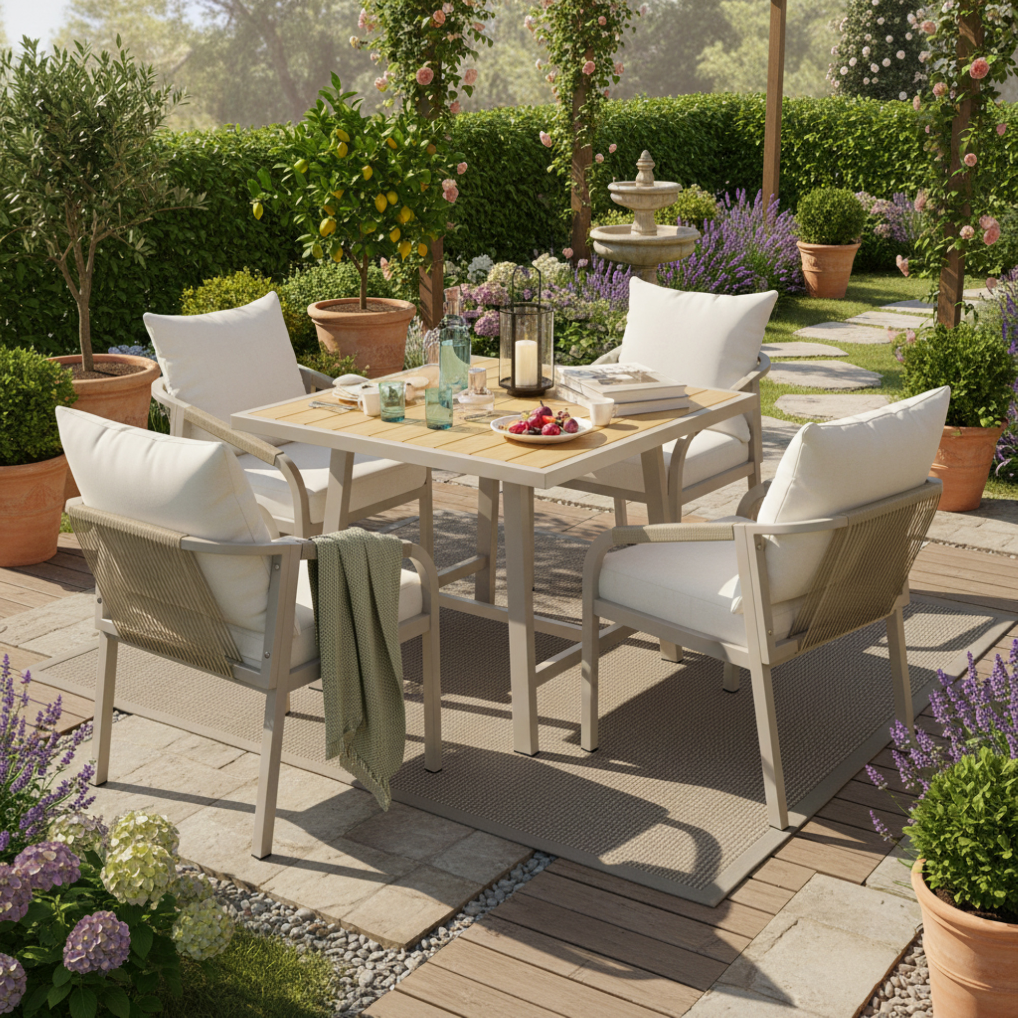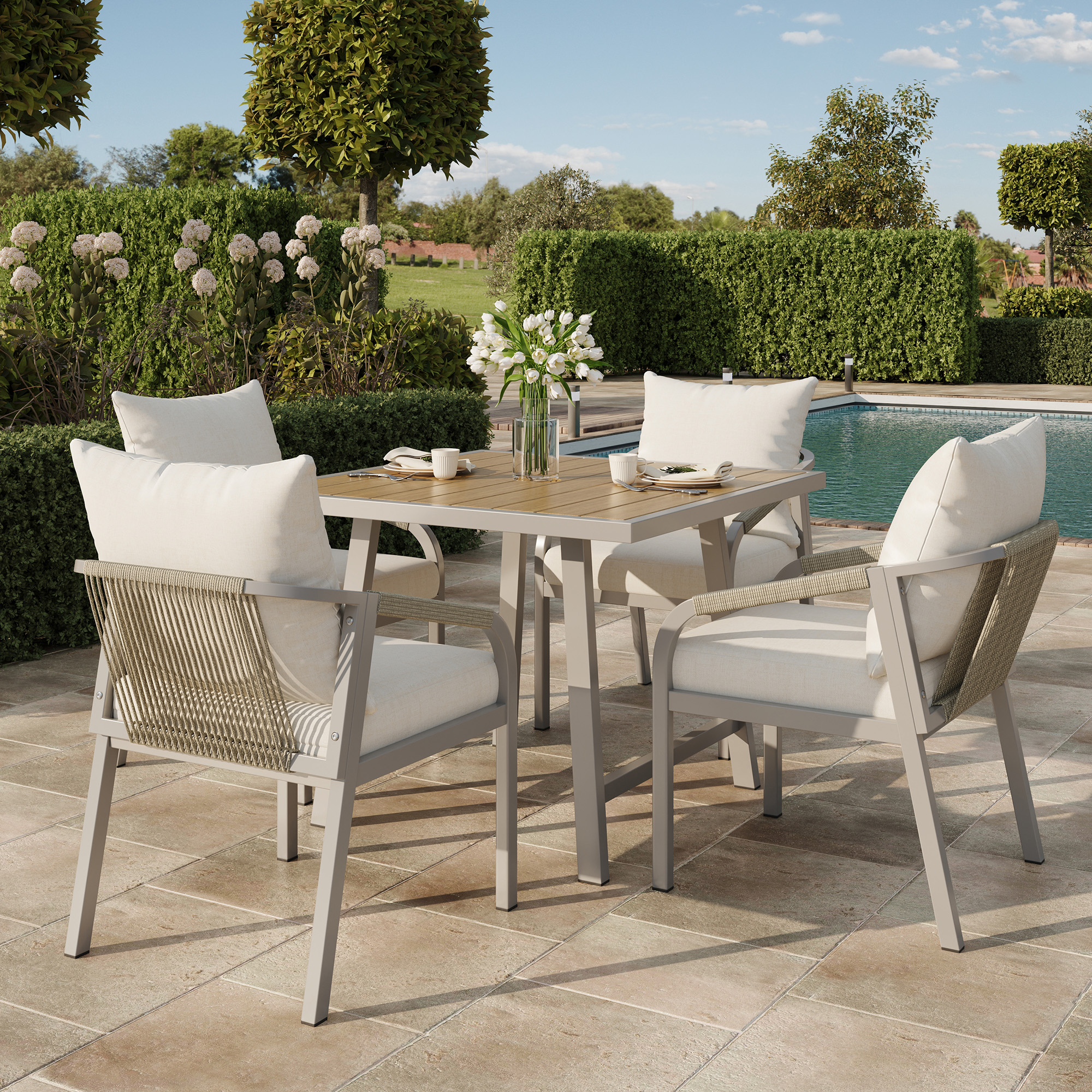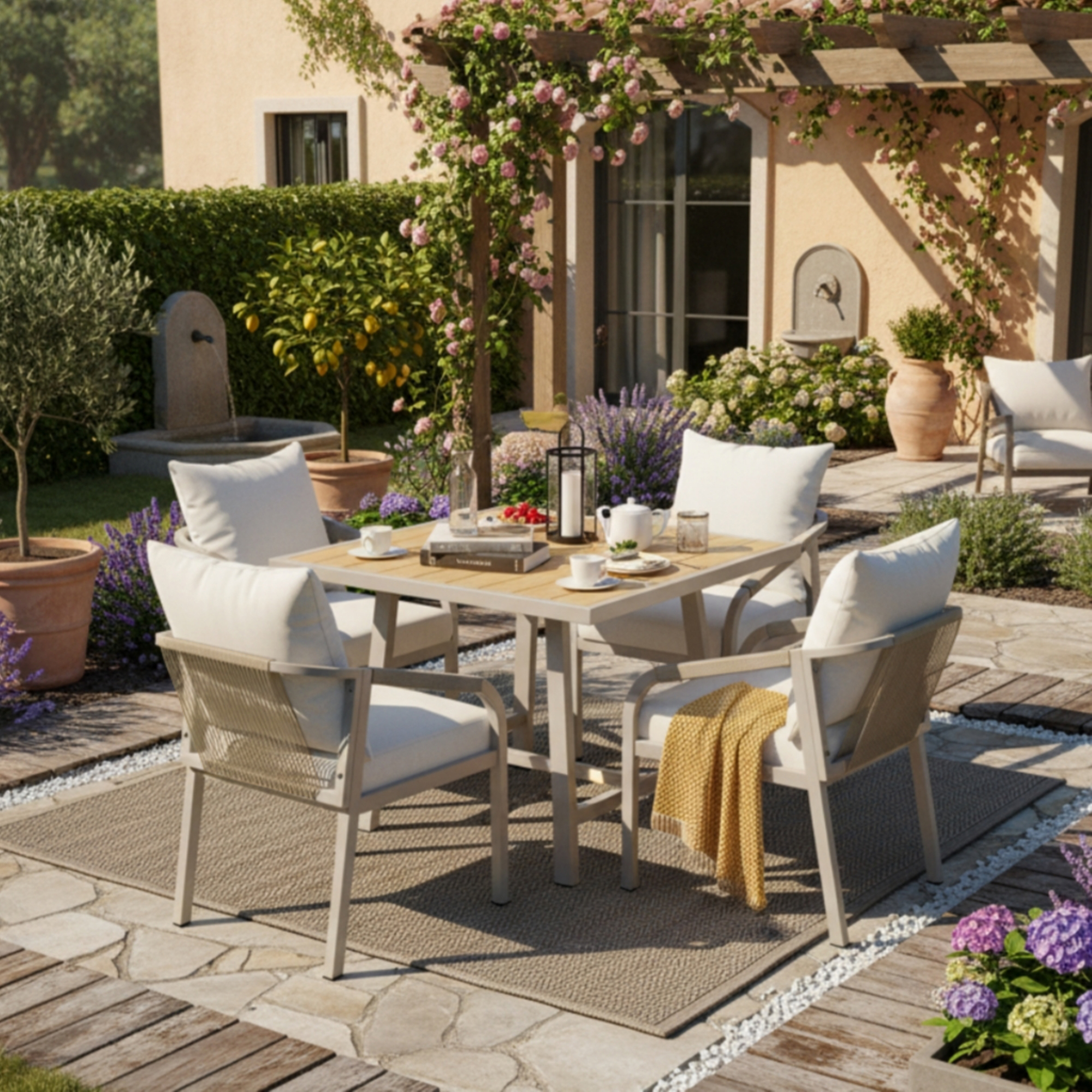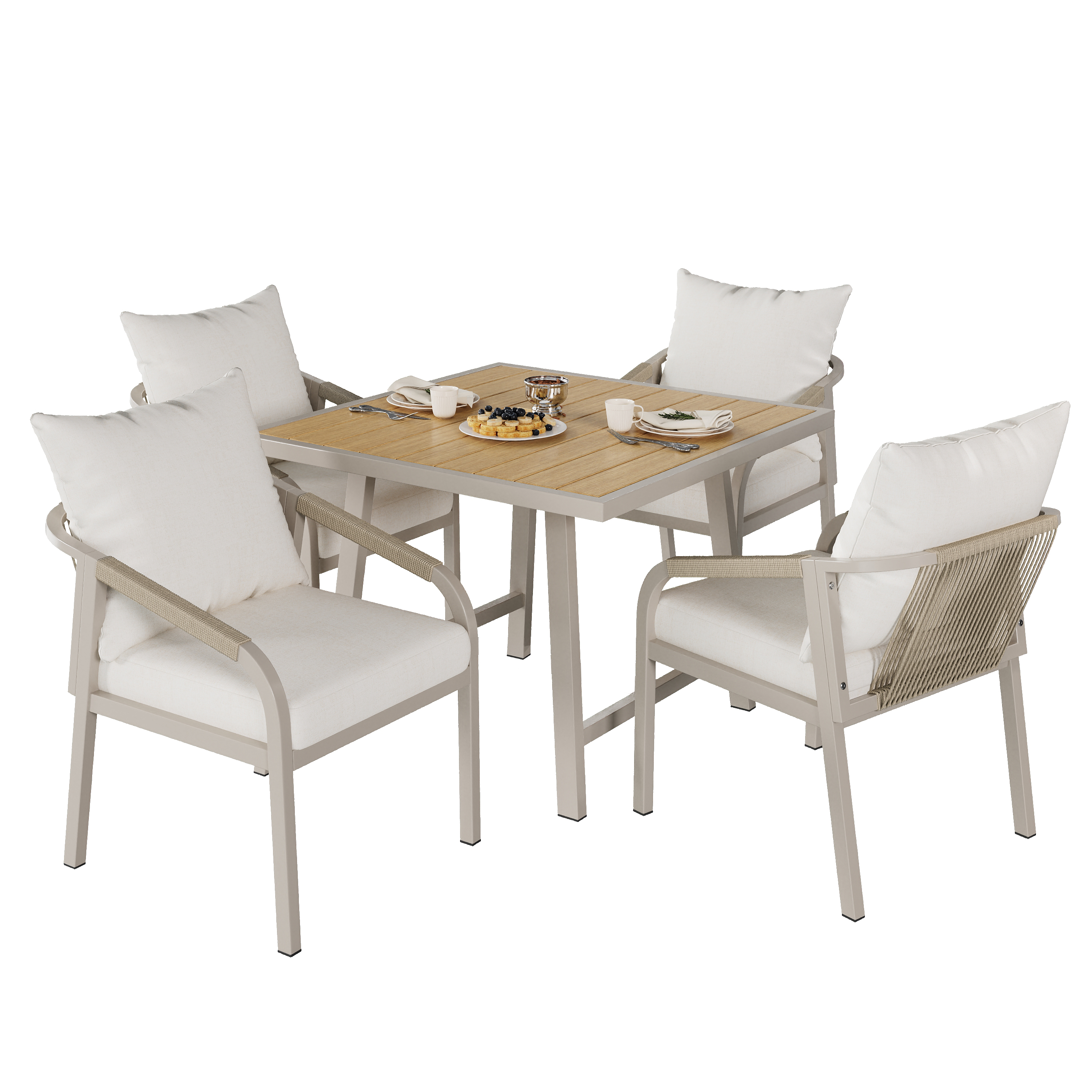 Product Name:4 Seater Garden Dining Set, Galvanized Iron Frame Outdoor Patio Furniture,Includes 4 chairs and 1 table, plastic wood tabletop, chairs with woven rope, tabletop with umbrella holes, Beige