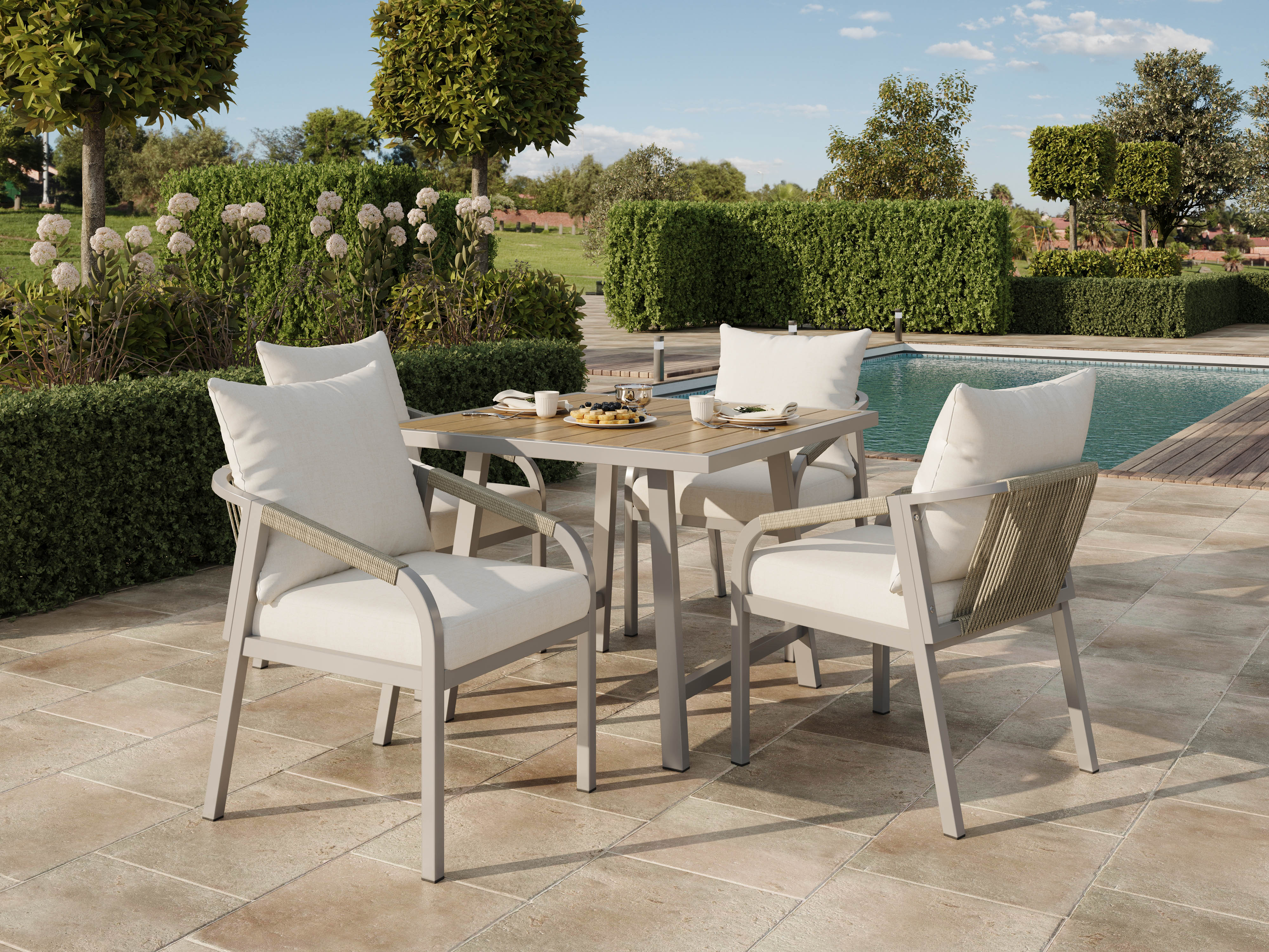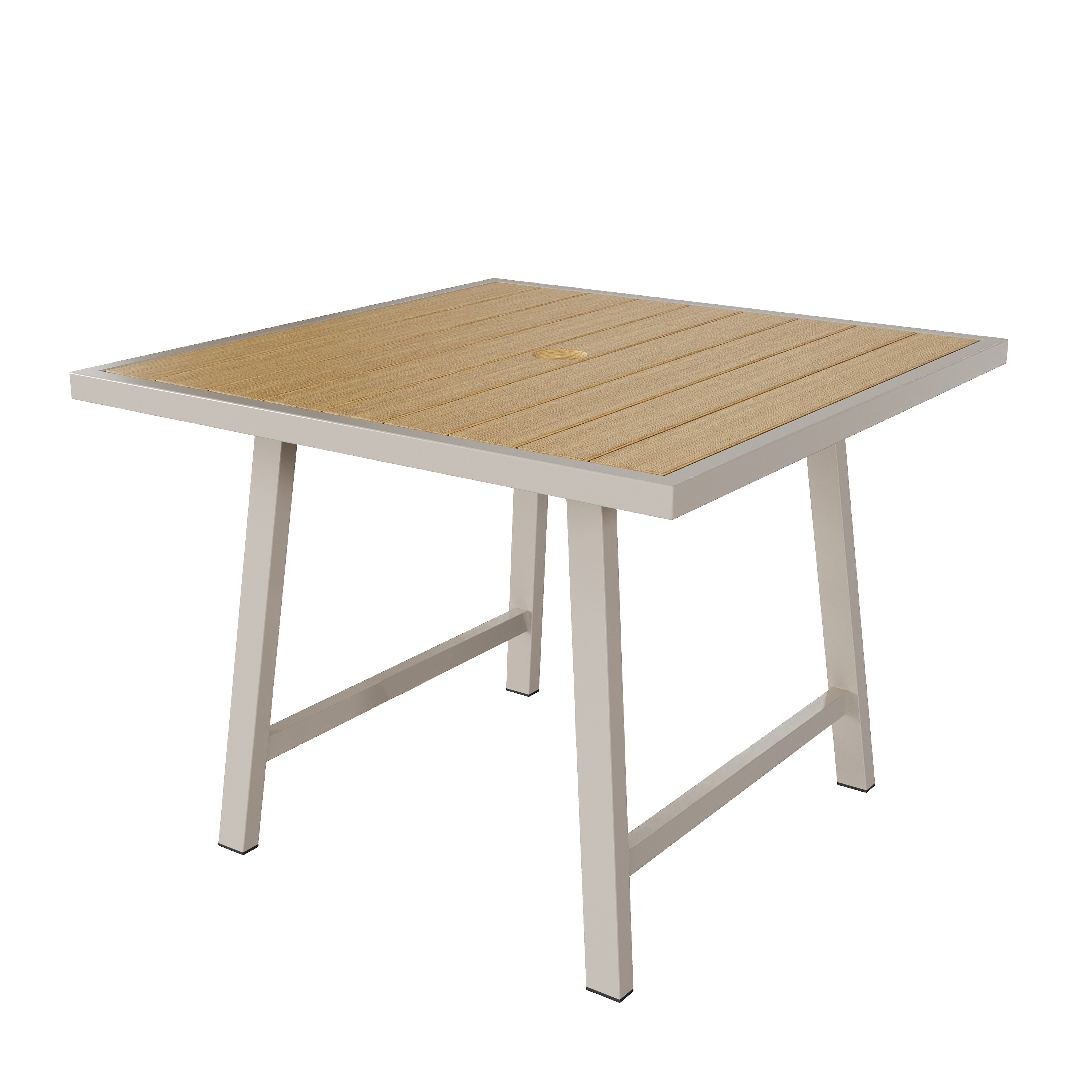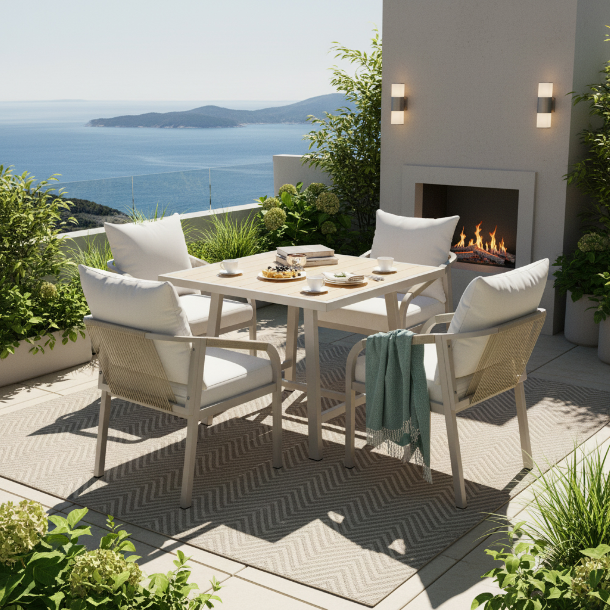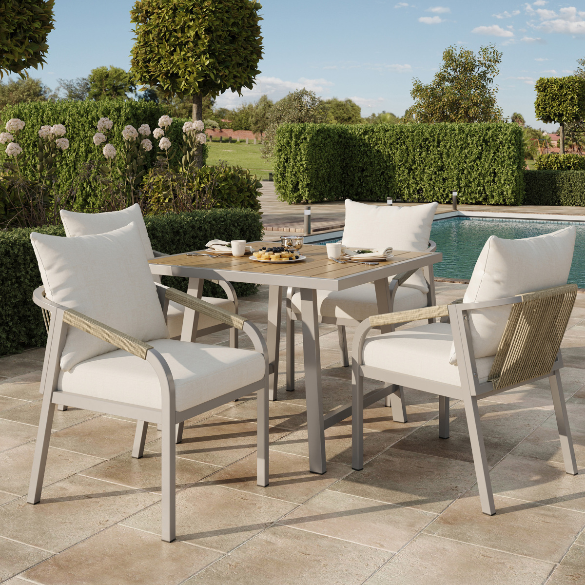 Product Name:4 Seater Garden Dining Set, Galvanized Iron Frame Outdoor Patio Furniture,Includes 4 chairs and 1 table, plastic wood tabletop, chairs with woven rope, tabletop with umbrella holes, Beige