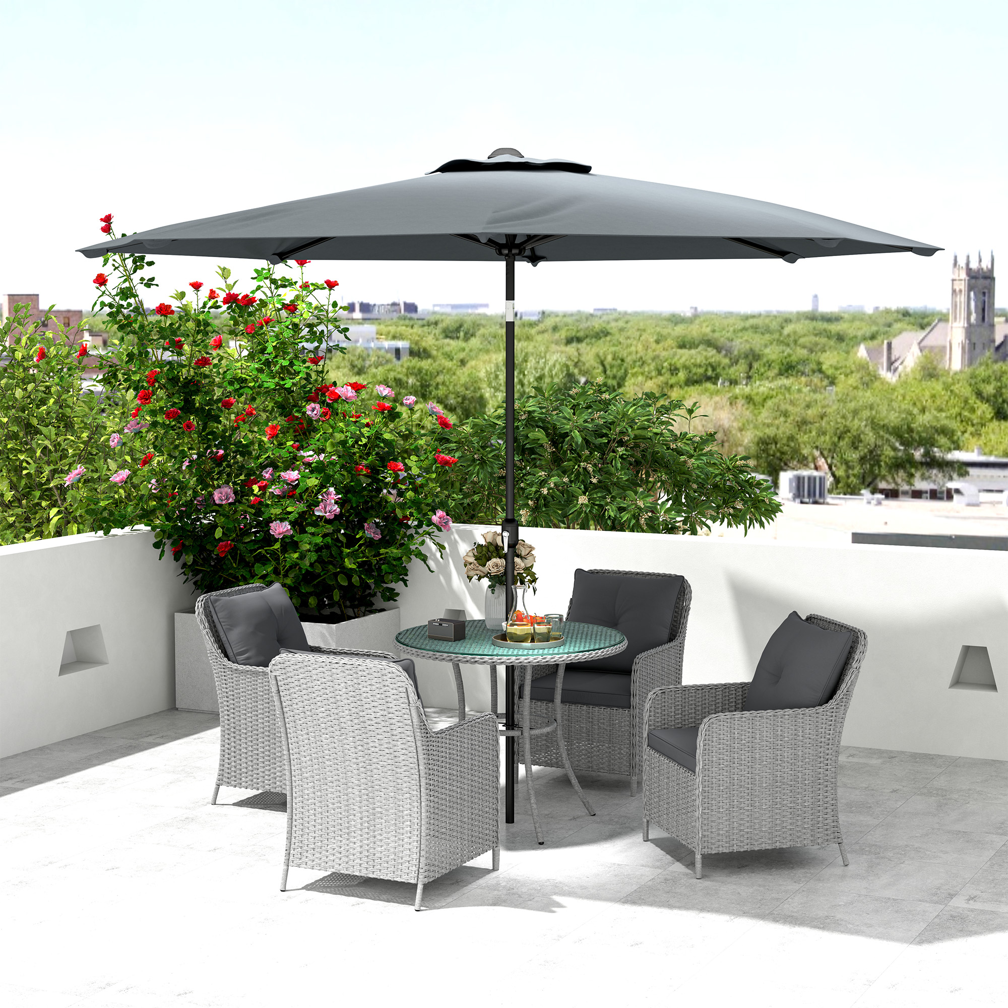 Enjoy stylish outdoor dining, thanks to this rattan table and chairs set. This six-piece ensemble includes four armchairs, a round table and parasol umbrella for shade. Each chair comes with a seat and back cushion: relax and dine comfortably. Stylish outdoor dining table and chairs for you and company.