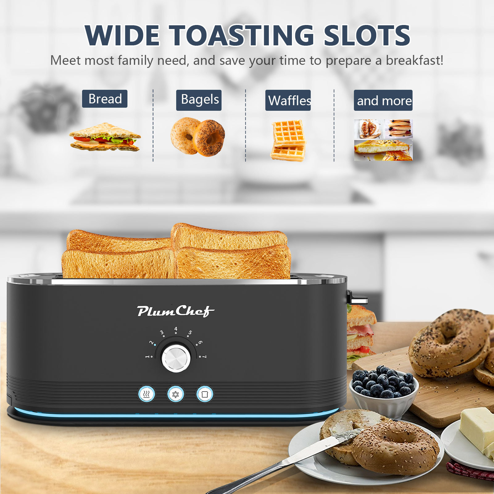 Premium Stainless Steel Design – Built to last with a full-body stainless steel construction and brushed anti-fingerprint finish for a sleek, scratch-resistant look. The standard slot size fits most bread types, while the optional LED light strip at the base adds a modern, stylish touch to your kitchen.