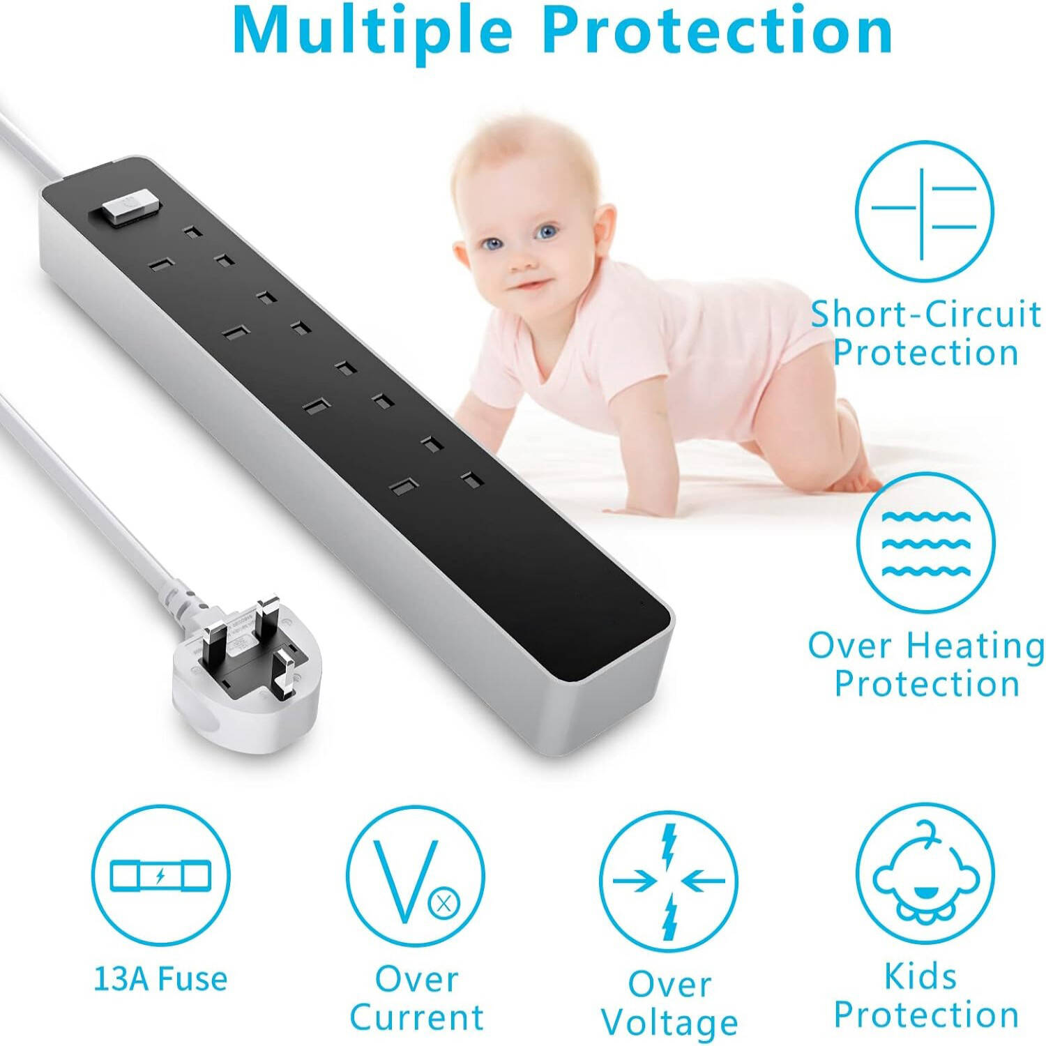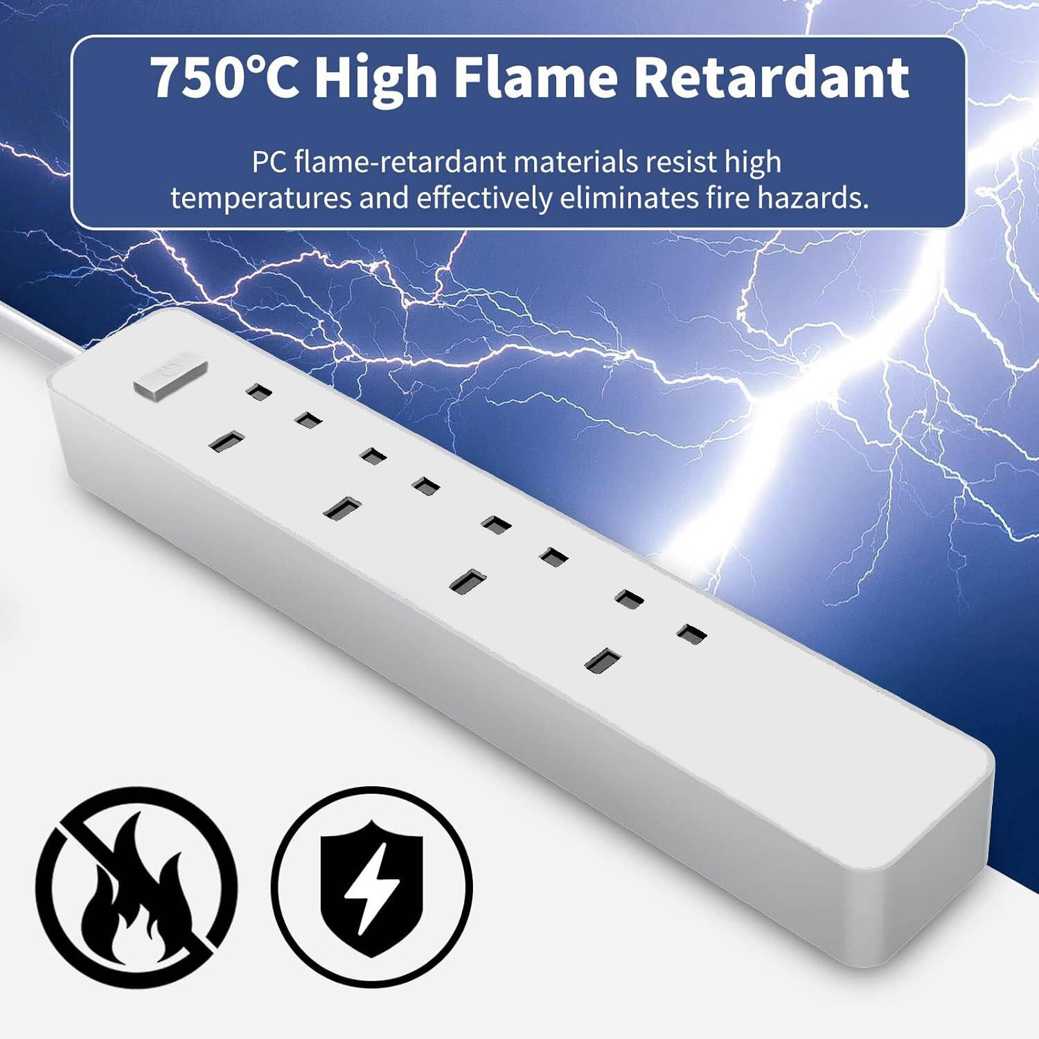 4-Socket Extension Lead 3.4A Smart Fast Charging Total Control 13A 3120W 1.6m Power Cord Fireproof PC & ABS UK Plug Surge Protector Power Strip