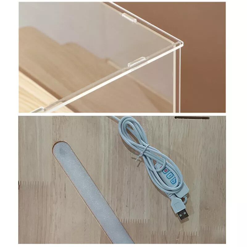Display case is equipped with light and USB cable, your collection will look more beautiful and in the dark under the warm light. Connect the power switch, the light will turns on.