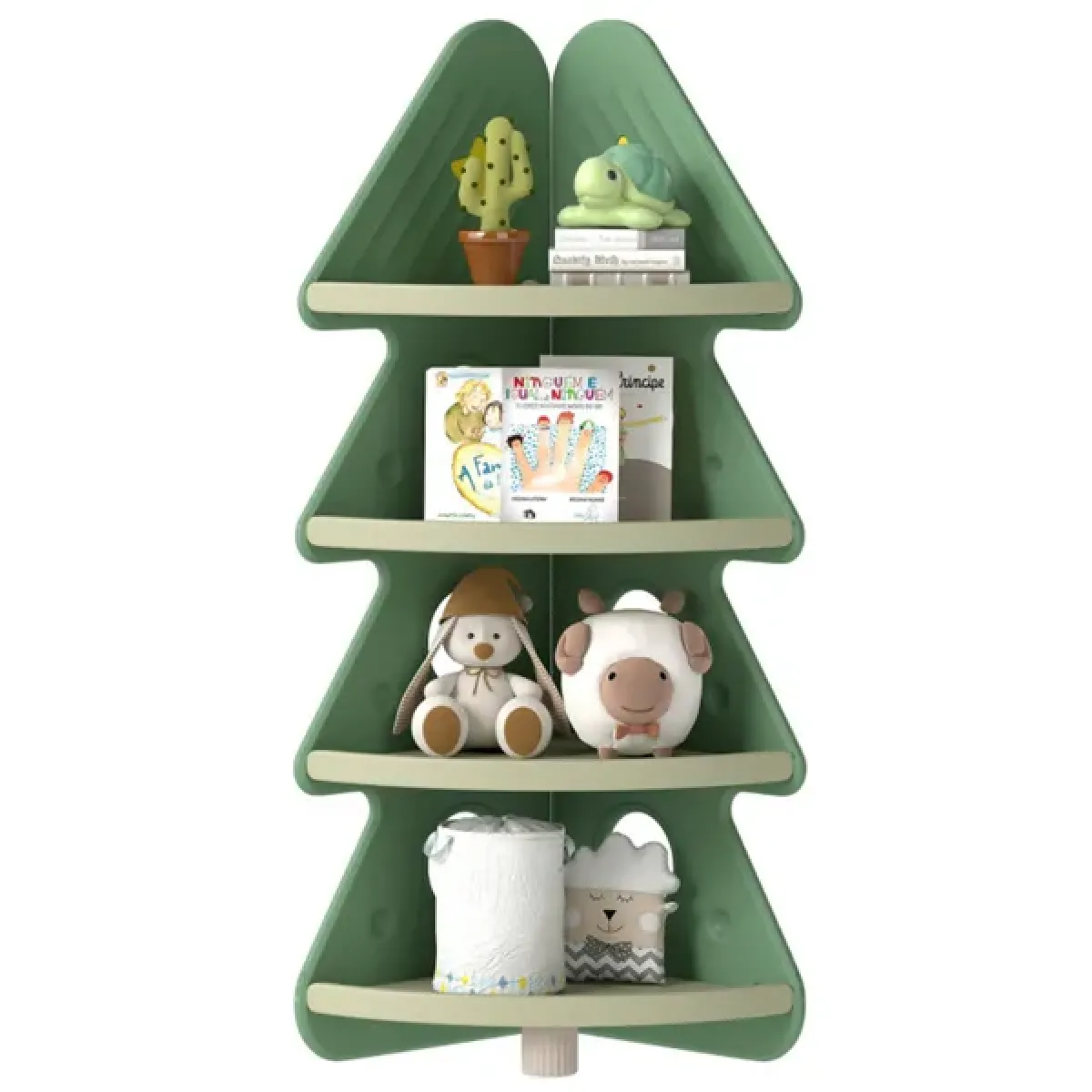 • Playful Christmas Tree Design: This enchanting 4-tier kids corner bookshelf features a unique Christmas tree silhouette and cheerful star patterns. It instantly brings holiday cheer to kid's room, making story time magical for children ages 3 and up. • Smart Multi-Tier Storage: 4 spacious tiers with 0.6" anti-falling guardrails provide the perfect place to organize picture books, toys, stationery, and decorations. It helps keep your child's space neat and tidy after every reading or play session. • Built for Safety: Built with safety as a top priority, the toddler book shelf features a stable triangular frame and thickened legs. All corners are smoothly rounded to prevent bumps, while the included anti-tipping kit adds extra security. • Space-Saving Corner Shelf: The space-saving corner bookshelf makes the most of any corner, freeing up valuable floor space while providing ample storage. Fully ASTM and CPSIA compliant, it offers safe and stylish organization for bedrooms, classrooms, daycare centers, and more. • Child-Friendly Height & Effortless Assembly: At a kid-accessible 49" height, little ones can easily reach their favorite books and toys all by themselves. Also, the toddler book shelf organizer only requires hassle-free assembly.