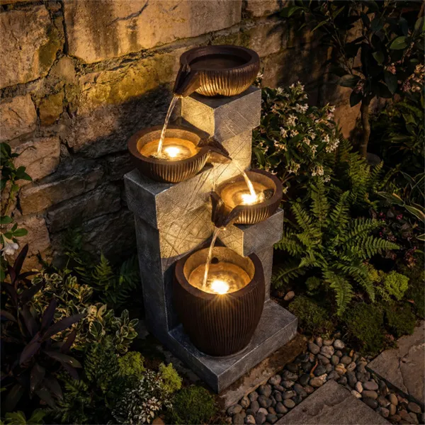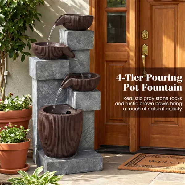 • Soothing Waterfall Sound: The waterfall fountain features a 4-tier cascading bowl design that offers a continuous, calming trickle, mimicking the sound of a real waterfall to add a serene and peaceful vibe to your outdoor space. • Enchanting LED Illumination: Equipped with 3 warm-white LED lights, this water fountain creates a soft, inviting glow that highlights the flowing water at night. It transforms your garden or porch into a captivating 24-hour attraction without extra lighting. • Versatile Location Flexibility: Thanks to its 9.5 ft power cord and 23.5 lbs lightweight body, this outdoor fountain can be effortlessly relocated from your patio to the indoor living room or office. It fits neatly in the compact 13" x 13" x 32" size, perfect for balconies and porches. • Reliable Resin and Fiberglass Construction: Crafted from reliable resin and fiberglass, the 4-tier pouring pot fountain ensures excellent weather resistance and long-lasting performance. Moreover, it offers a realistic stone-like look with gray rocks and rustic brown bowls, bringing a touch of natural beauty. • User-Friendly Operation: This patio decoration includes a pump for constant water circulation. Simply plug it in - no plumbing is necessary. Plus, the dial control offers customizable speeds from gentle to dynamic cascades, making it a safe and straightforward fountain perfect for any setting.
