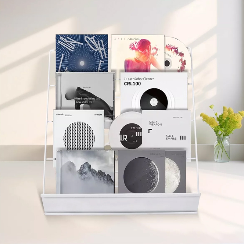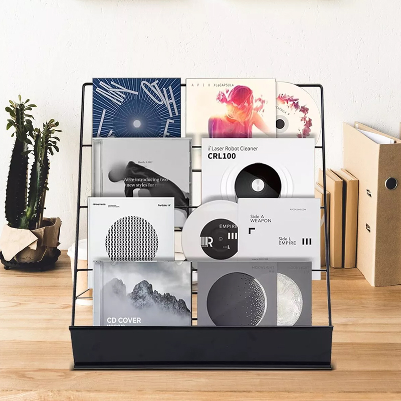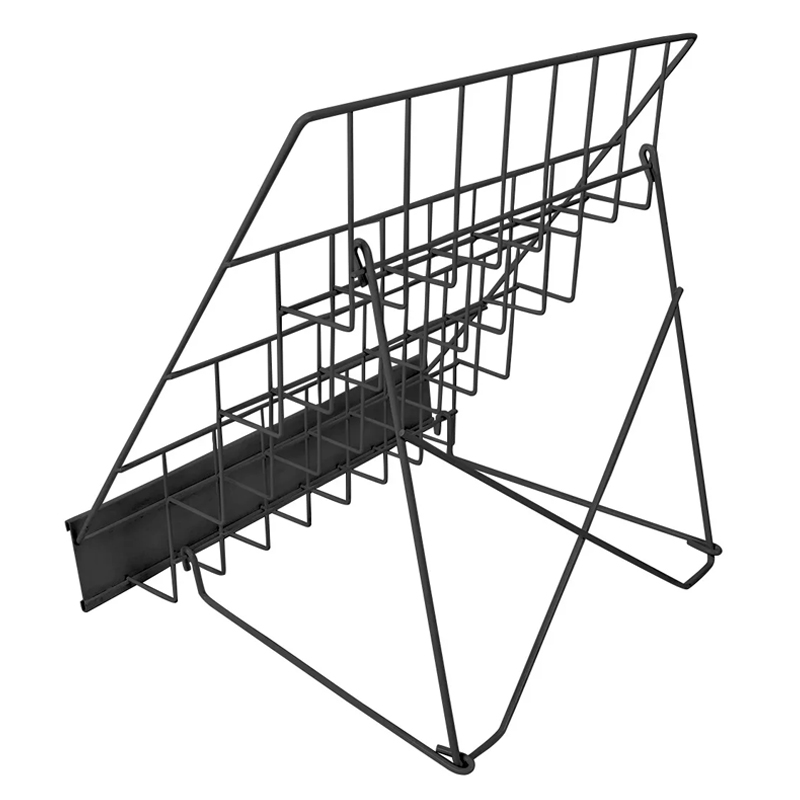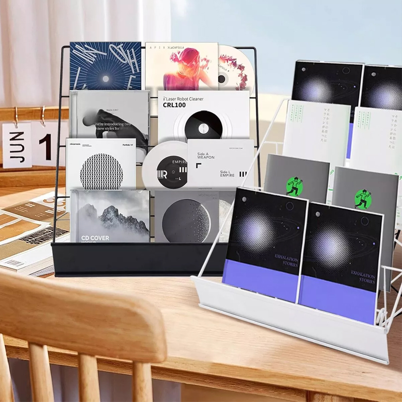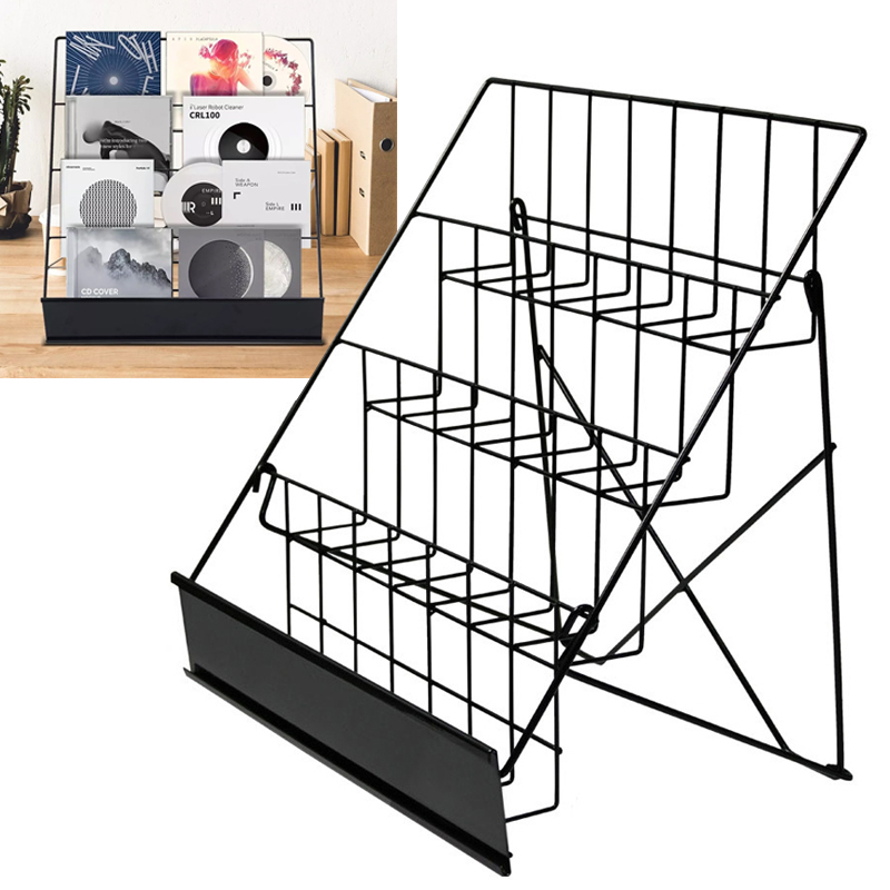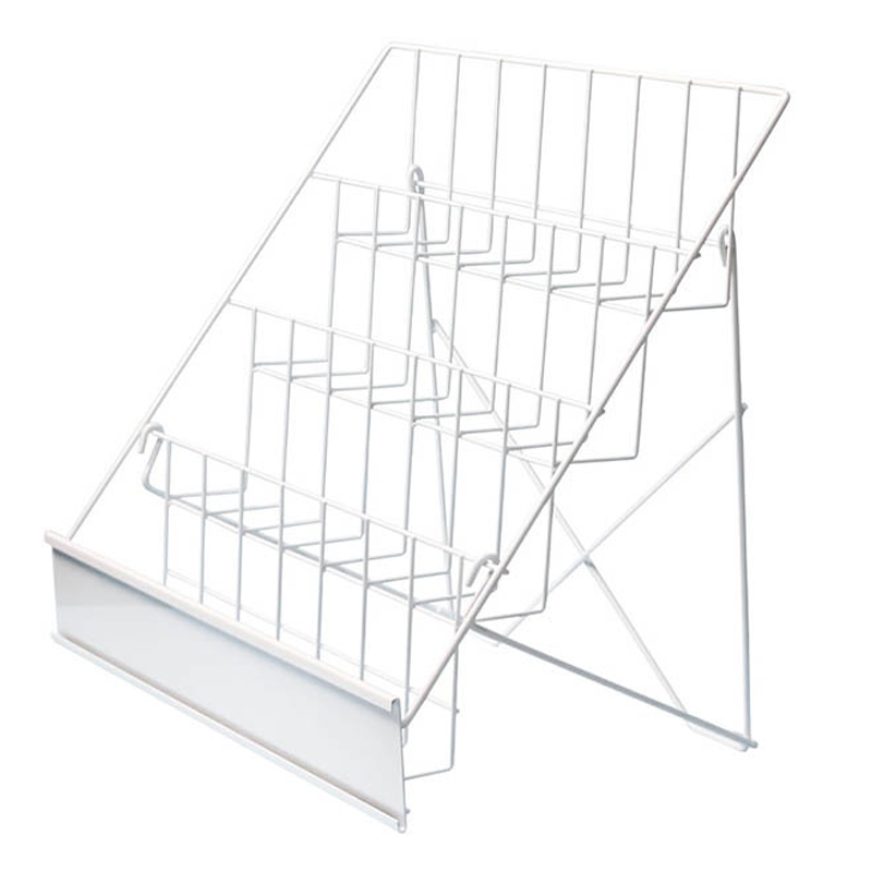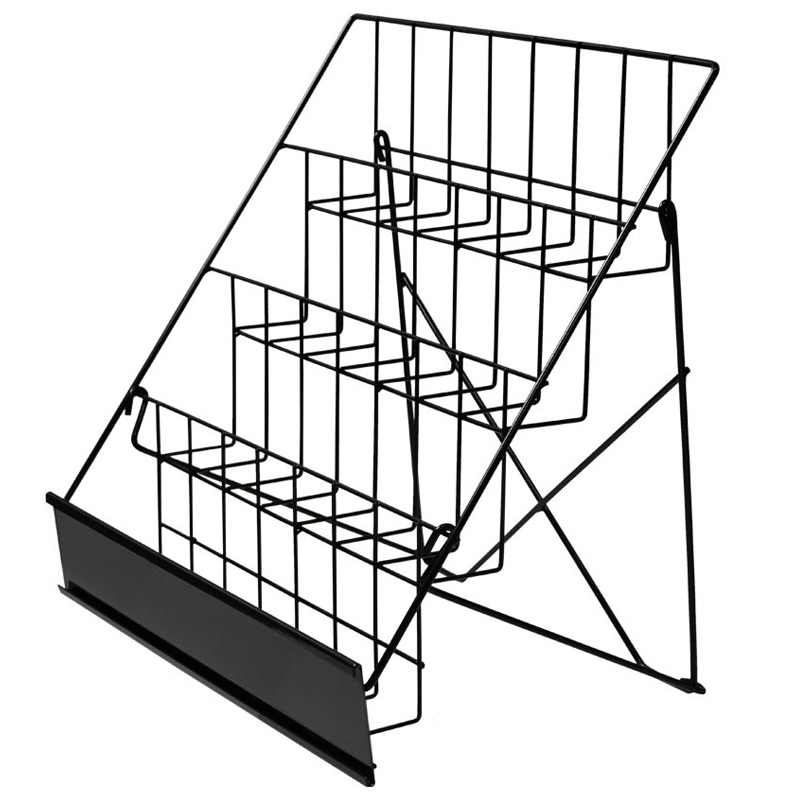 Counter size wire constructed stand which can hold DVDs, CD's or cards.