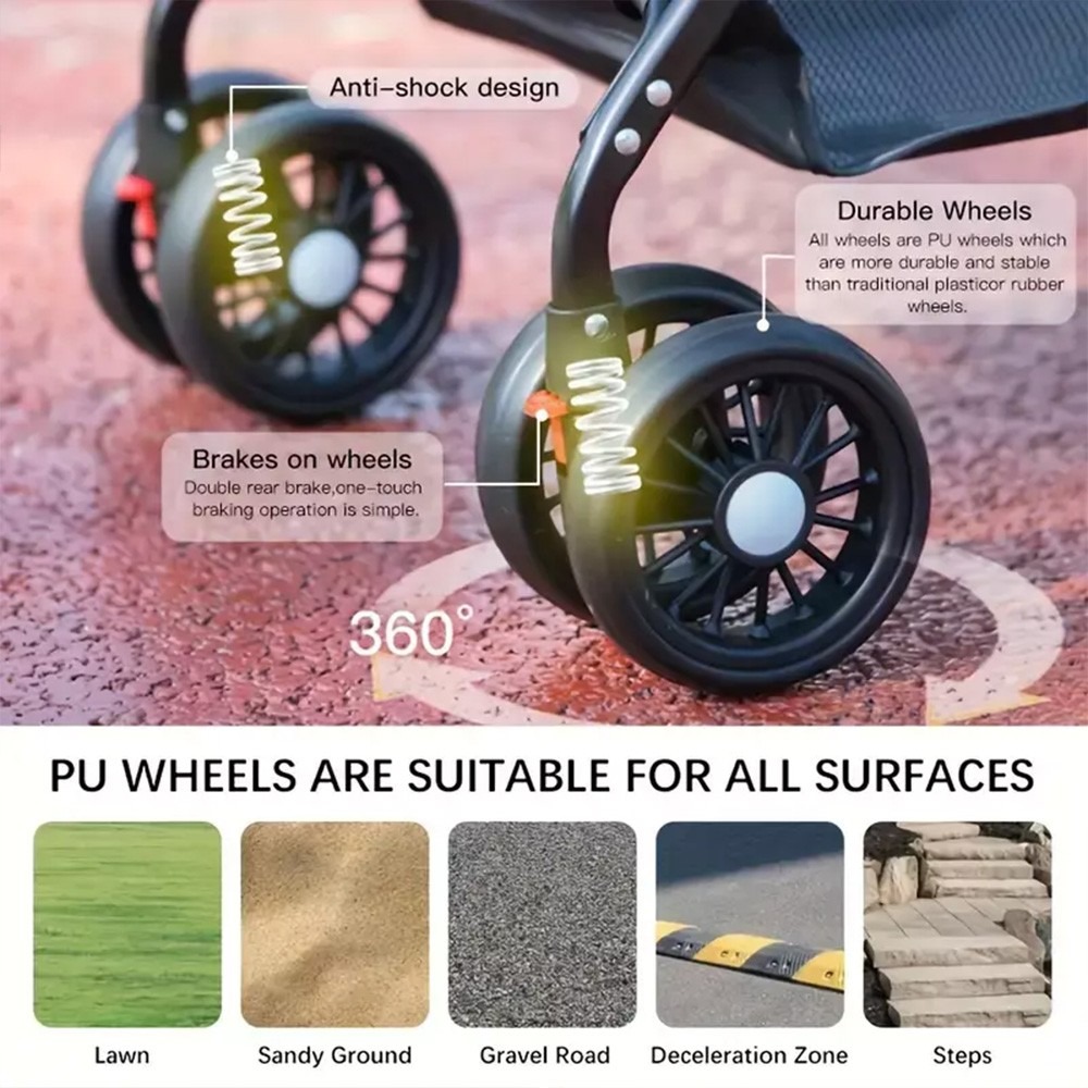 Safe and Stable: Built-in safety buckle and thick soft pet pad provide a comfortable and secure environment for your pet. 360° rotating wheels with shock absorption and brakes ensure safety and stability.