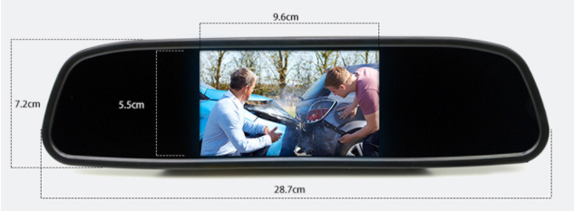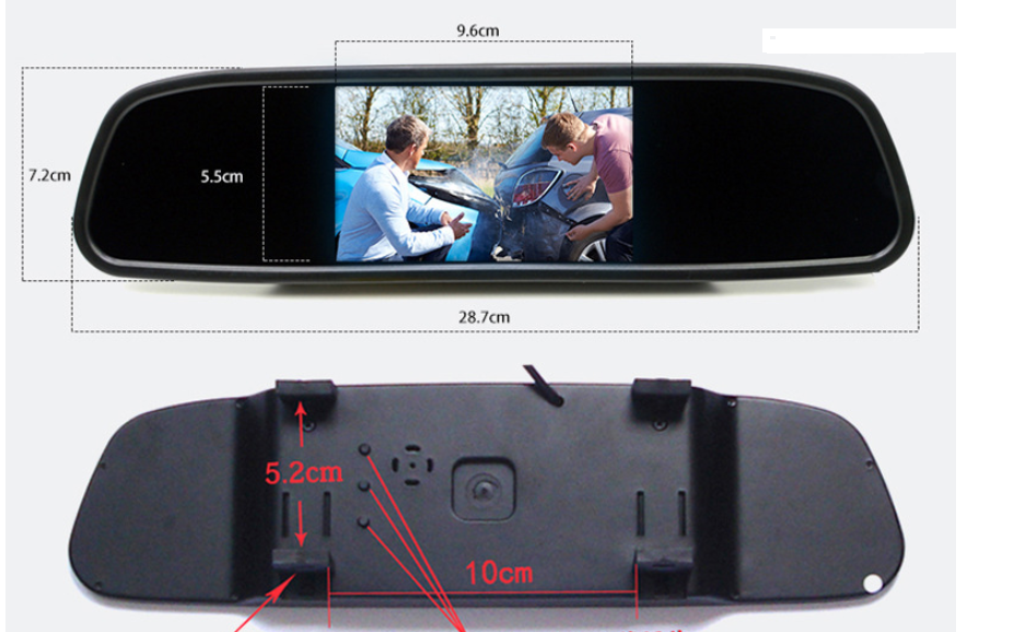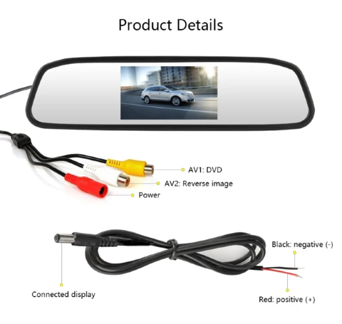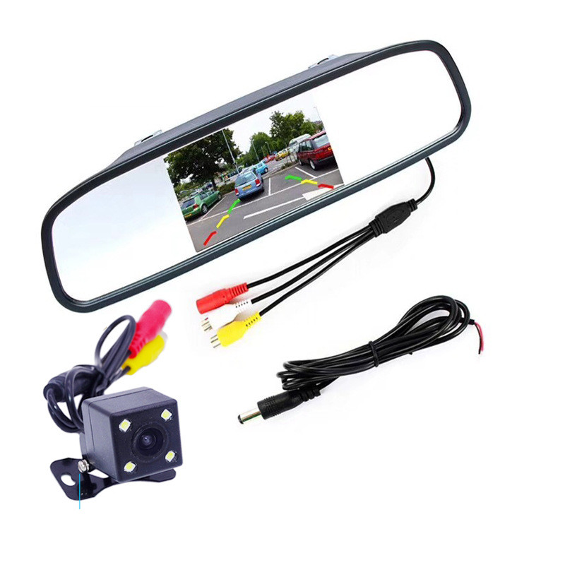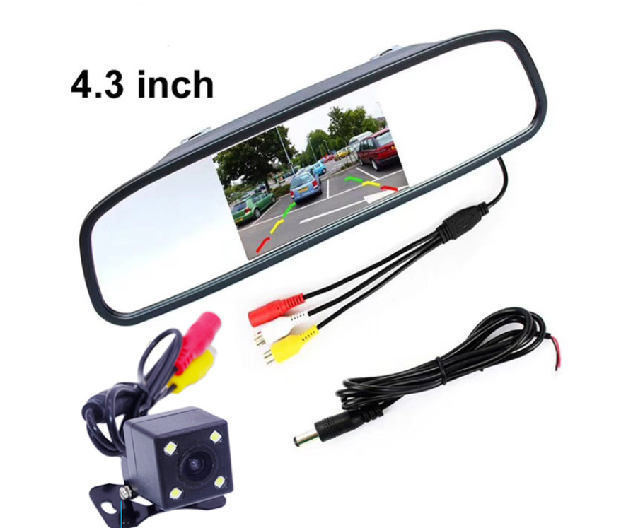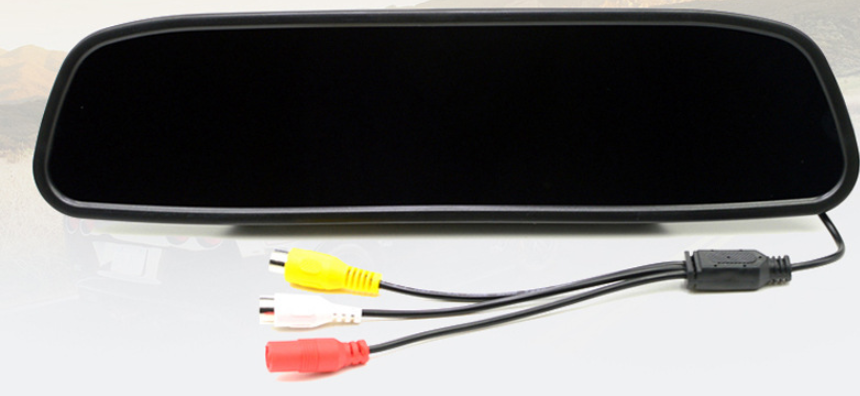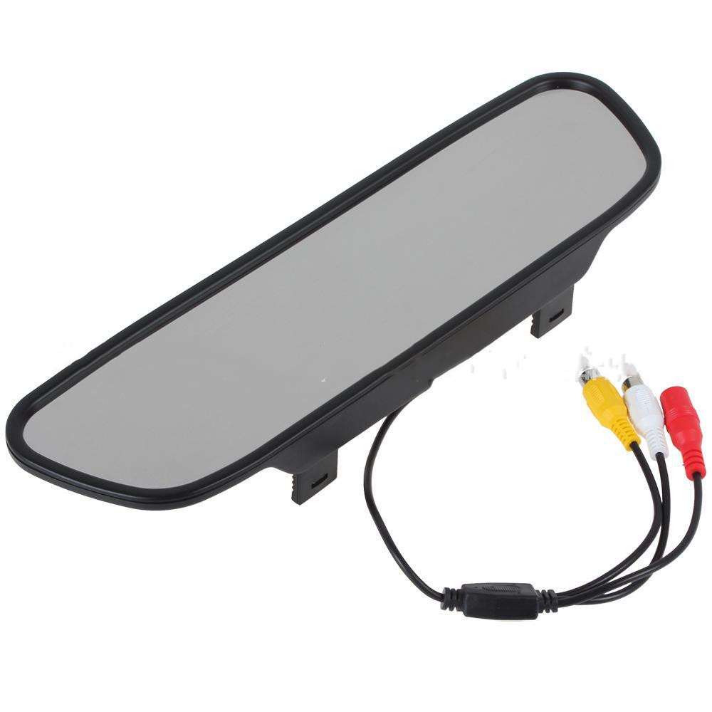 LCD monitor screen: This backup camera monitor has a 4.3 inch TFT LCD liquid crystal mirror monitor screen display and NTSC/PAL video system. B. ackup camera car H as a clip with universal dimensions built into the rearview mirror assembly. You can also connect 2 video sources
