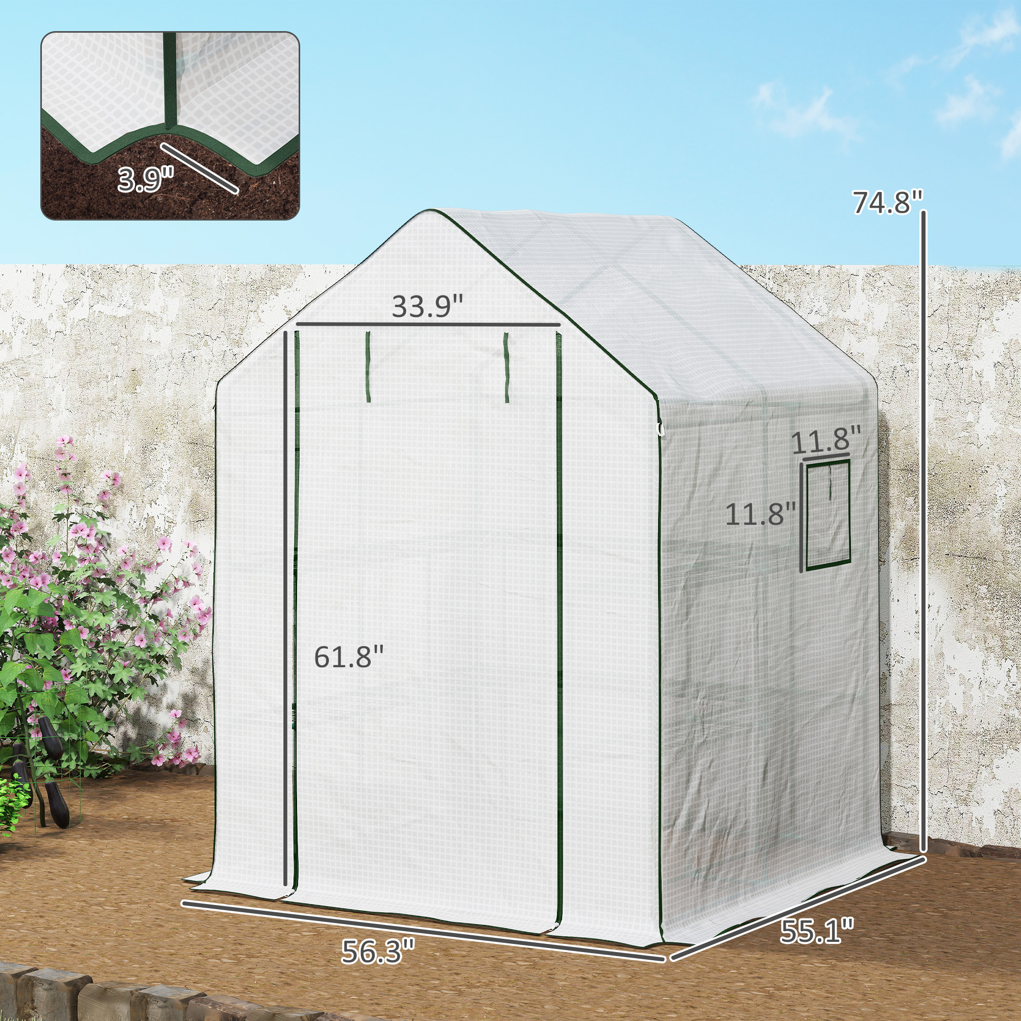 - Portable Garden Greenhouse Info: Overall Dimensions: 55" W x 56.25" D x 74.75" H. Door Size: 33.75" W x 61.75" H. Window Size: 11.75" W x 11.75" H. Assembly required.